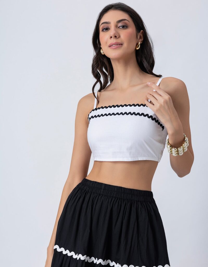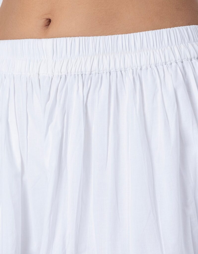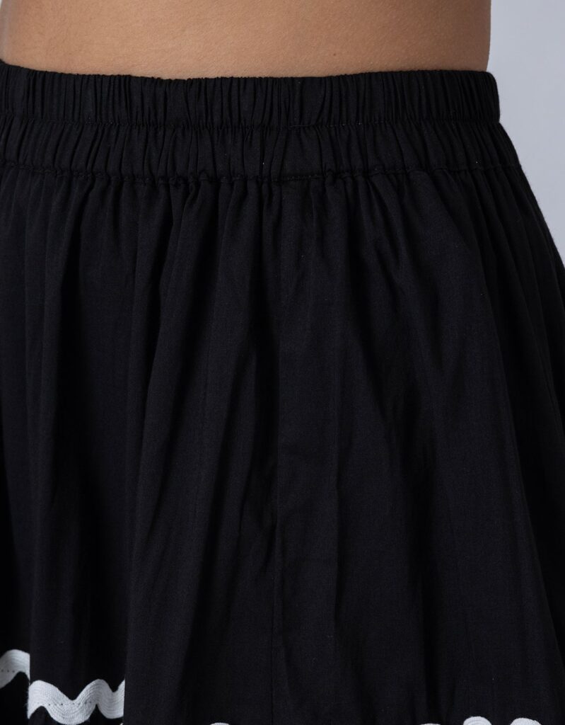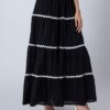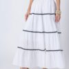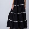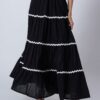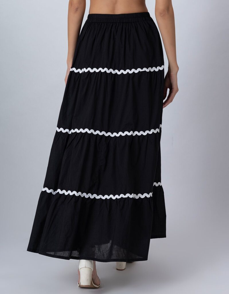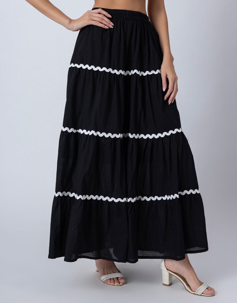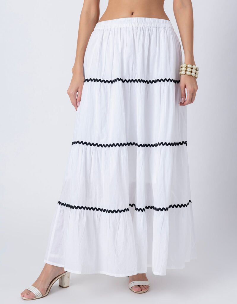 Features: This 3-tiered ankle-length skirt features zigzag lace detailing, an elastic waist for comfort, and a relaxed fit, making it a perfect flowy summer cotton skirt for effortless style.