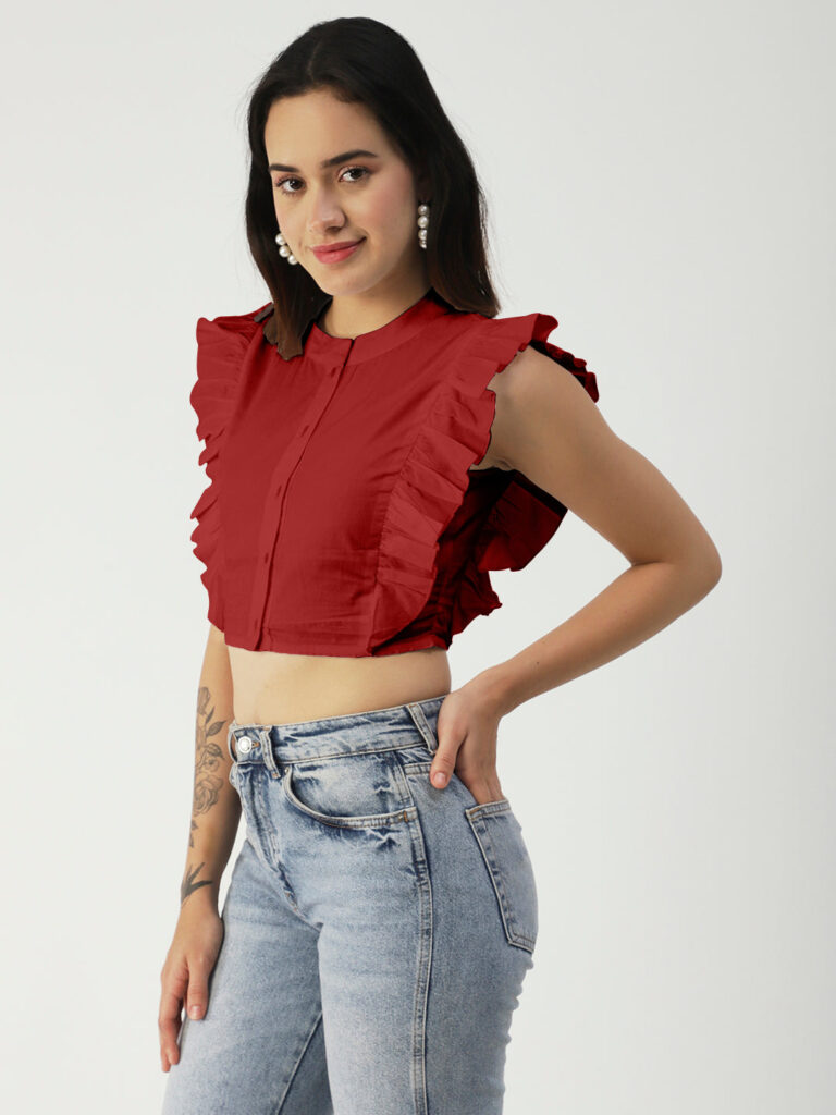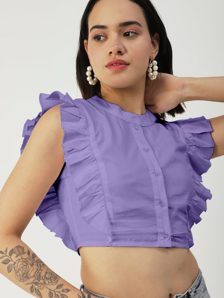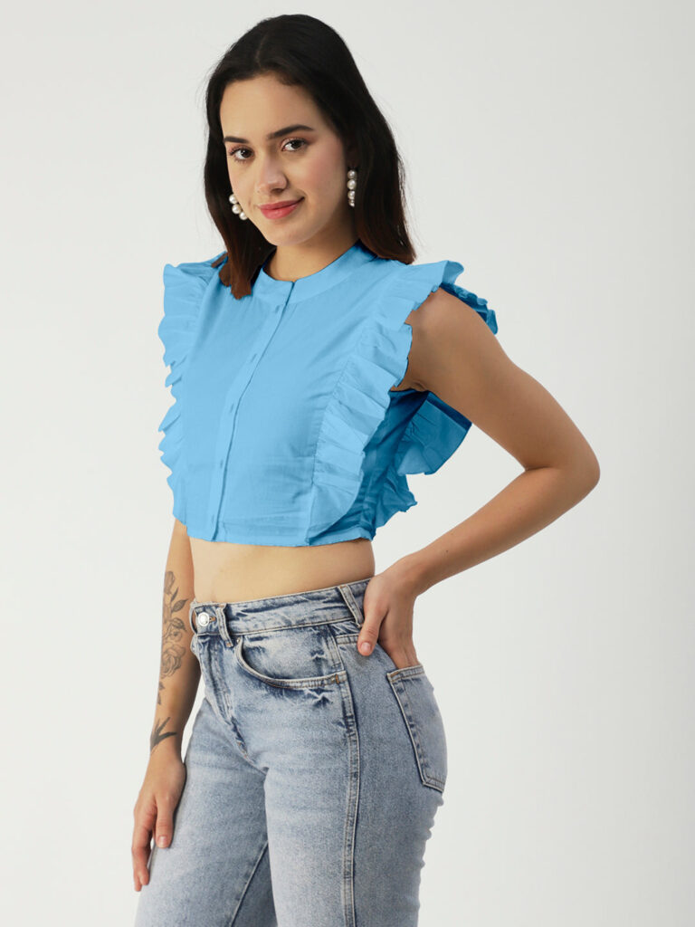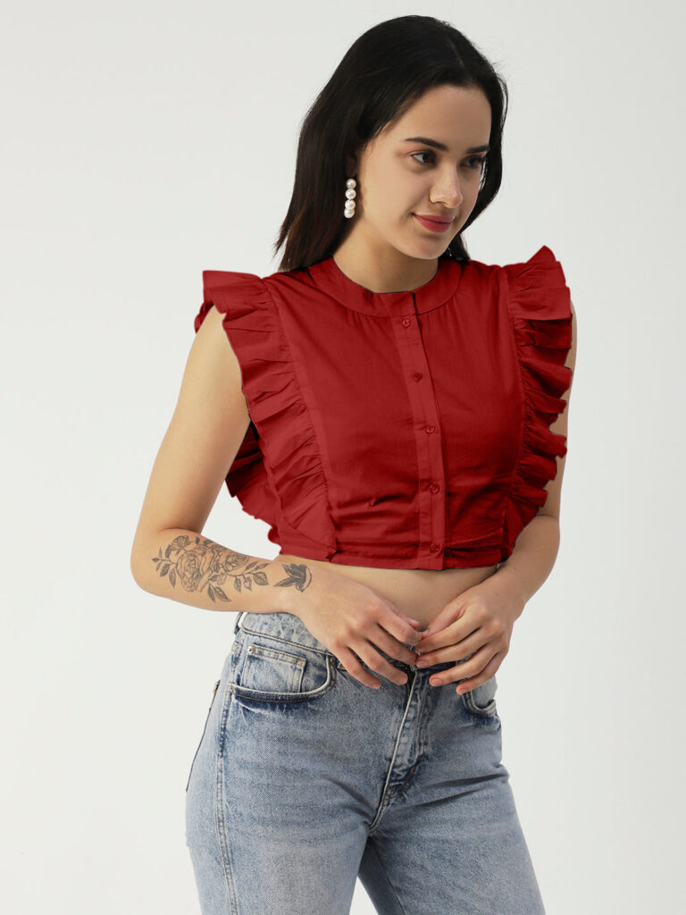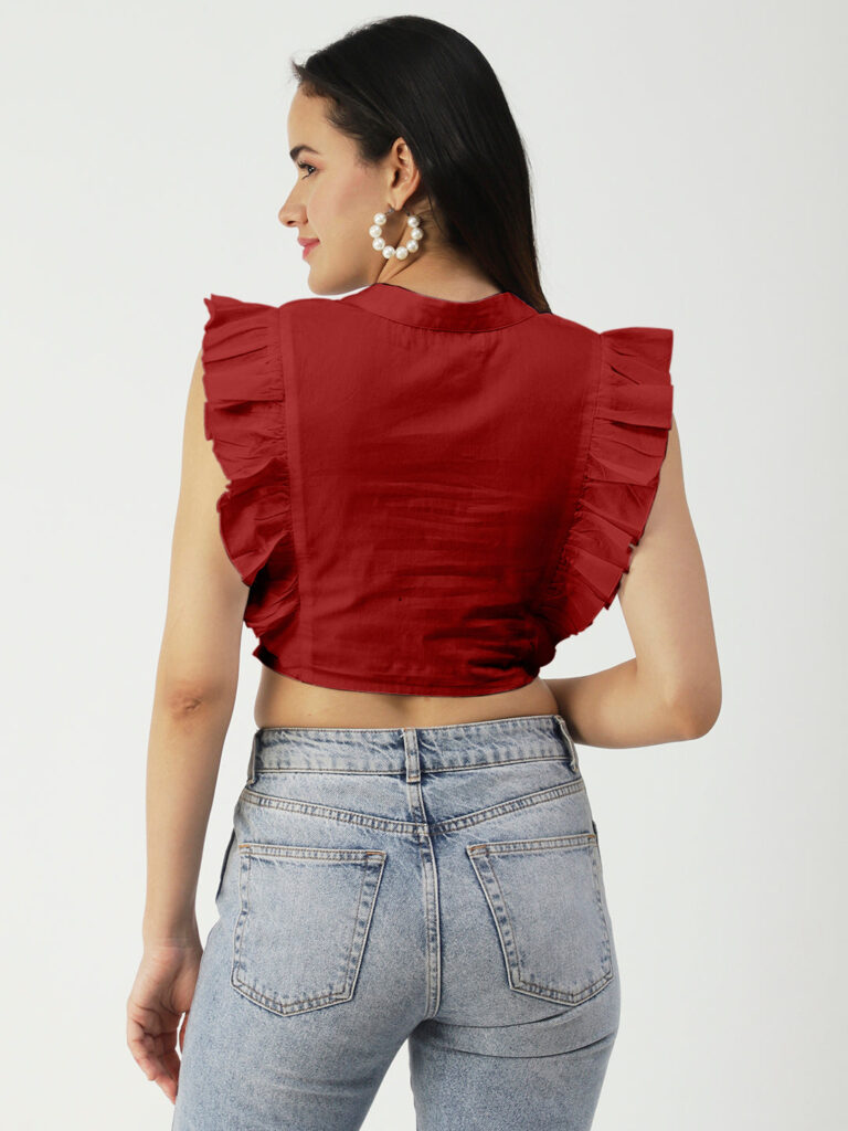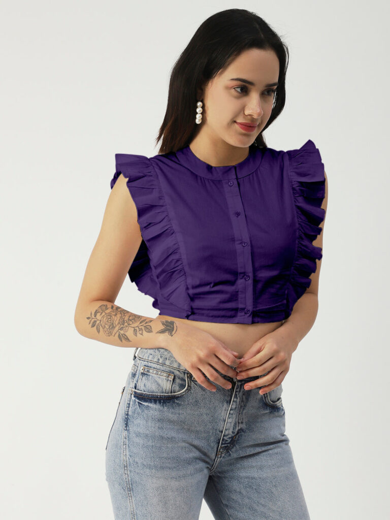 Features: round neck, frilled sleeves, button down, cropped length, lightweight and solid pattern
