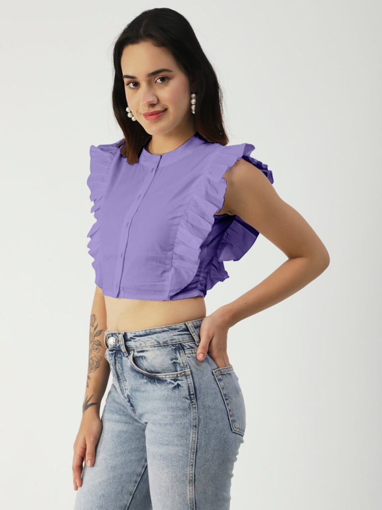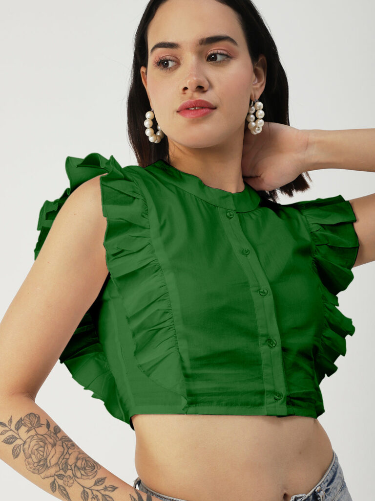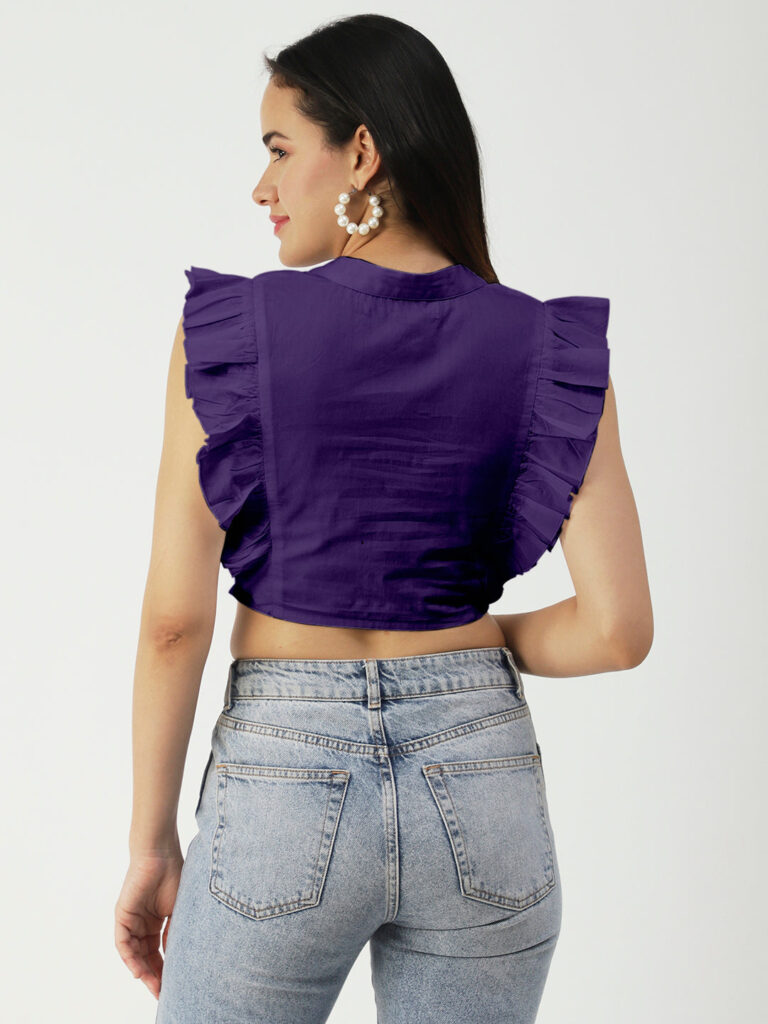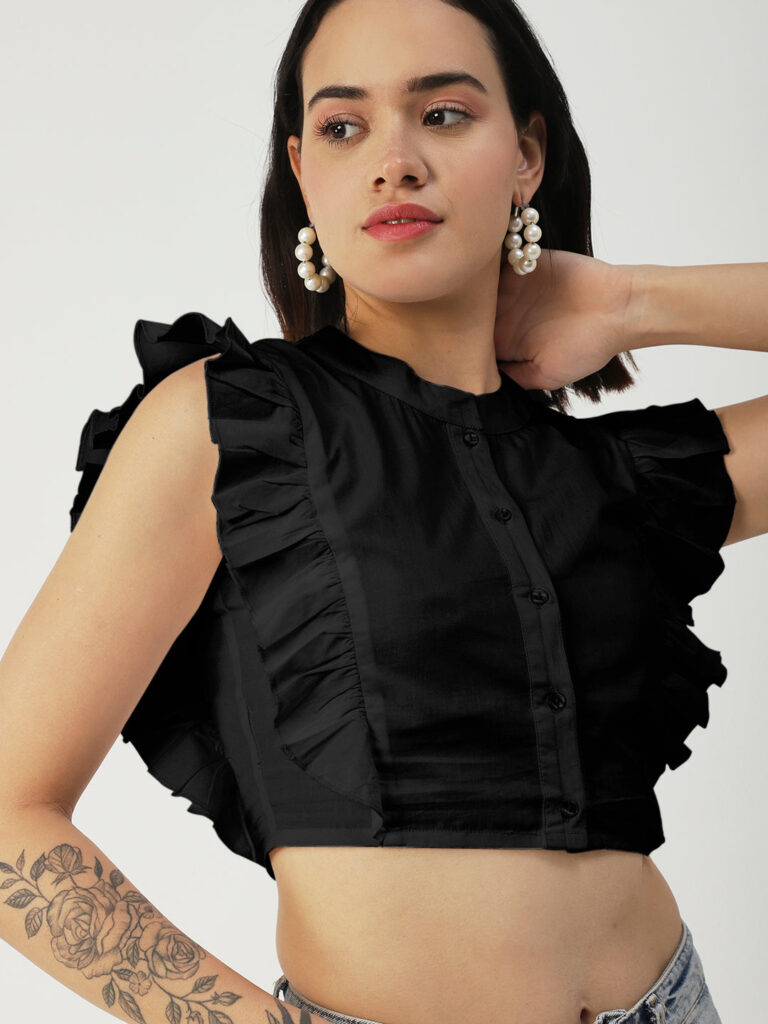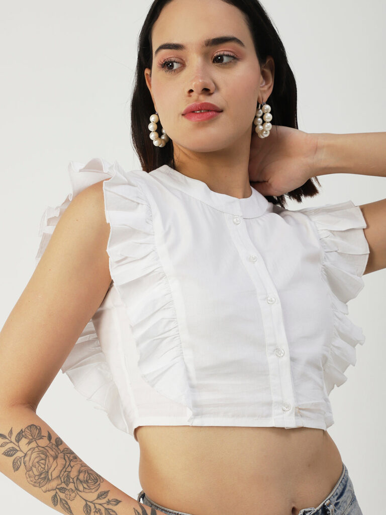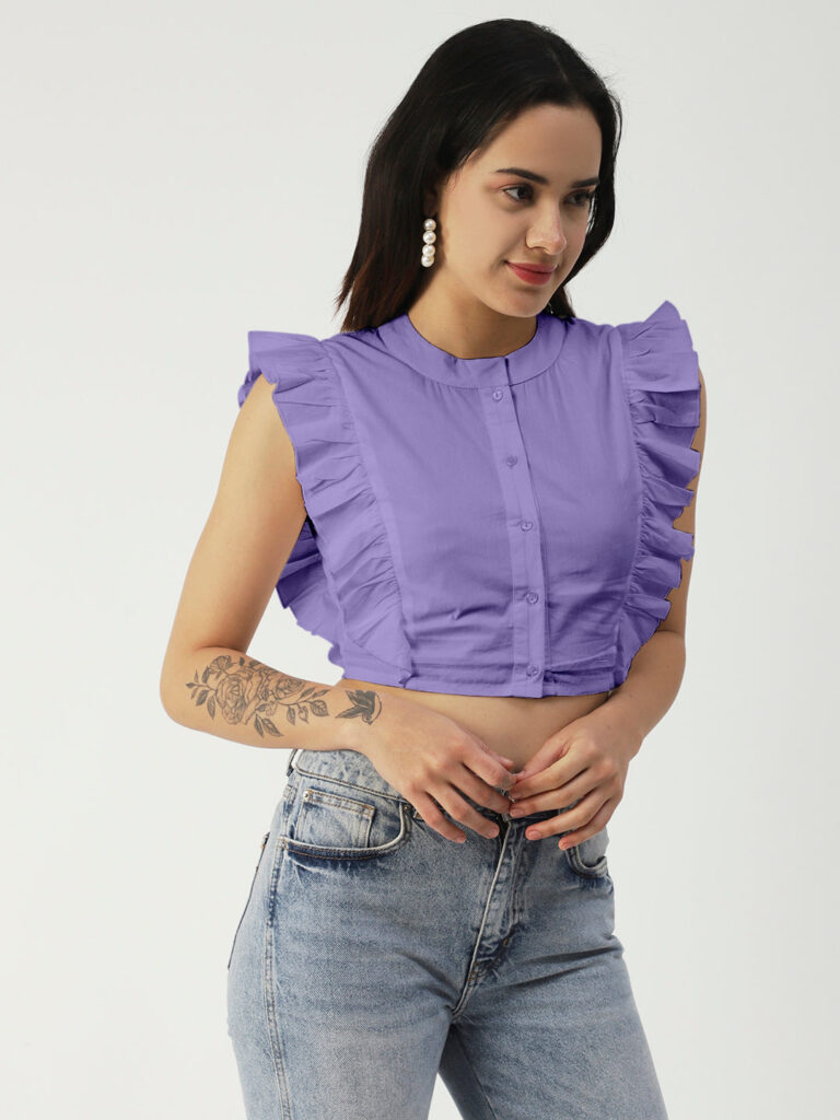 Features: round neck, frilled sleeves, button down, cropped length, lightweight and solid pattern