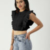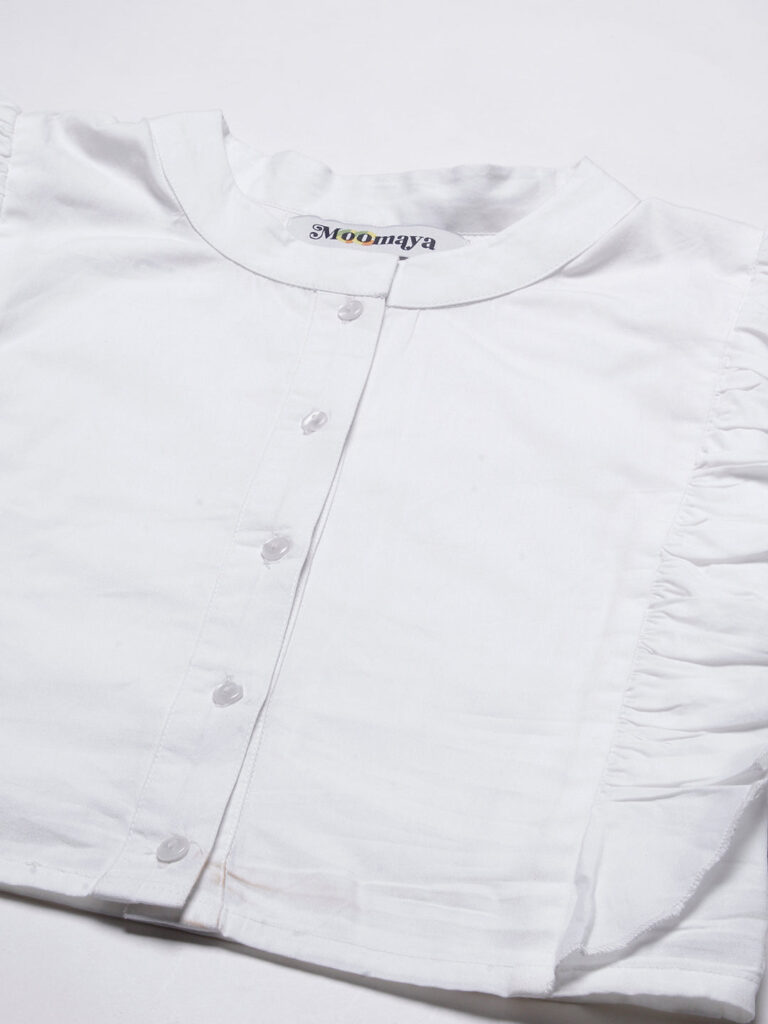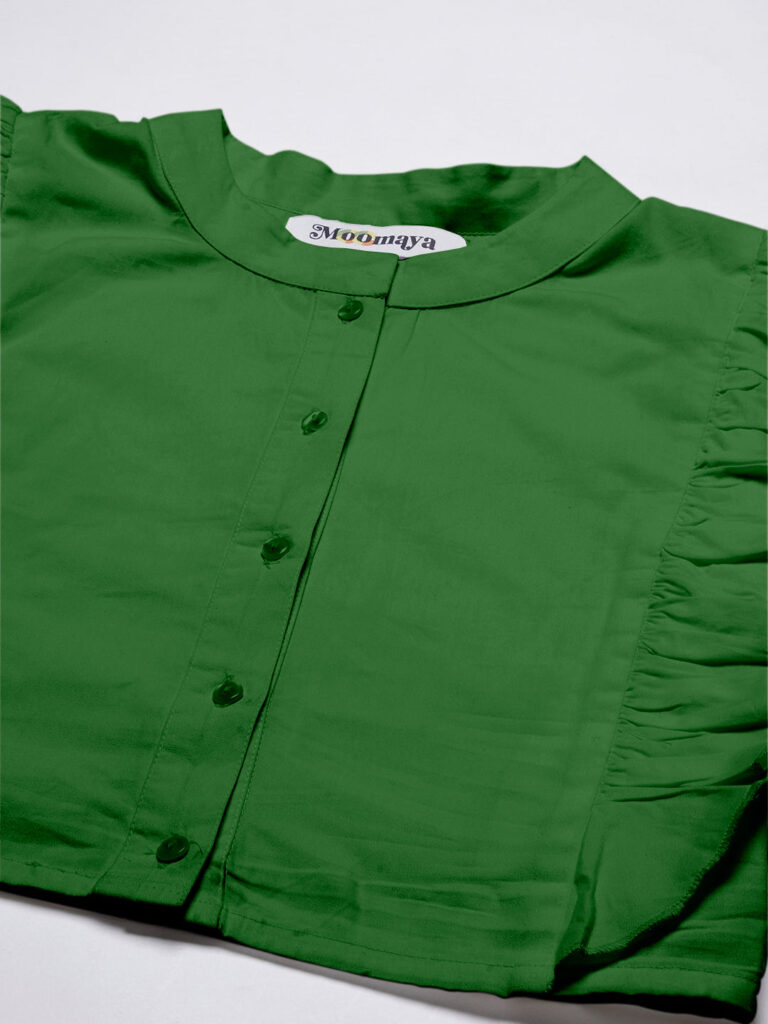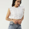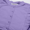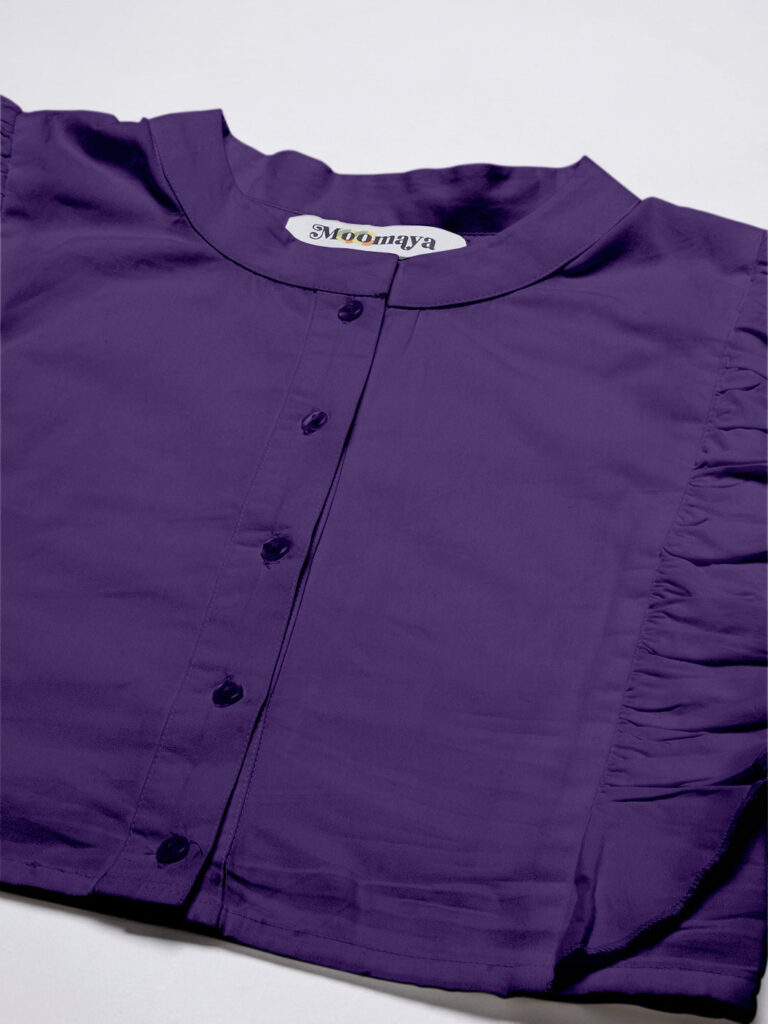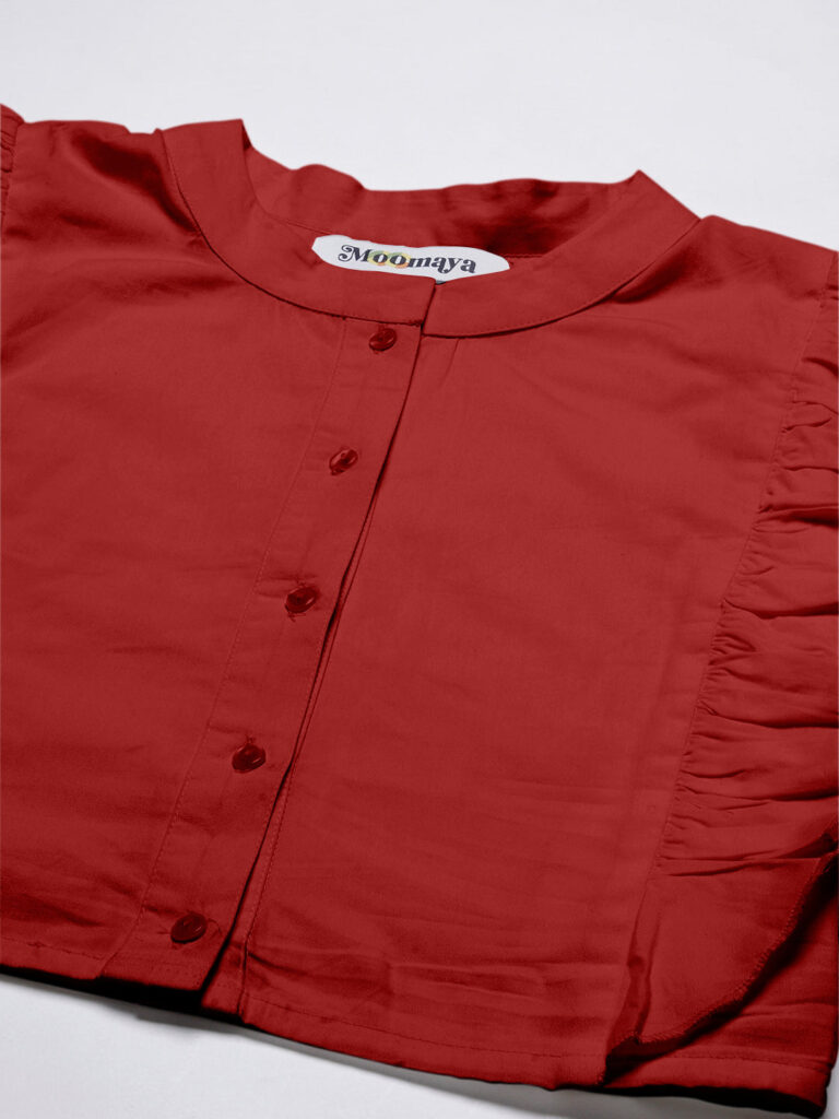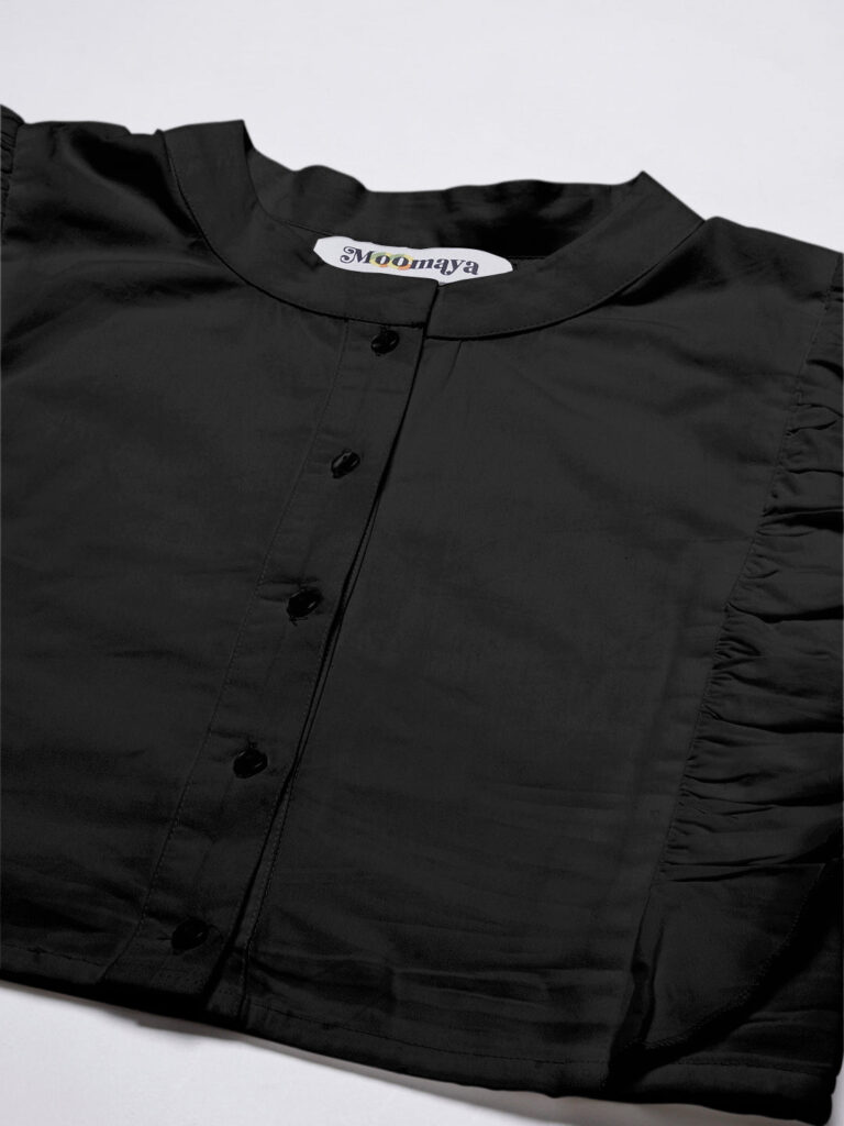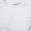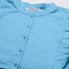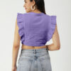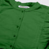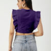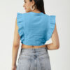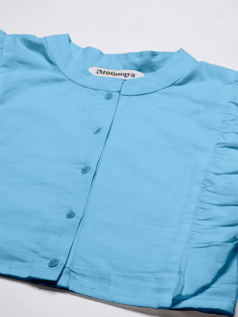 Features: round neck, frilled sleeves, button down, cropped length, lightweight and solid pattern