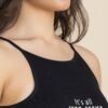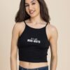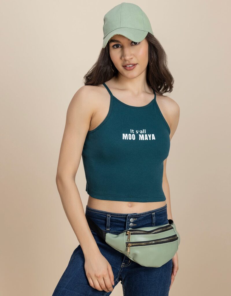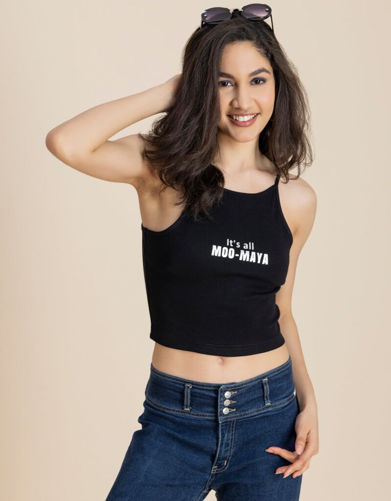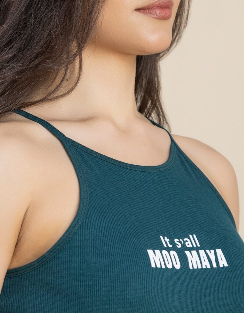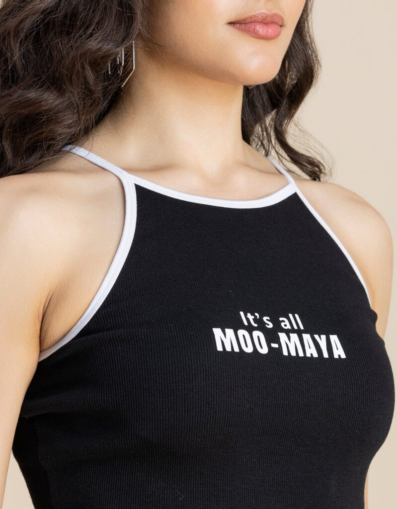 Features: Round Neck, Crop Length Top, Sleeveless, Opaque, Lightweight, Fit Top, With Quote That Reads “It’s All Moo-Maya”