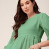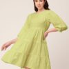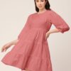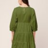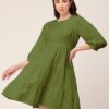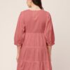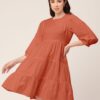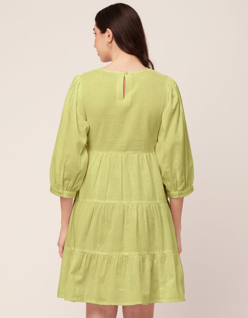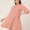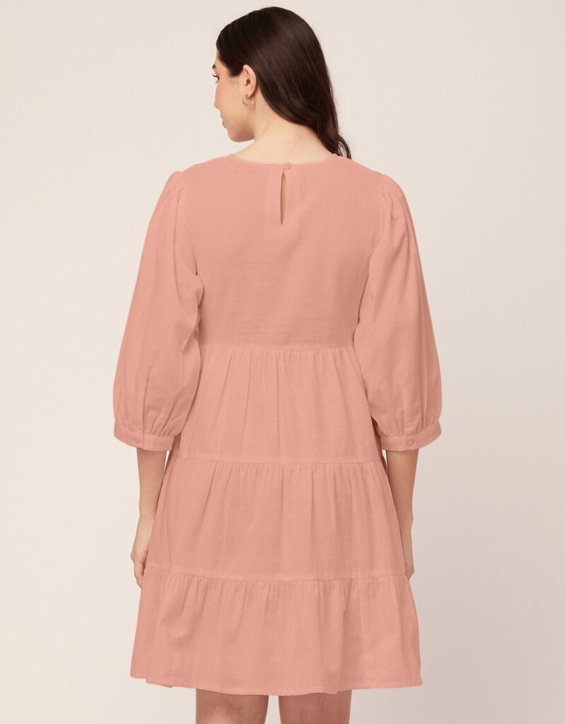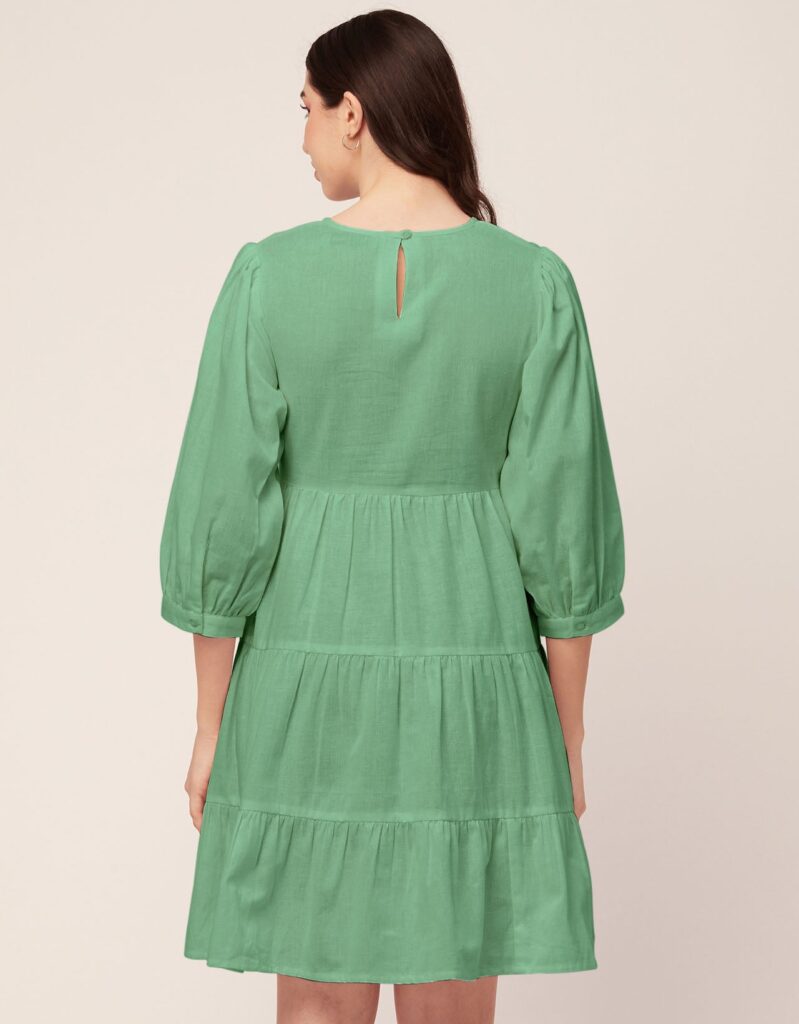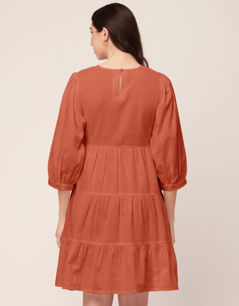 Features: Side Zipper Round Neck Tiered Hem Back Button Closure Quarter Sleeves Knee Length Lightweight And Solid Colors.
