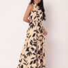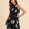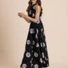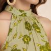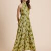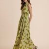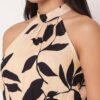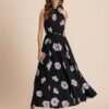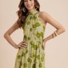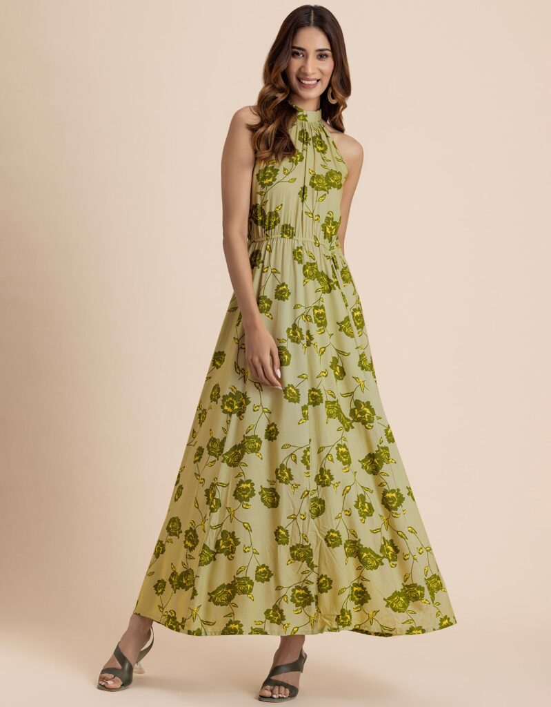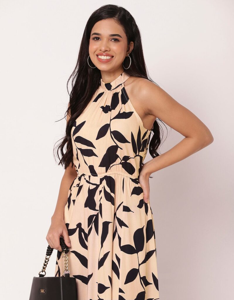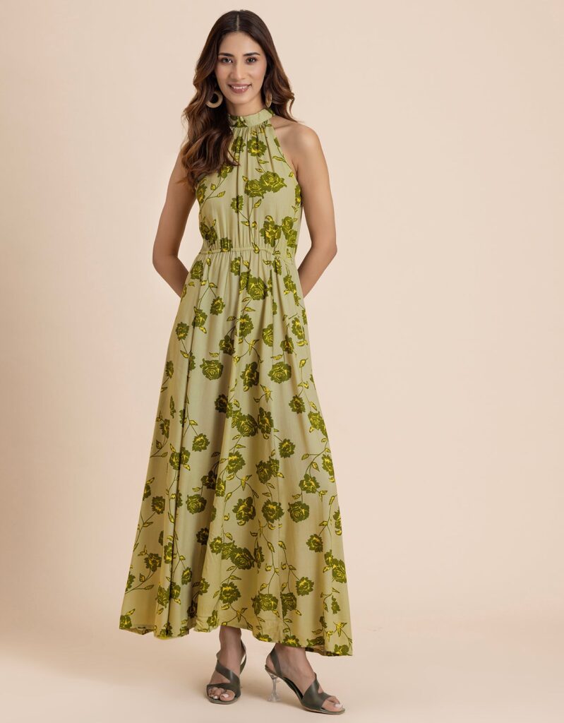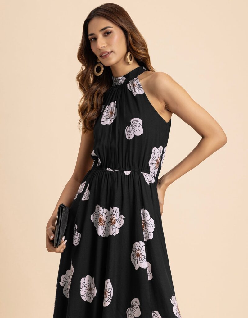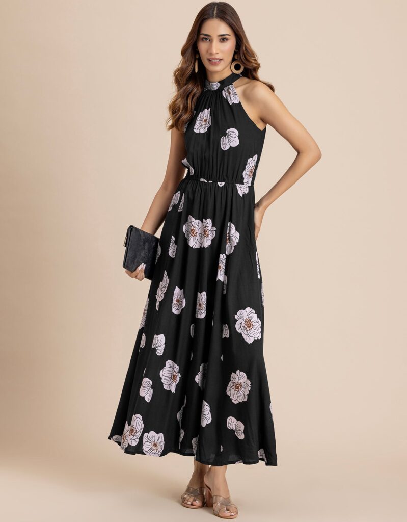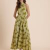Features: Halter neck, fit and flare, maxi dress, concealed zipper, keyhole at back, lightweight, regular fit, resort dress, and all over printed pattern