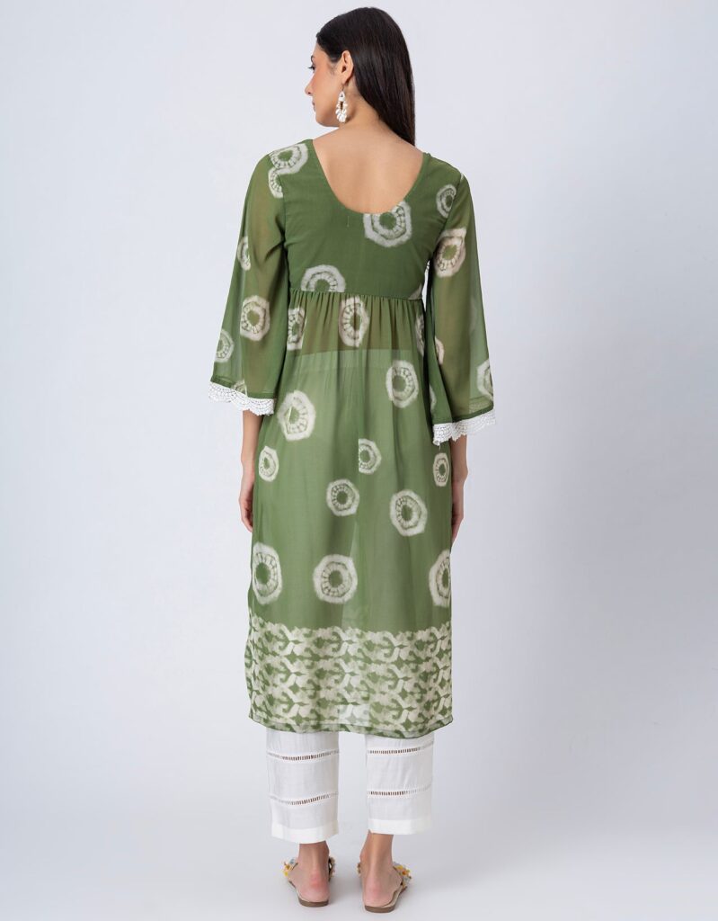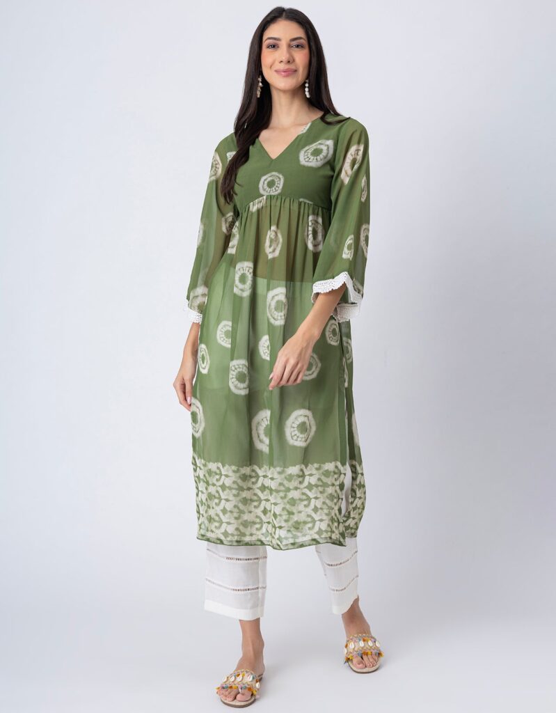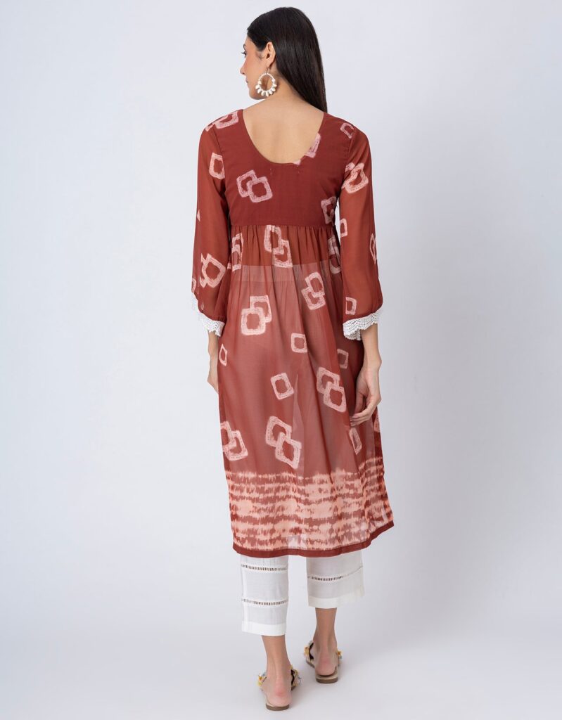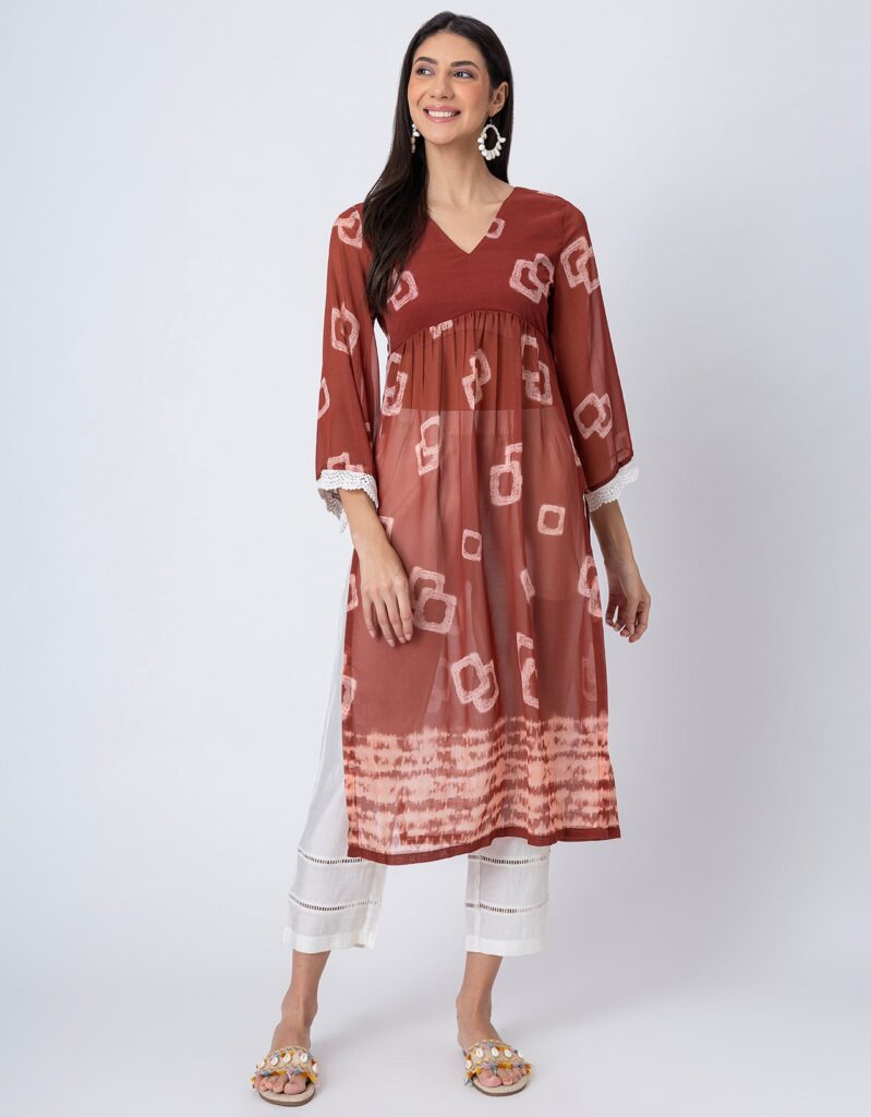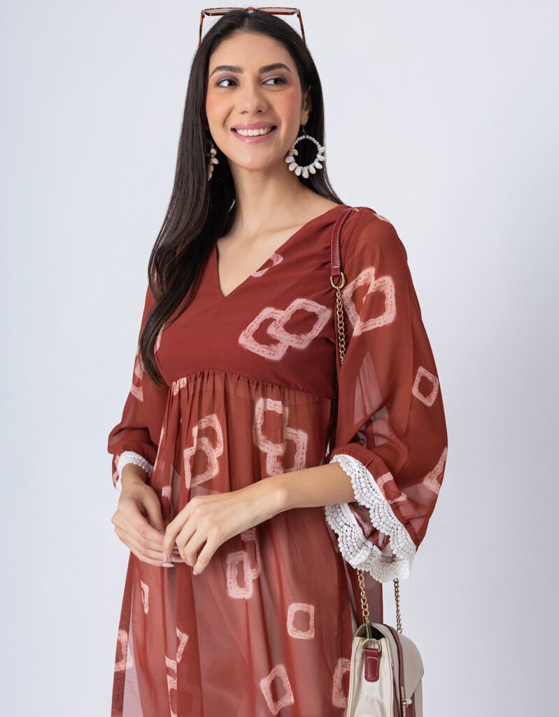 Features: This Tie-Dye Print Sheer Kurta and Pant Set features a V-neck sheer kurta with delicate lace detailing on long bell sleeves, gathers at the waist, and elegant side slits, paired with lace-accented half-lined pants that have an elastic waist and convenient pockets for added comfort.
