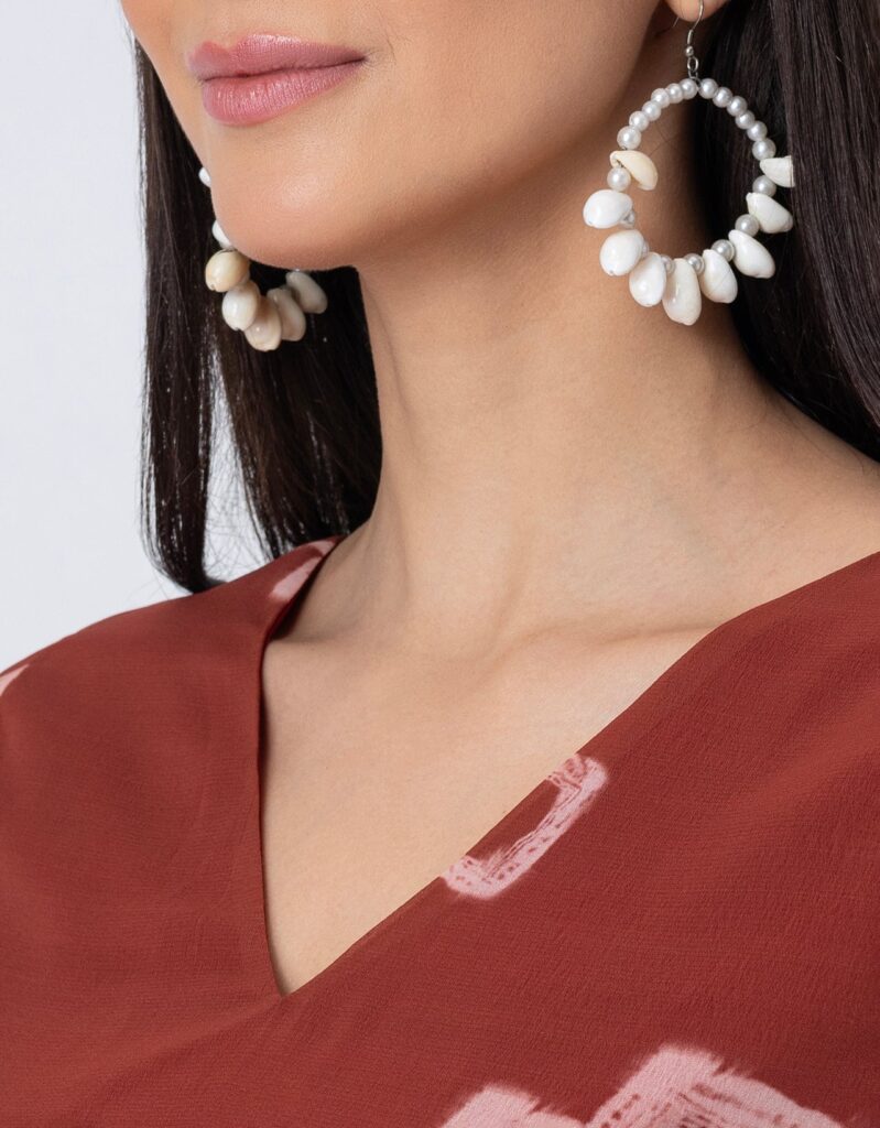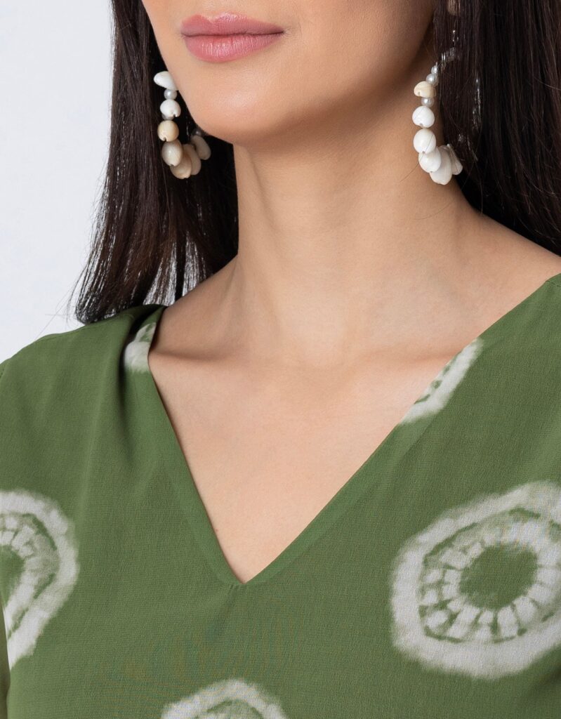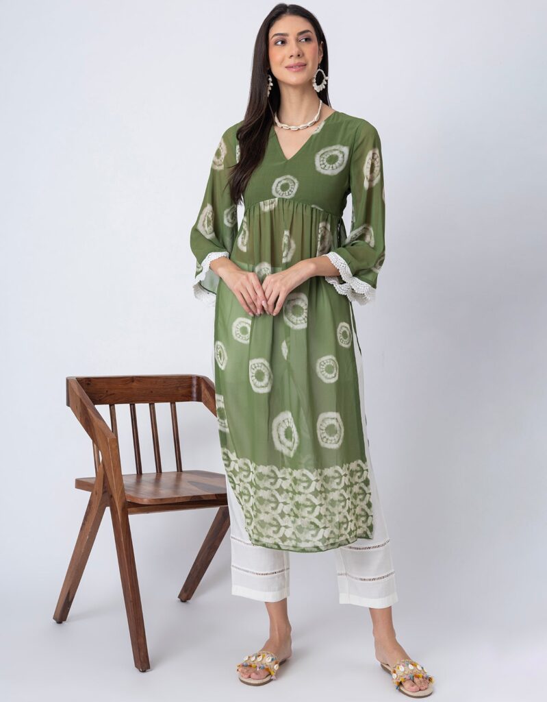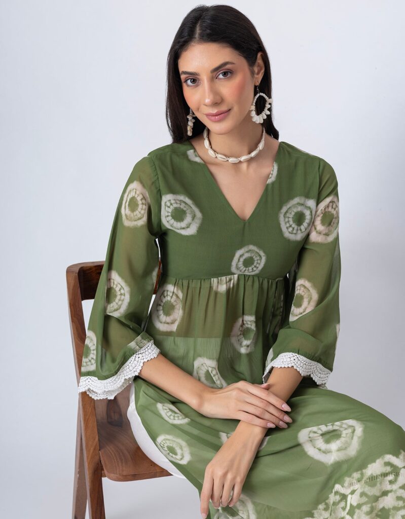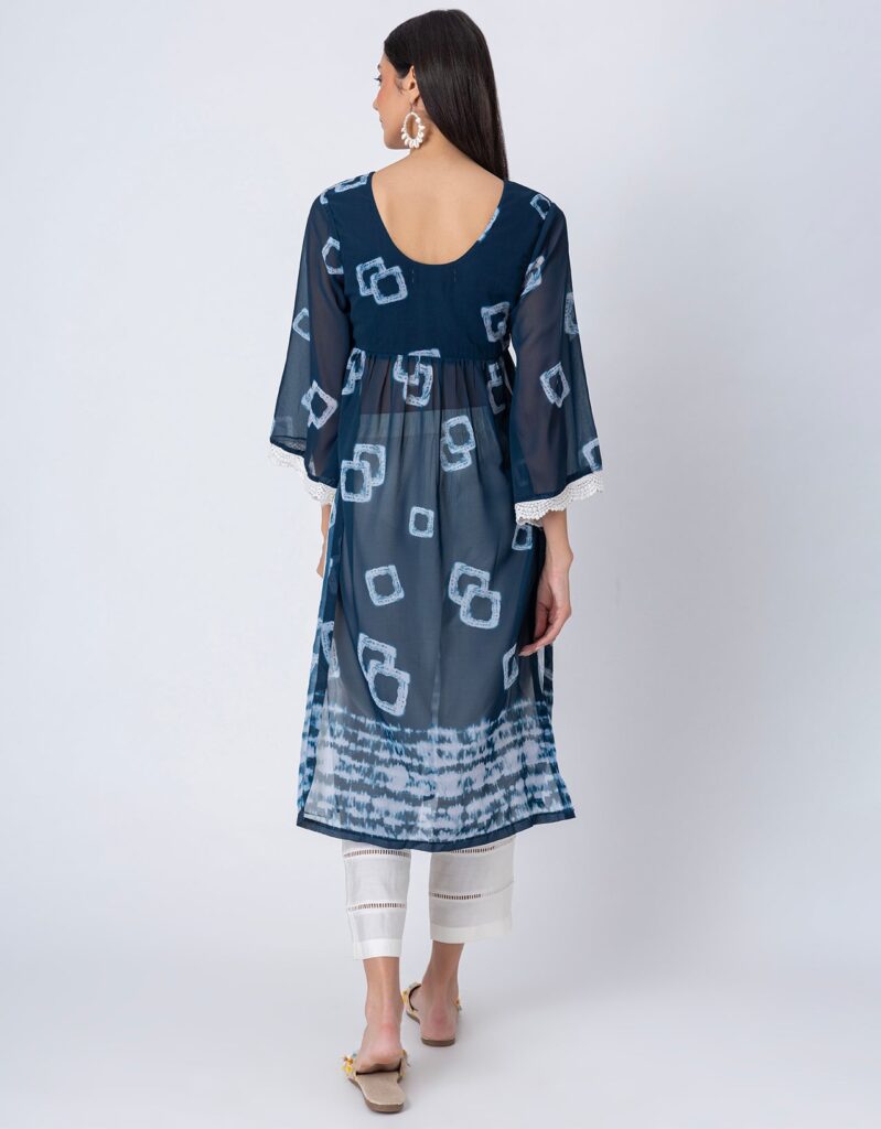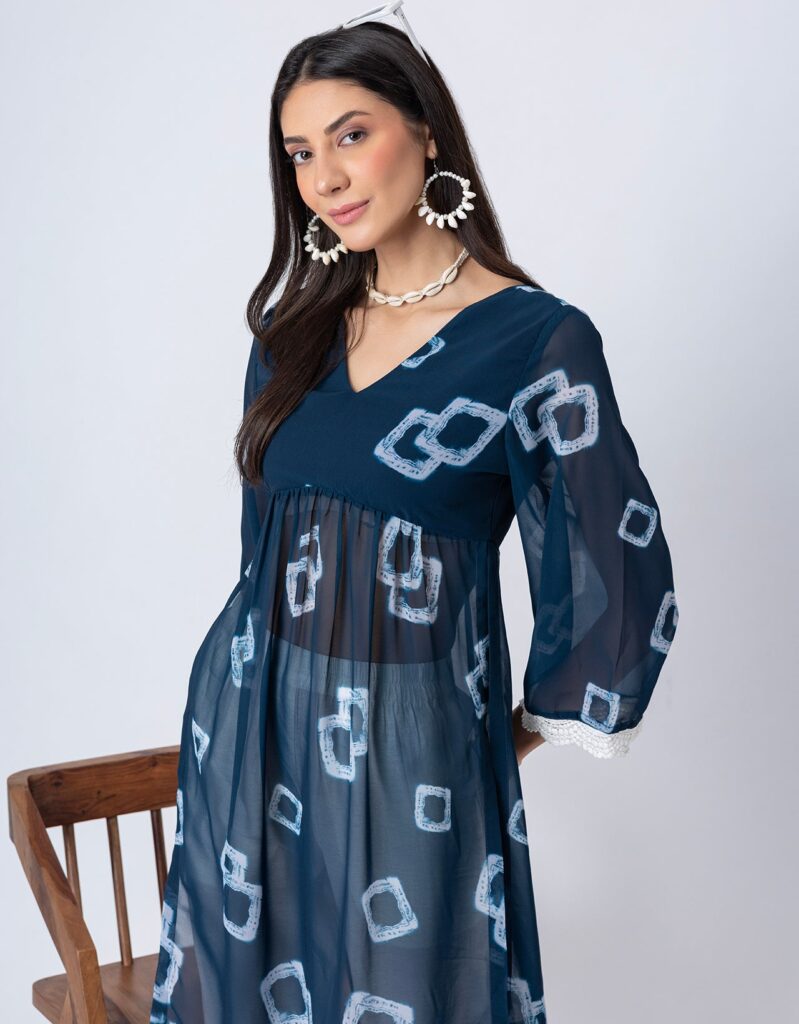 Features: This Tie-Dye Print Sheer Kurta and Pant Set features a V-neck sheer kurta with delicate lace detailing on long bell sleeves, gathers at the waist, and elegant side slits, paired with lace-accented half-lined pants that have an elastic waist and convenient pockets for added comfort.