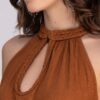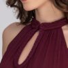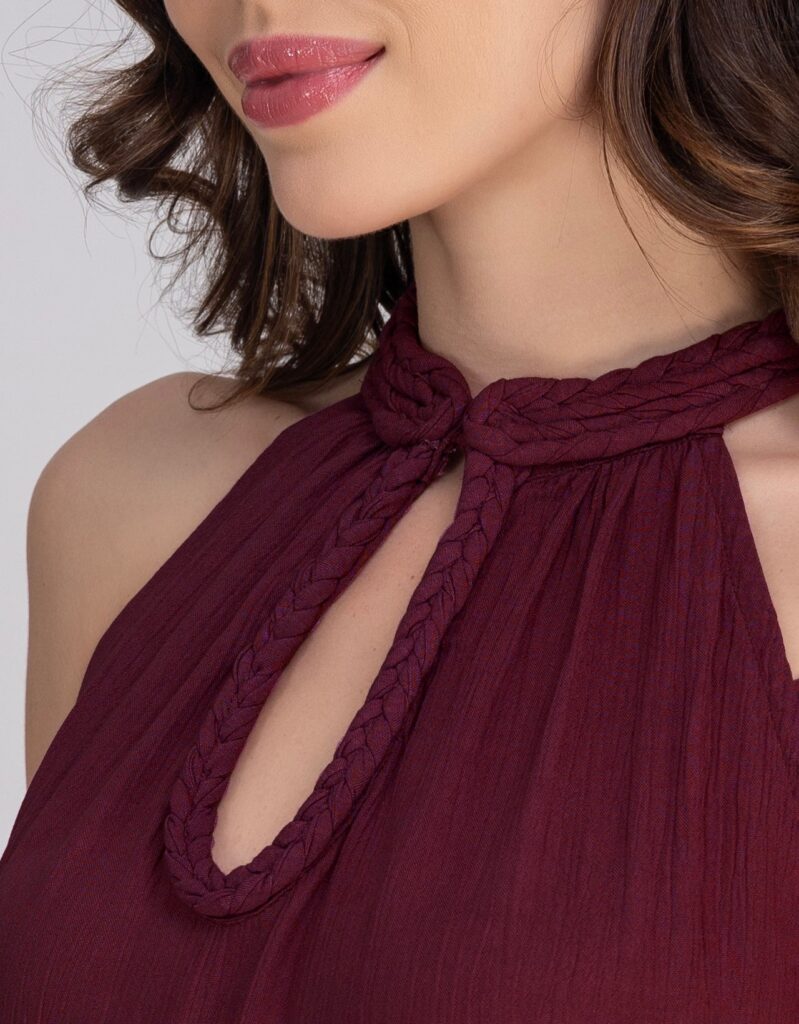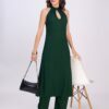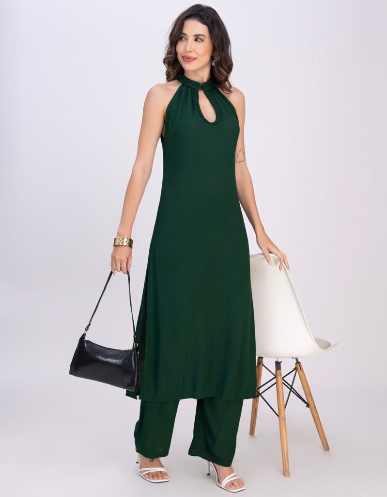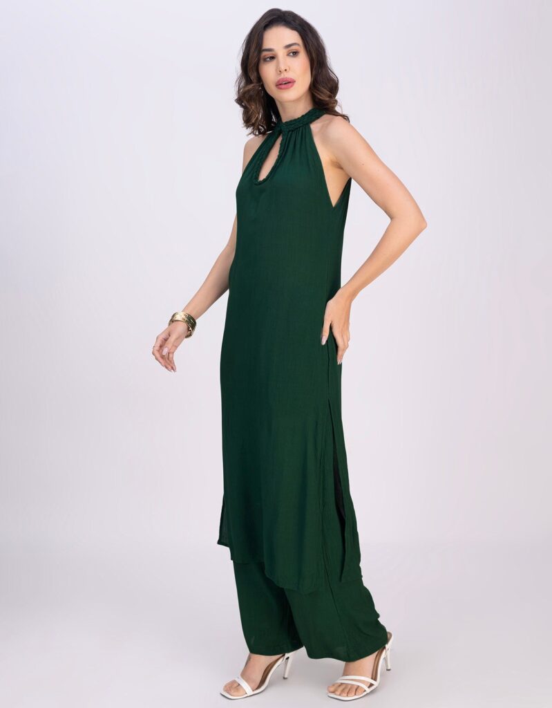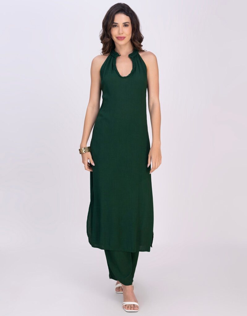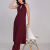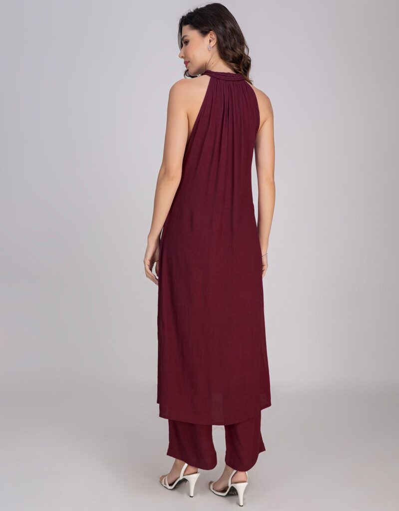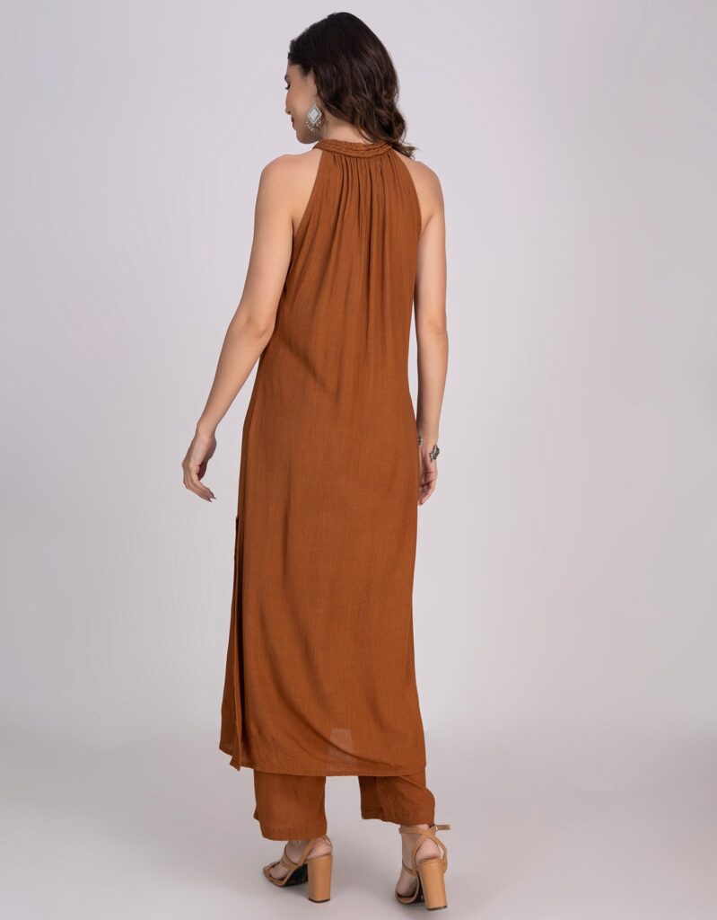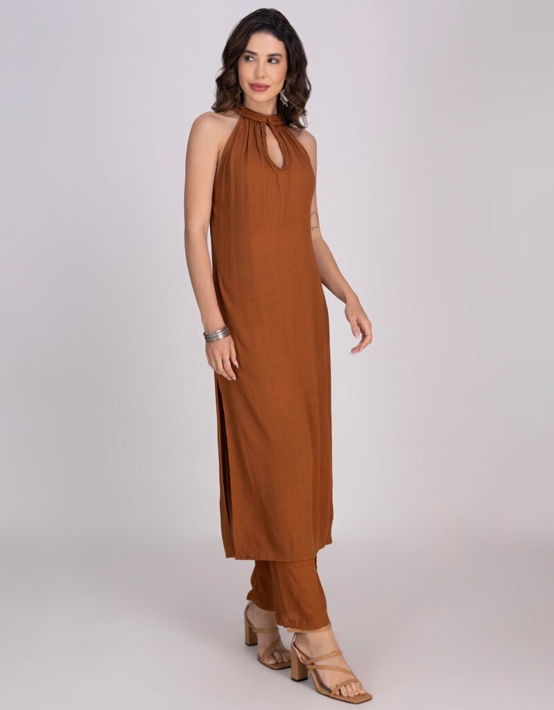 ? Sleeveless halter neck kurta with braided neckline, adding a contemporary touch.