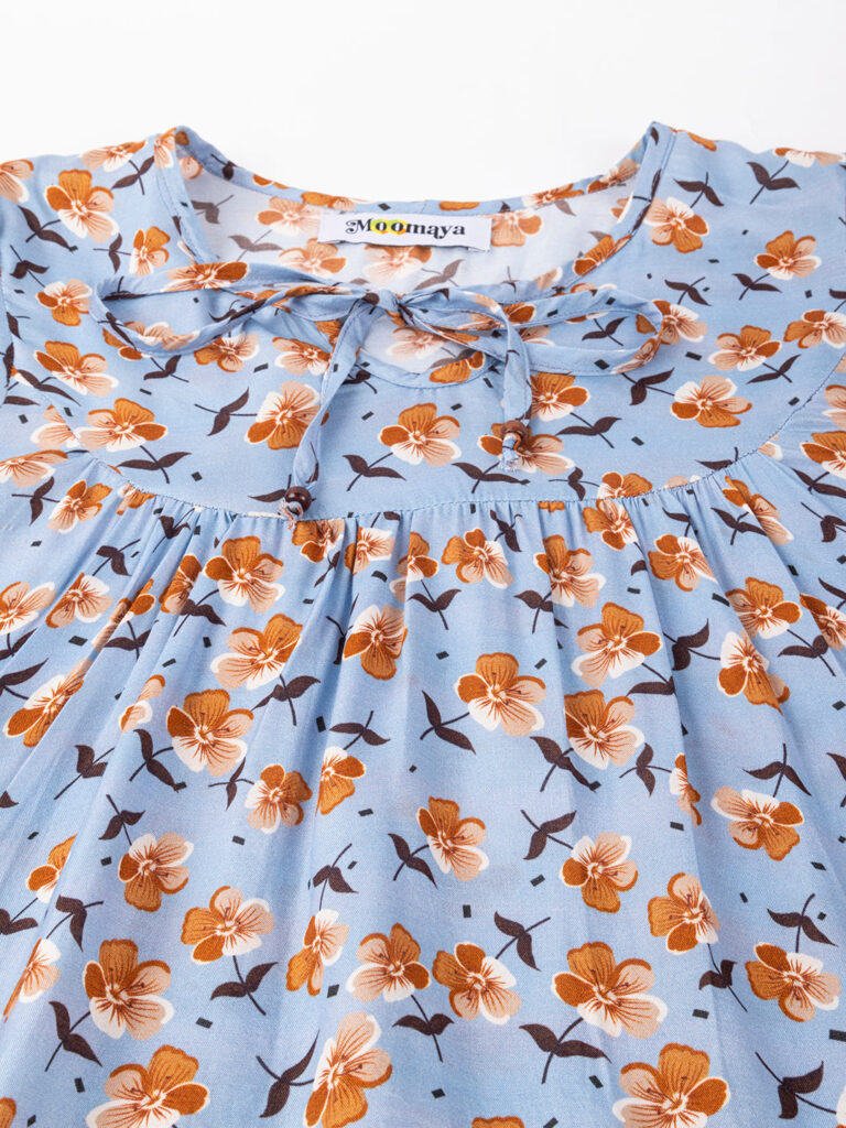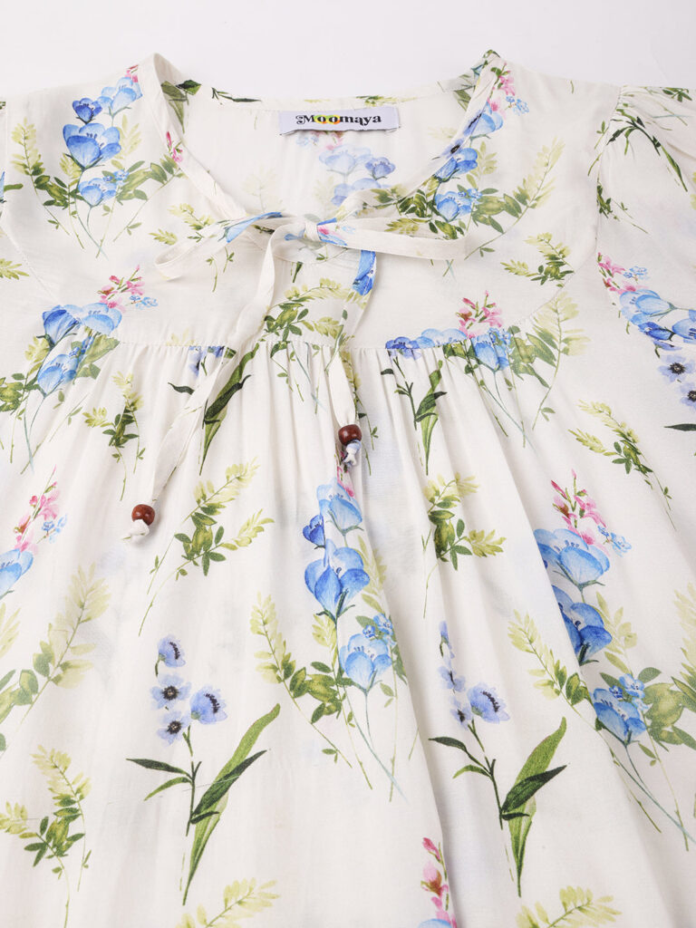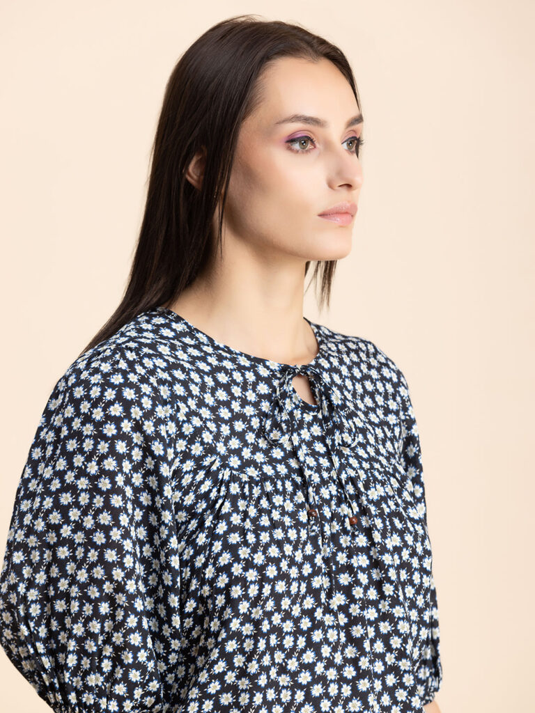 Features: Keyhole Neck, Lantern Sleeves, Empire Line, Lightweight, Loose Fit And All Over Printed Pattern