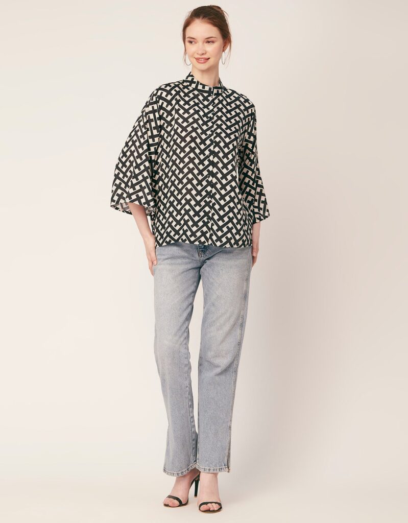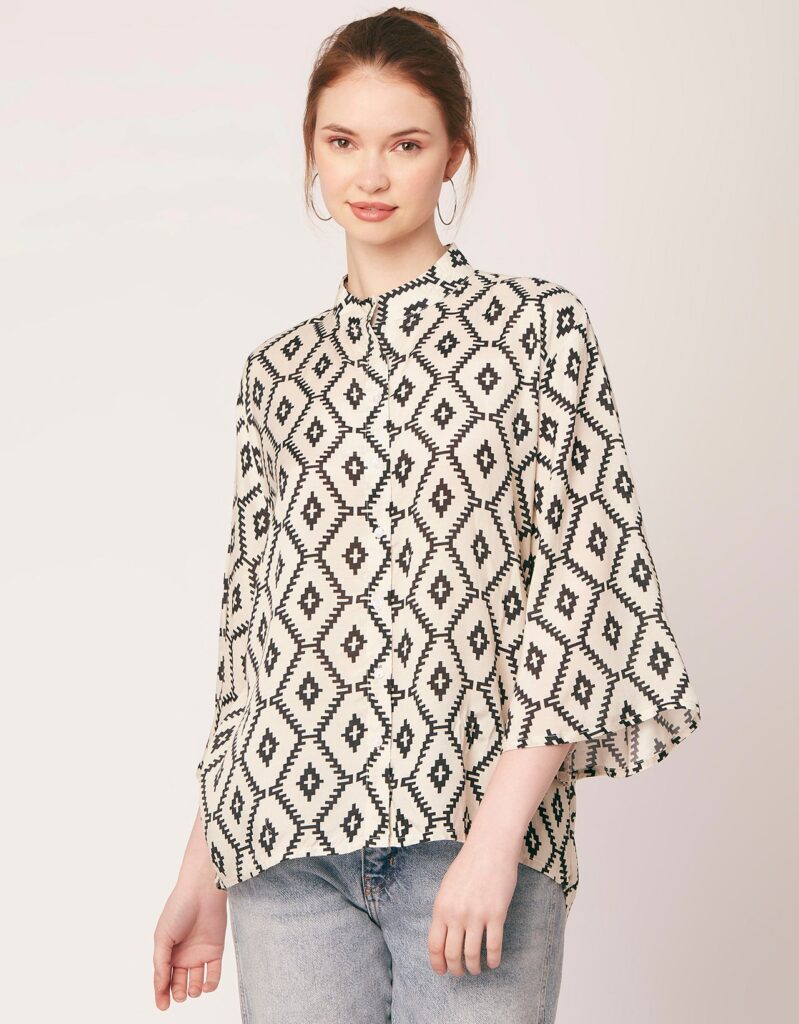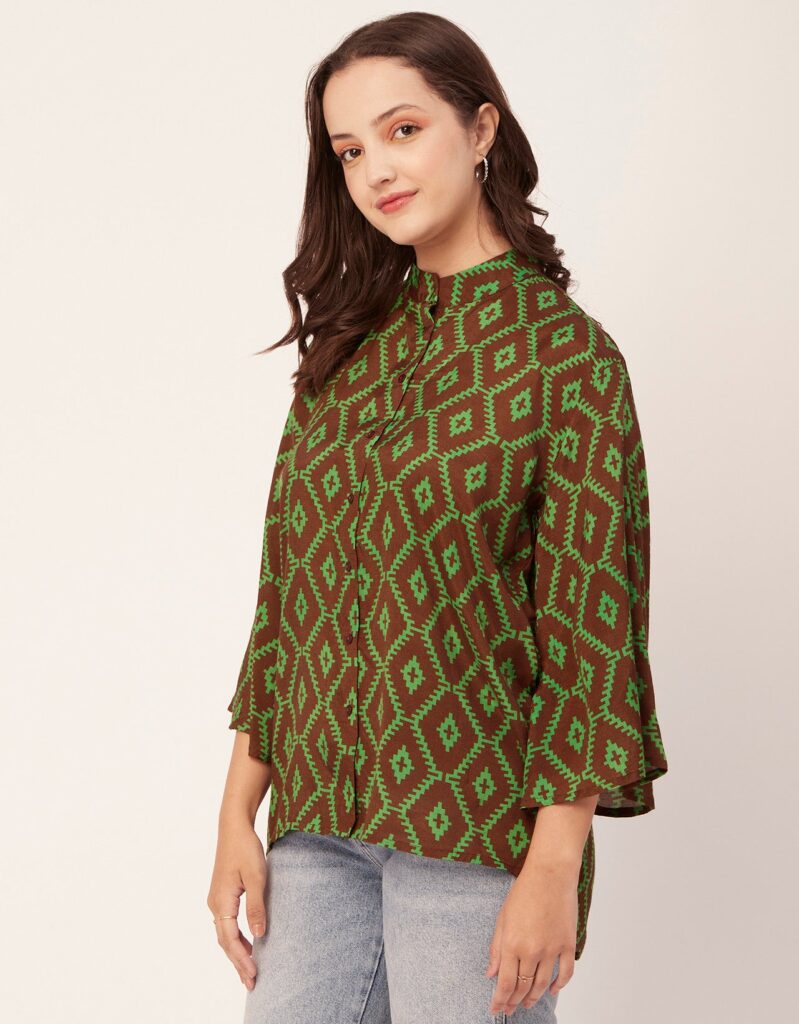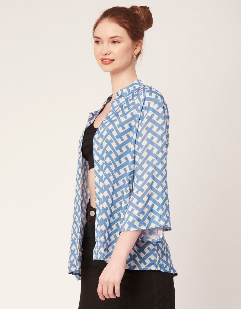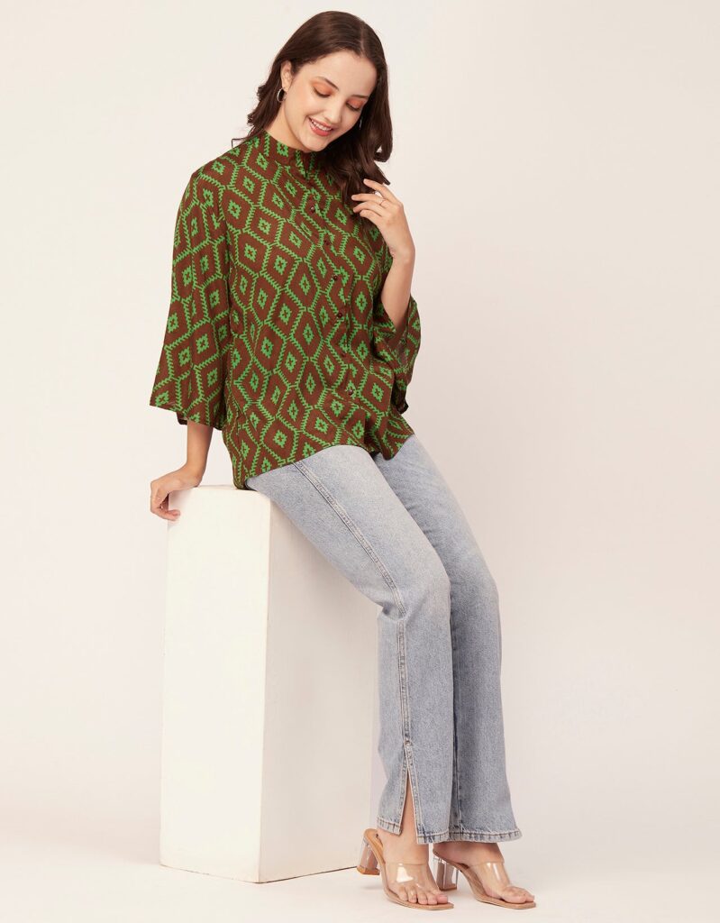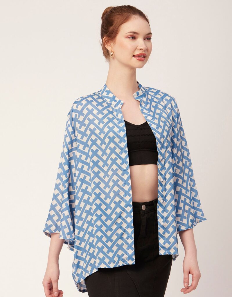 Tags: Oversize Shirt For Women, Summer Tops, Loose Fit Shirt, Mandarin Collar Shirt For Women, Printed Casual Shirt, Button Down Shirt, Long Bell Sleeve Top