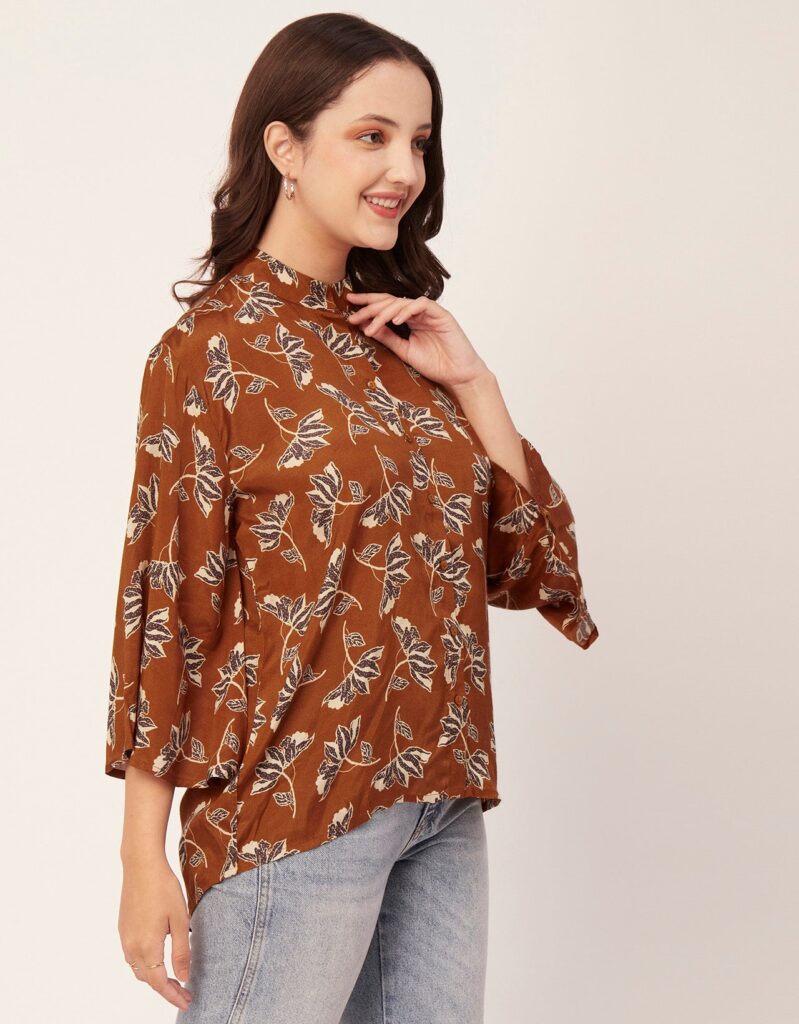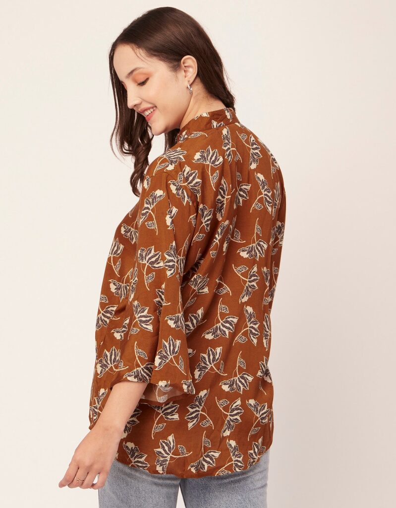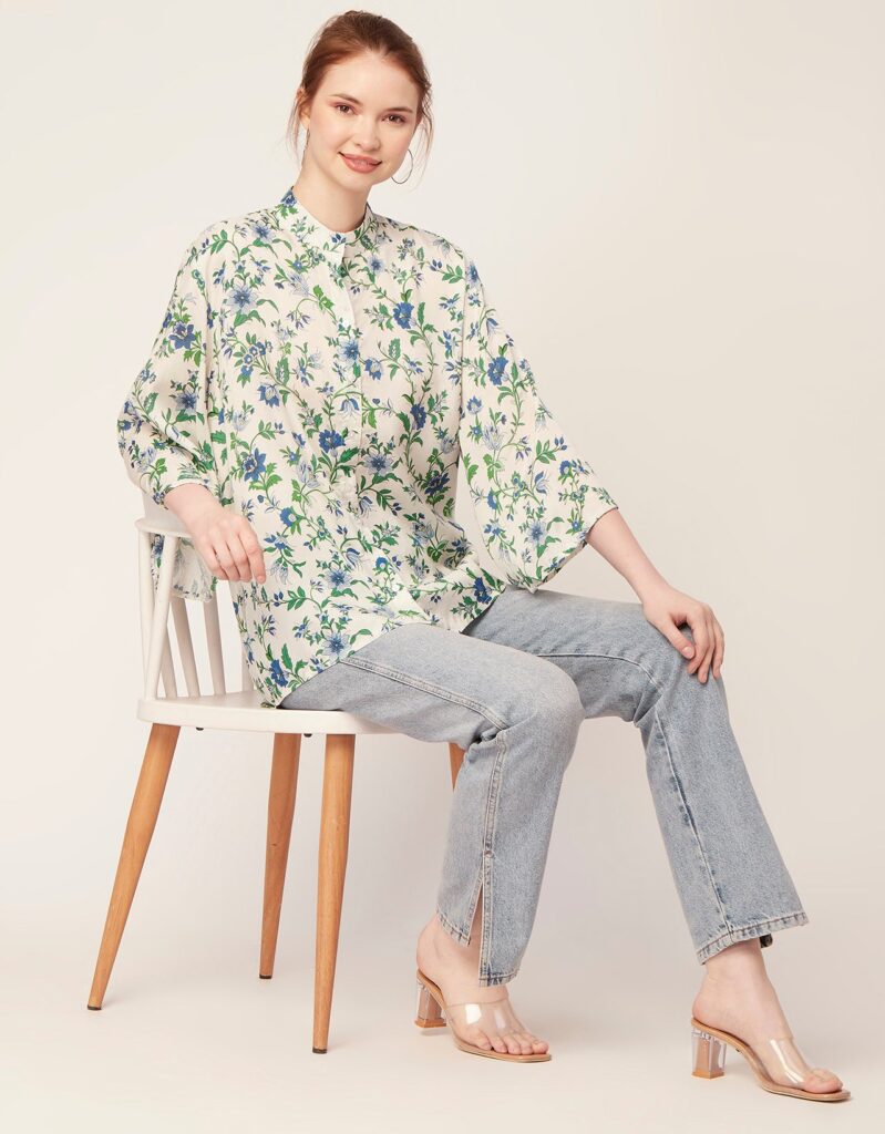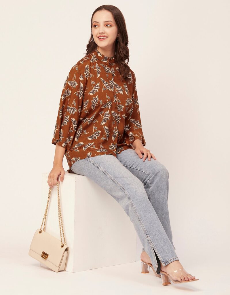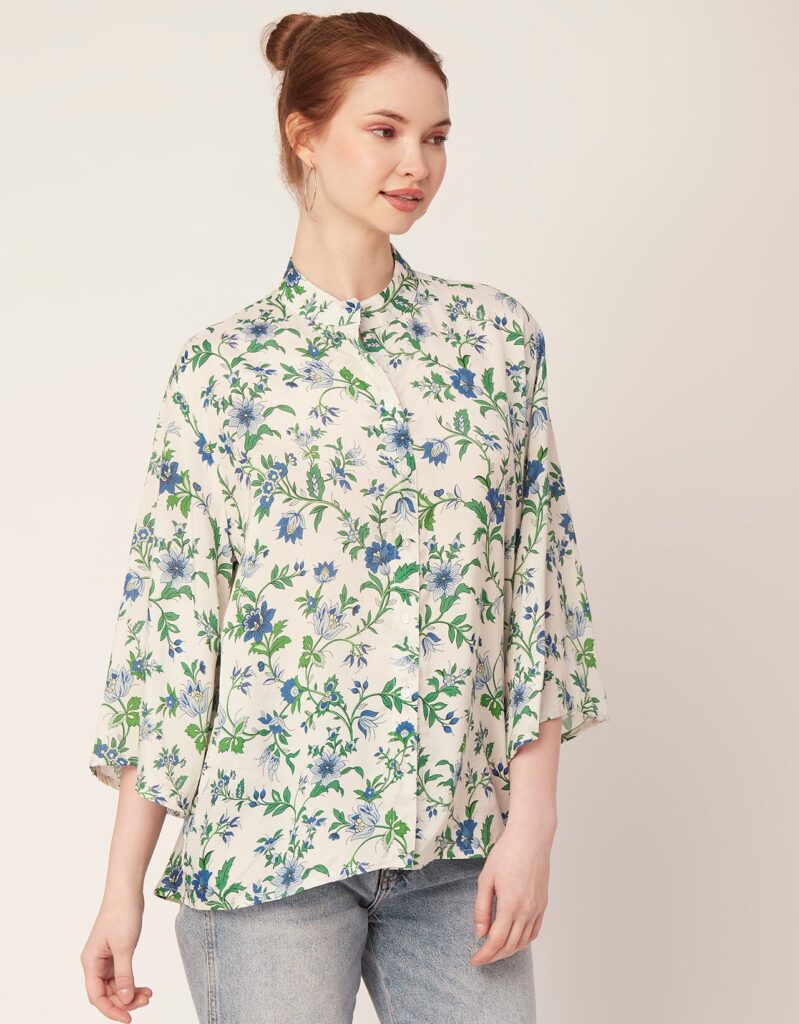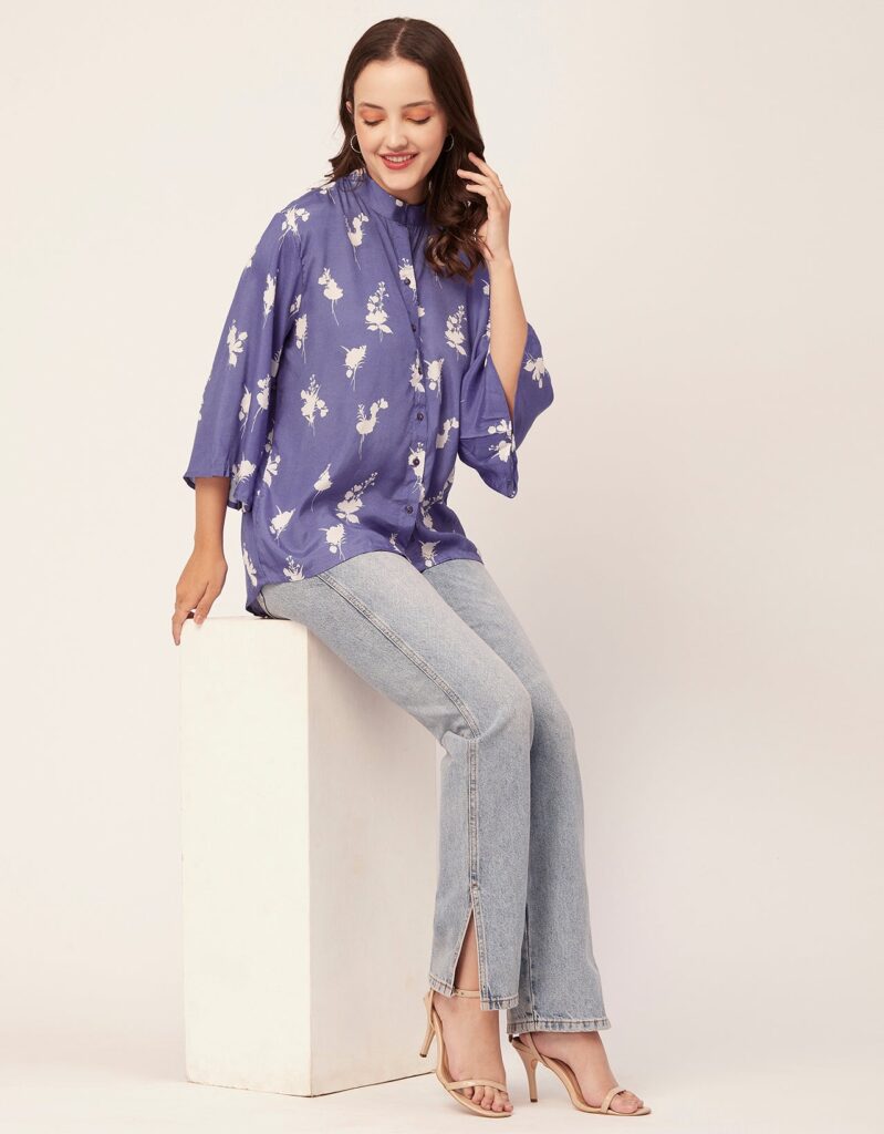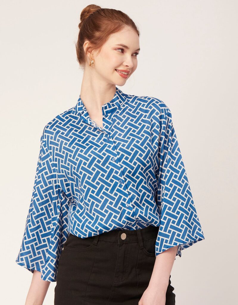 Tags: Oversize Shirt For Women, Summer Tops, Loose Fit Shirt, Mandarin Collar Shirt For Women, Printed Casual Shirt, Button Down Shirt, Long Bell Sleeve Top