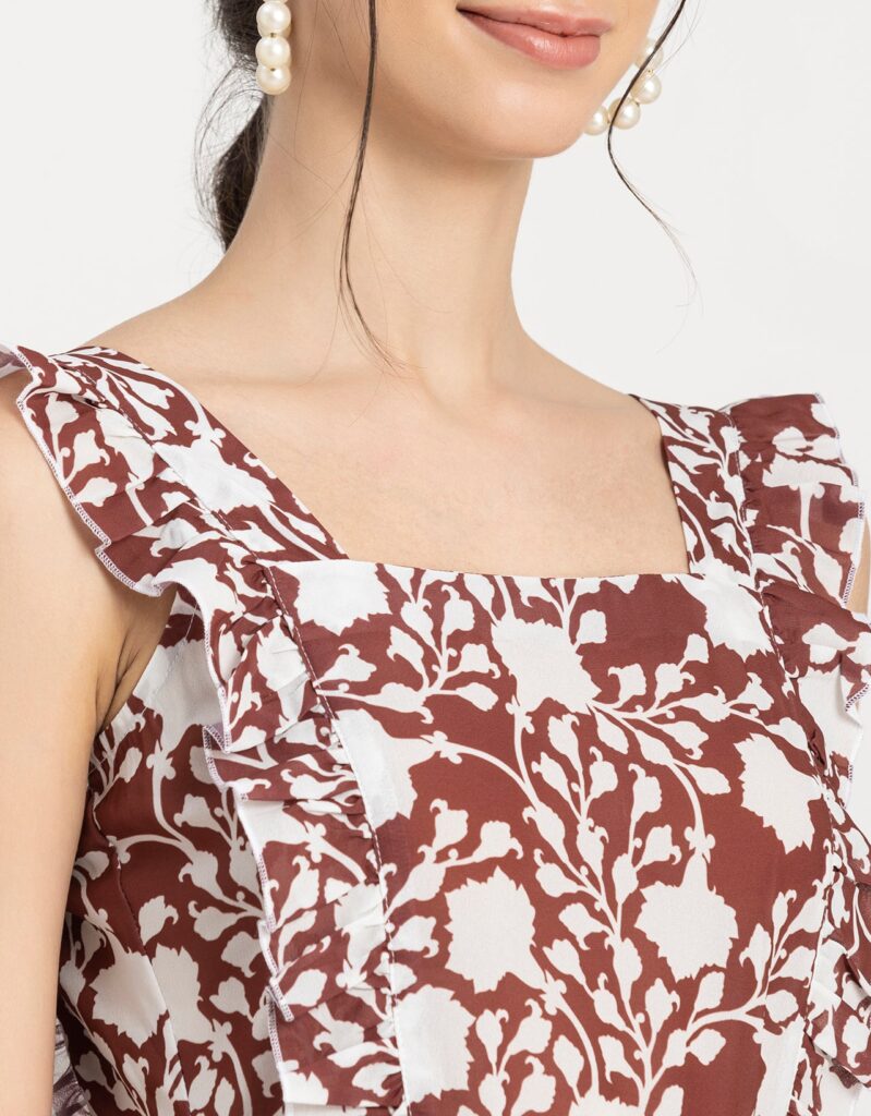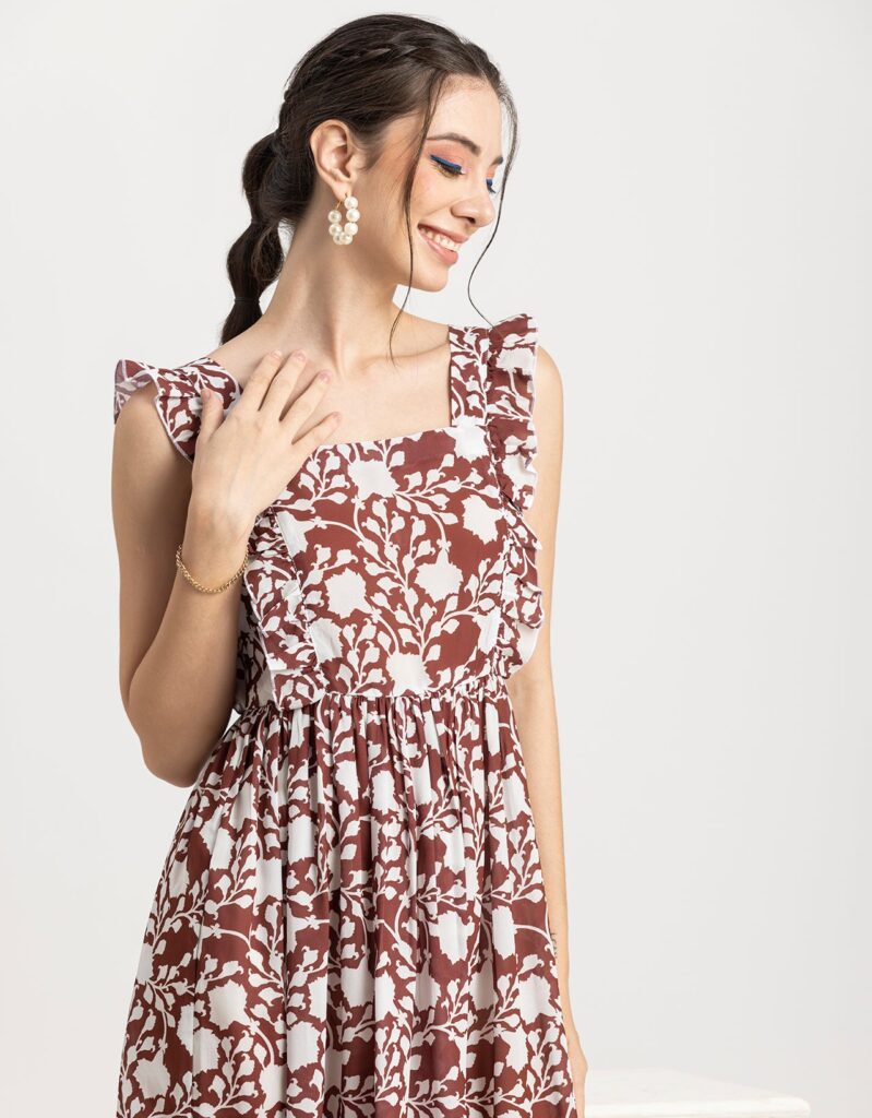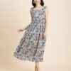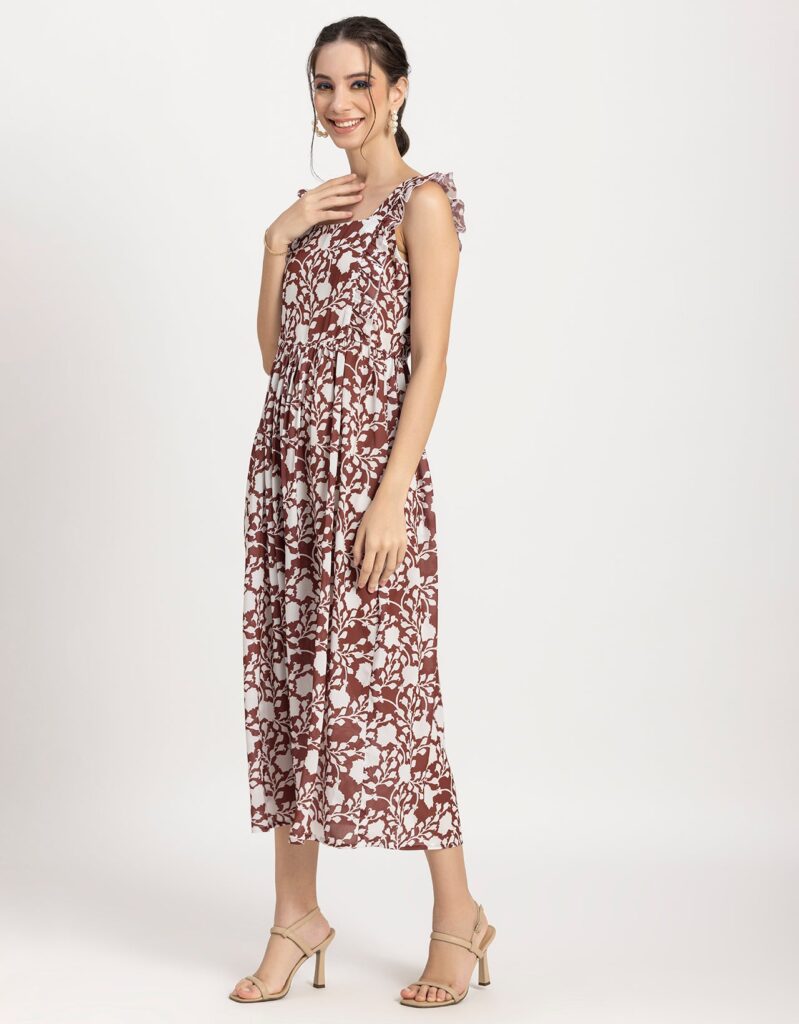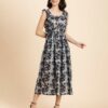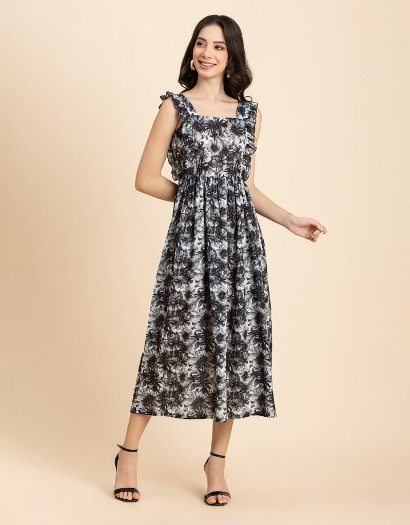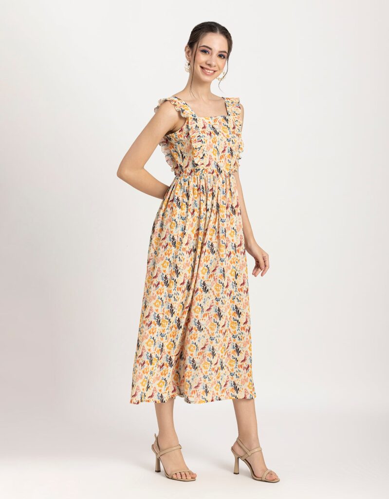 Features: Sleeveless, Ruffled, Square Neck, Ankle Length, A-Line, Lightweight And All Over Printed Pattern