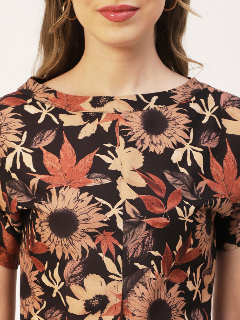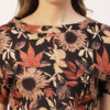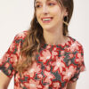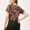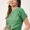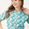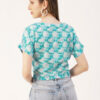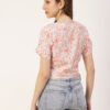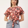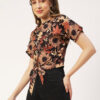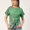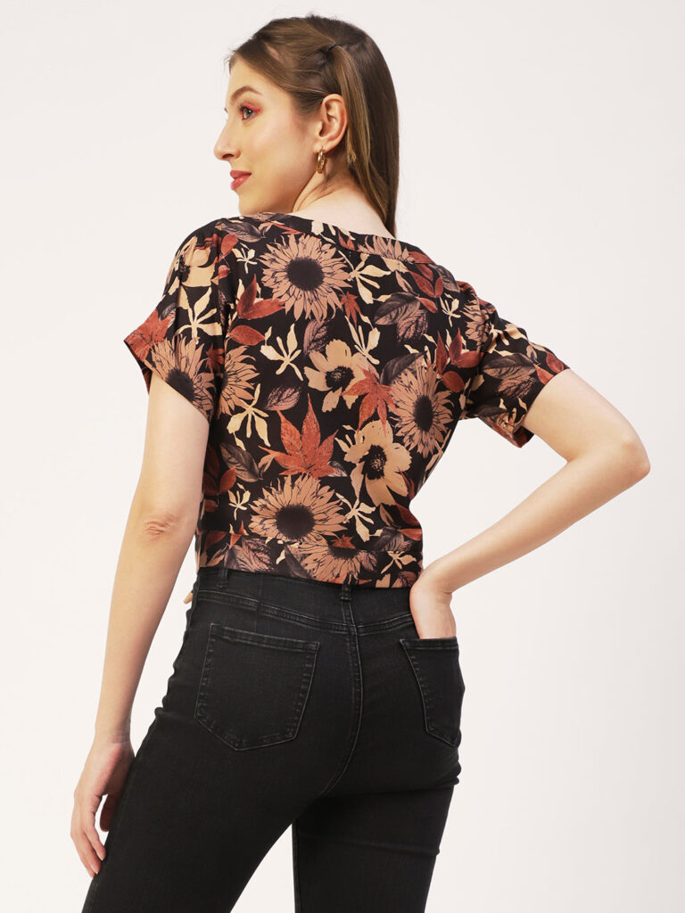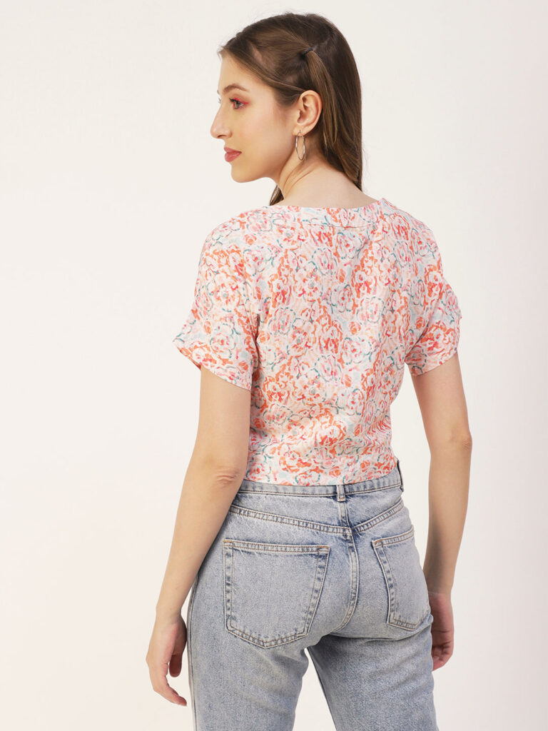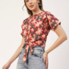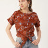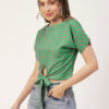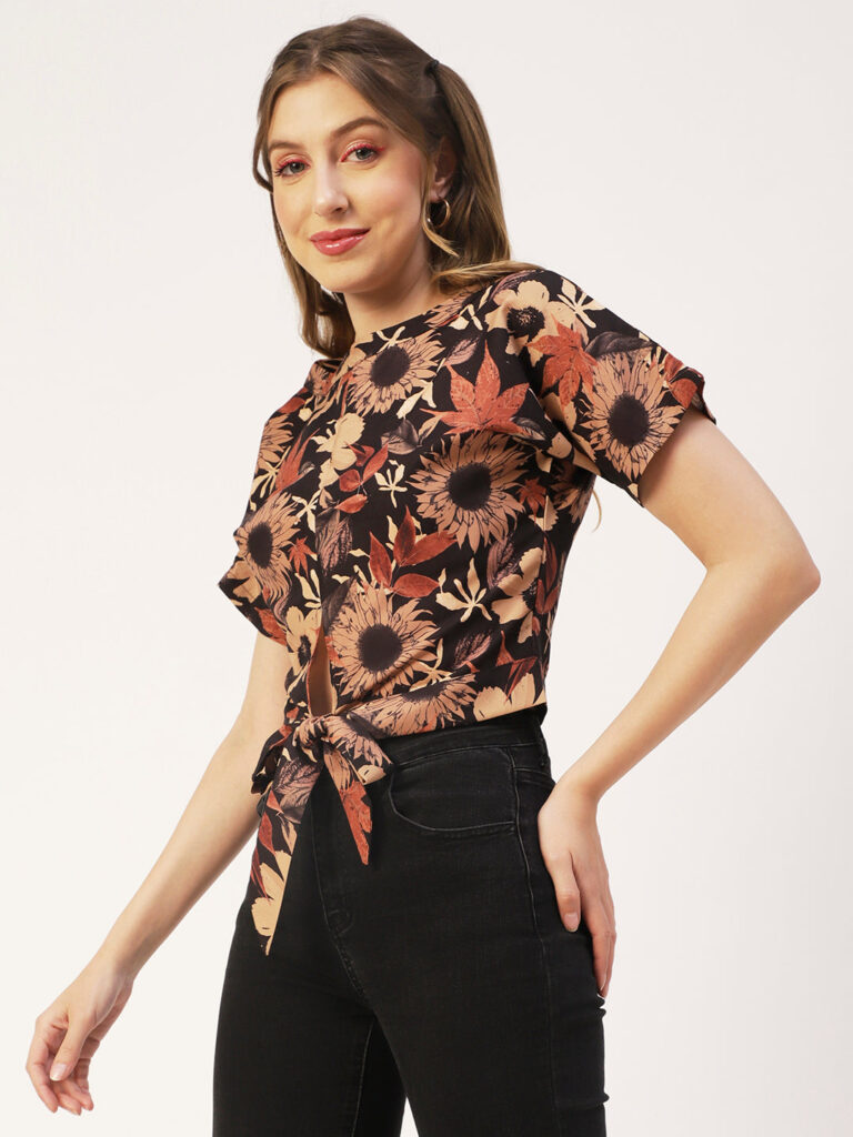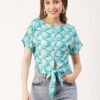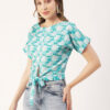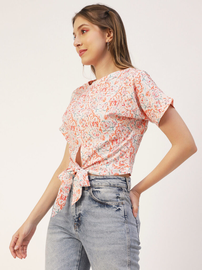 Features: round neck, short sleeves, front knot, cropped length, lightweight and all over printed pattern