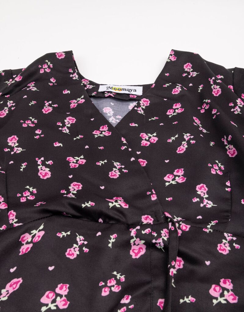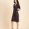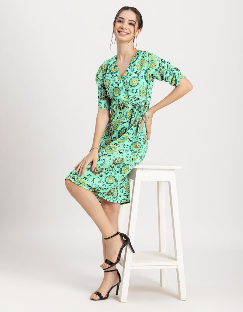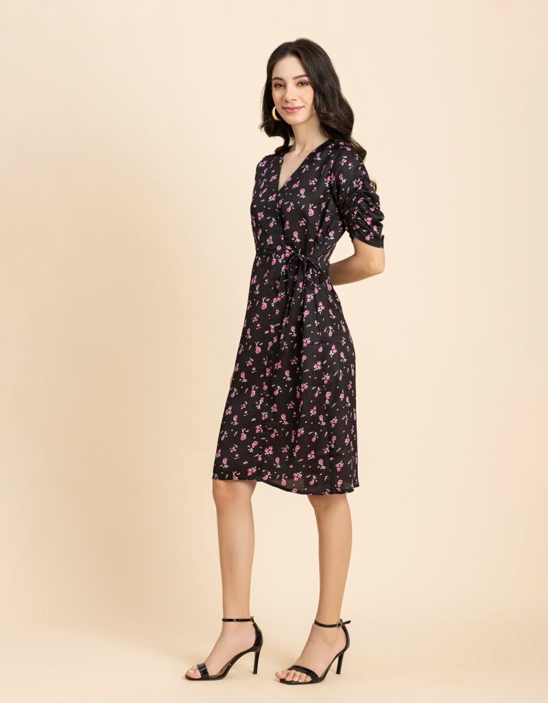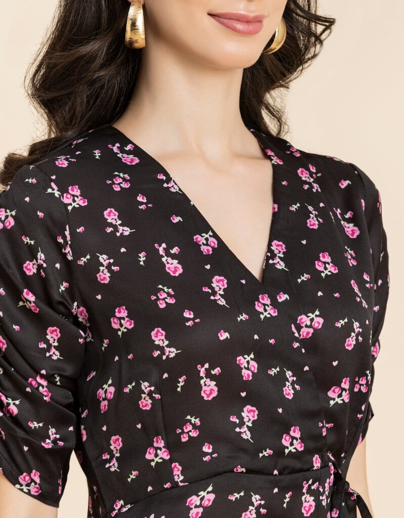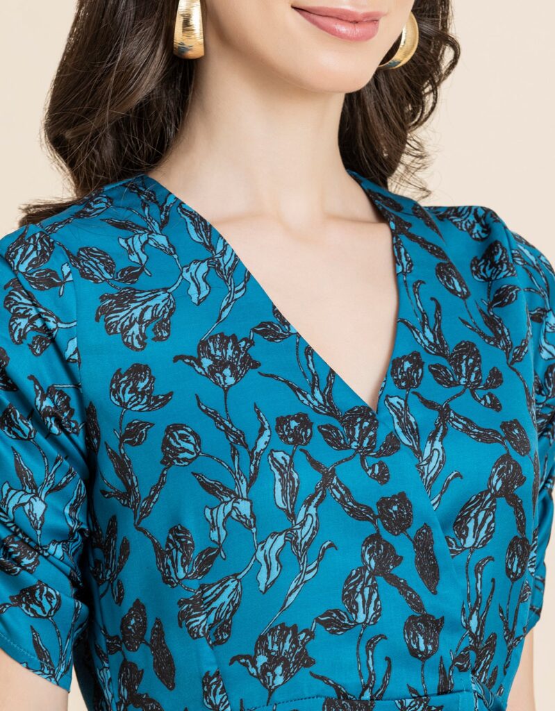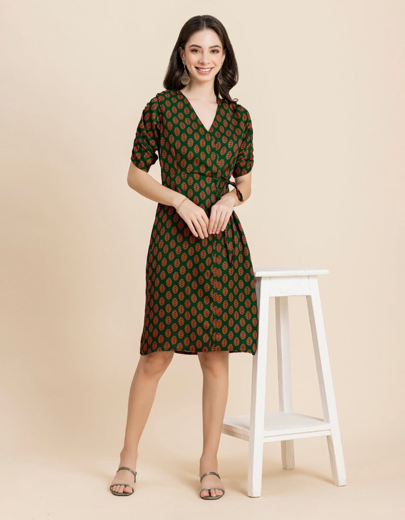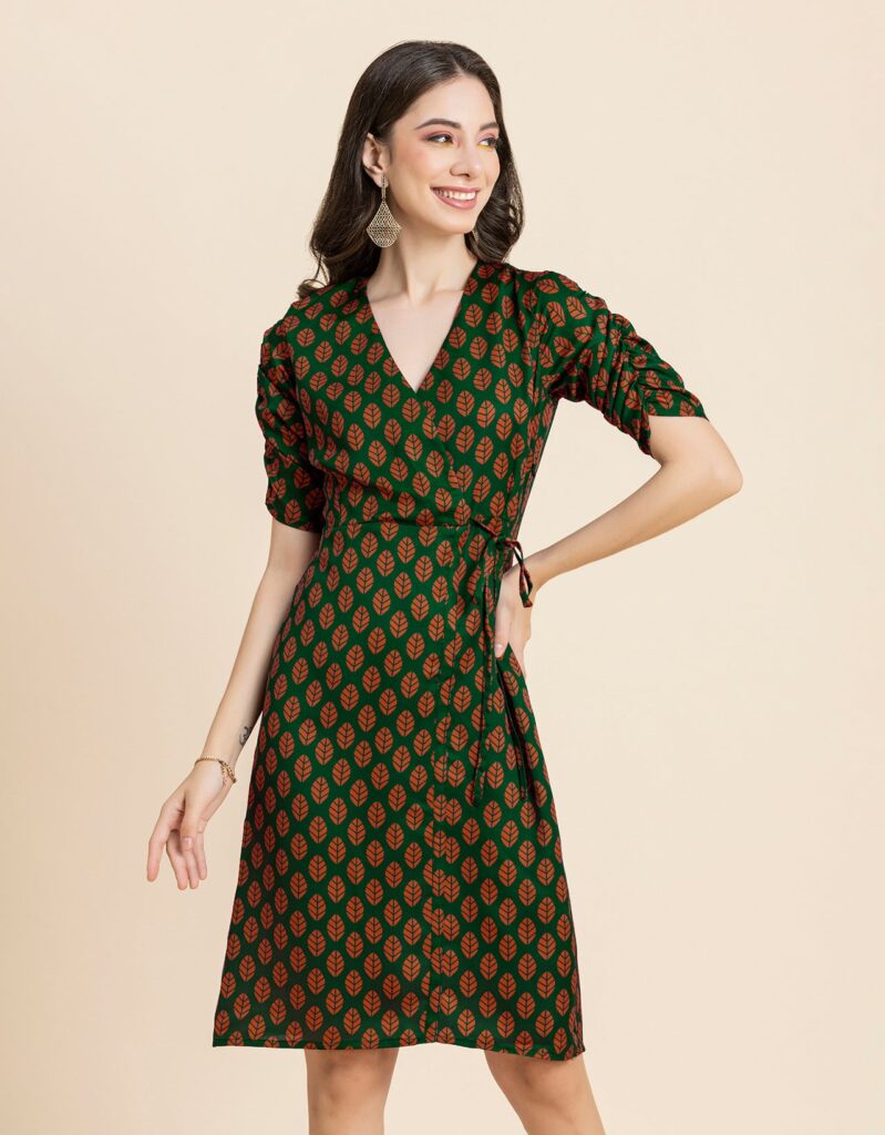Tags: Summer Dresses For Women, Wrap Dresses For Women, Knee Length Dresses, Ruched Sleeves Tops For Women, Elbow Sleeves Dresses For Women, V Neck Dresses For Women