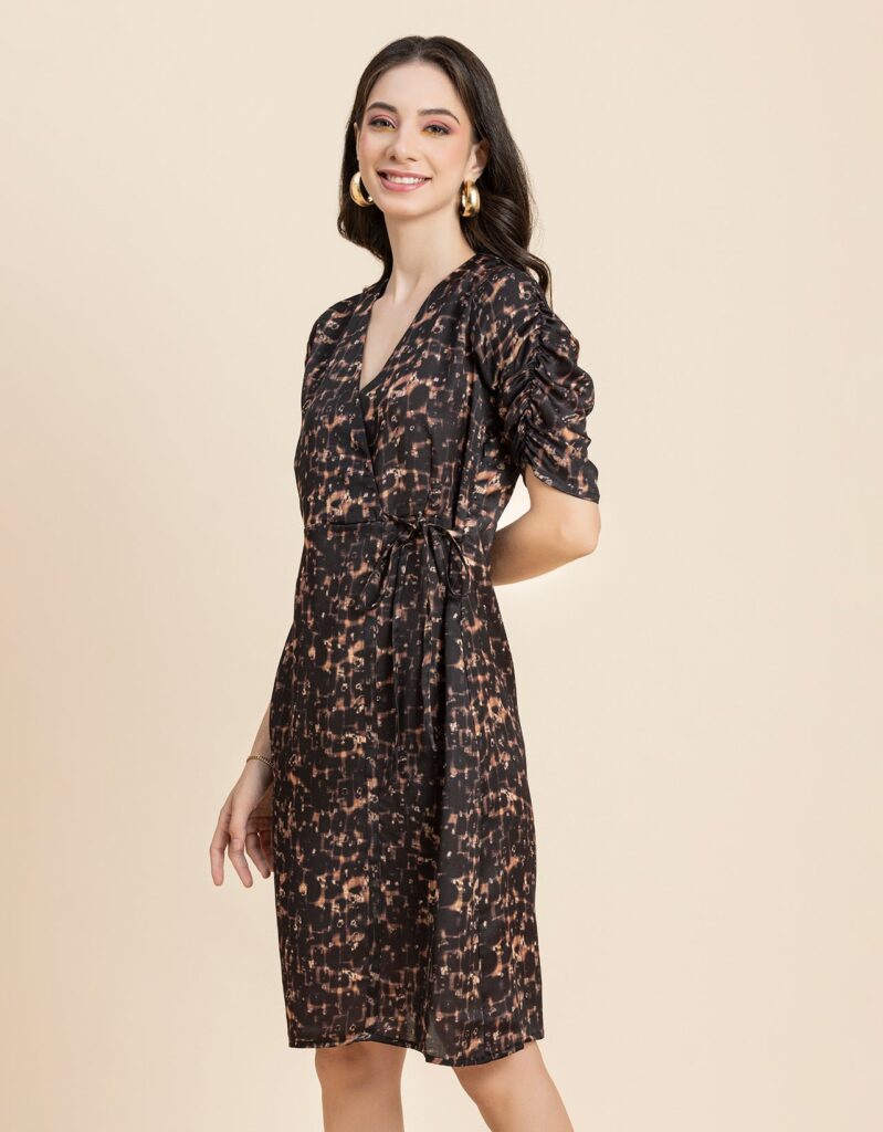 Features: Wrap Style, Ruched Sleeves, V-Neck, A-Line, Knee Length, Lightweight And All Over Printed Pattern