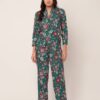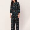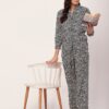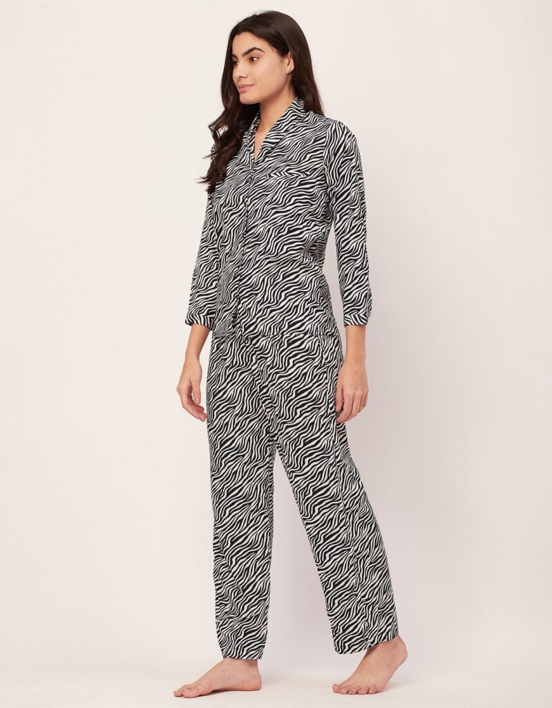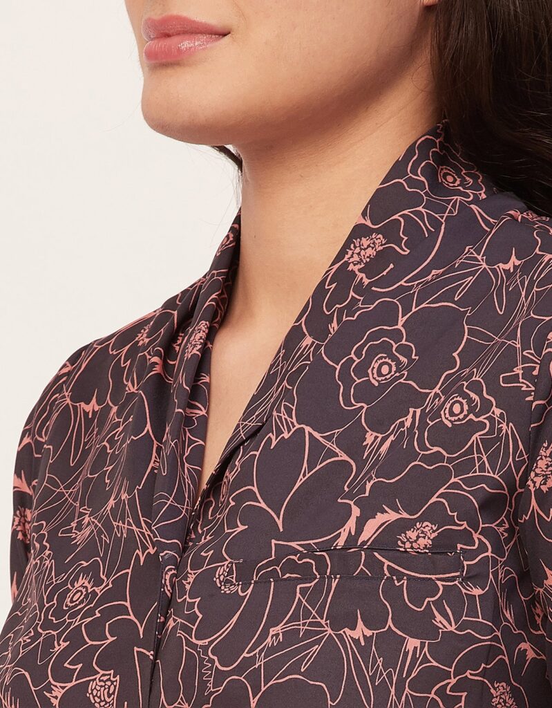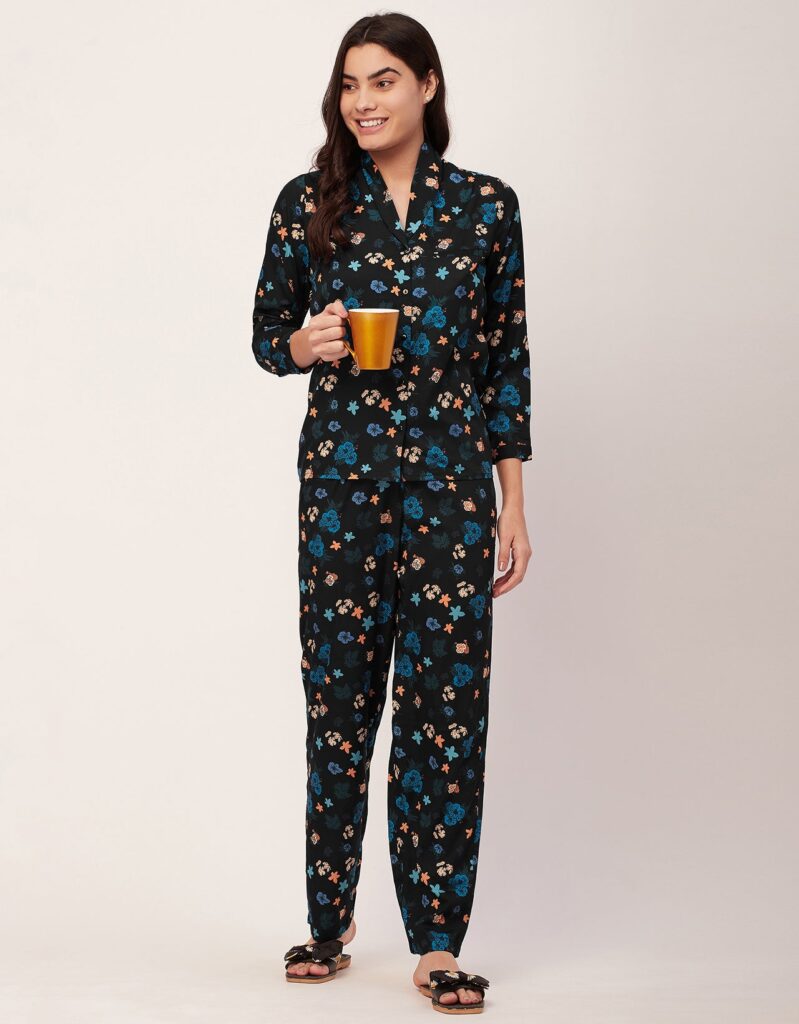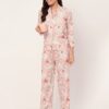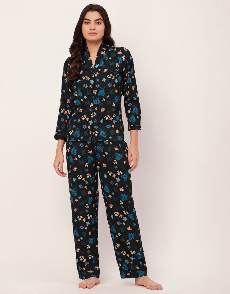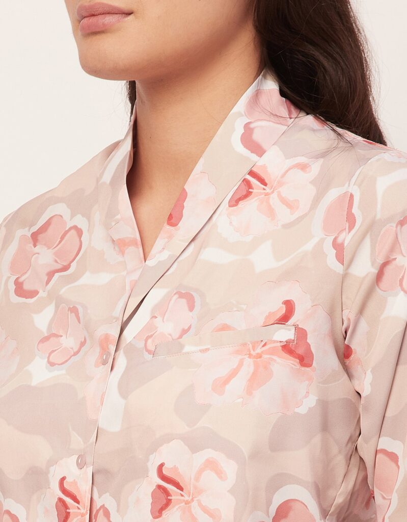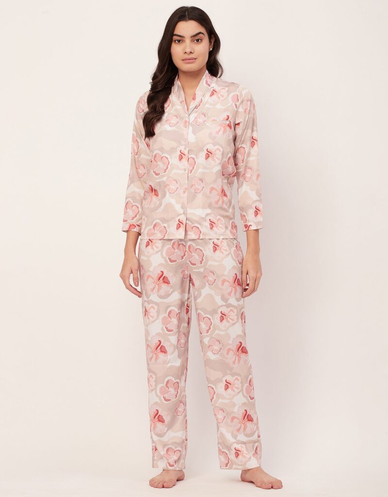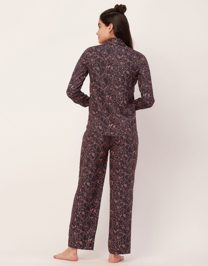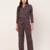 Tags: Printed Satin Loungewear, Long Sleeve Pajama Set, Printed Night Suit For Women, Button Down Shirt Pajama Set, Two Piece Sleepwear, Satin Shirt With Long Pajama Pant