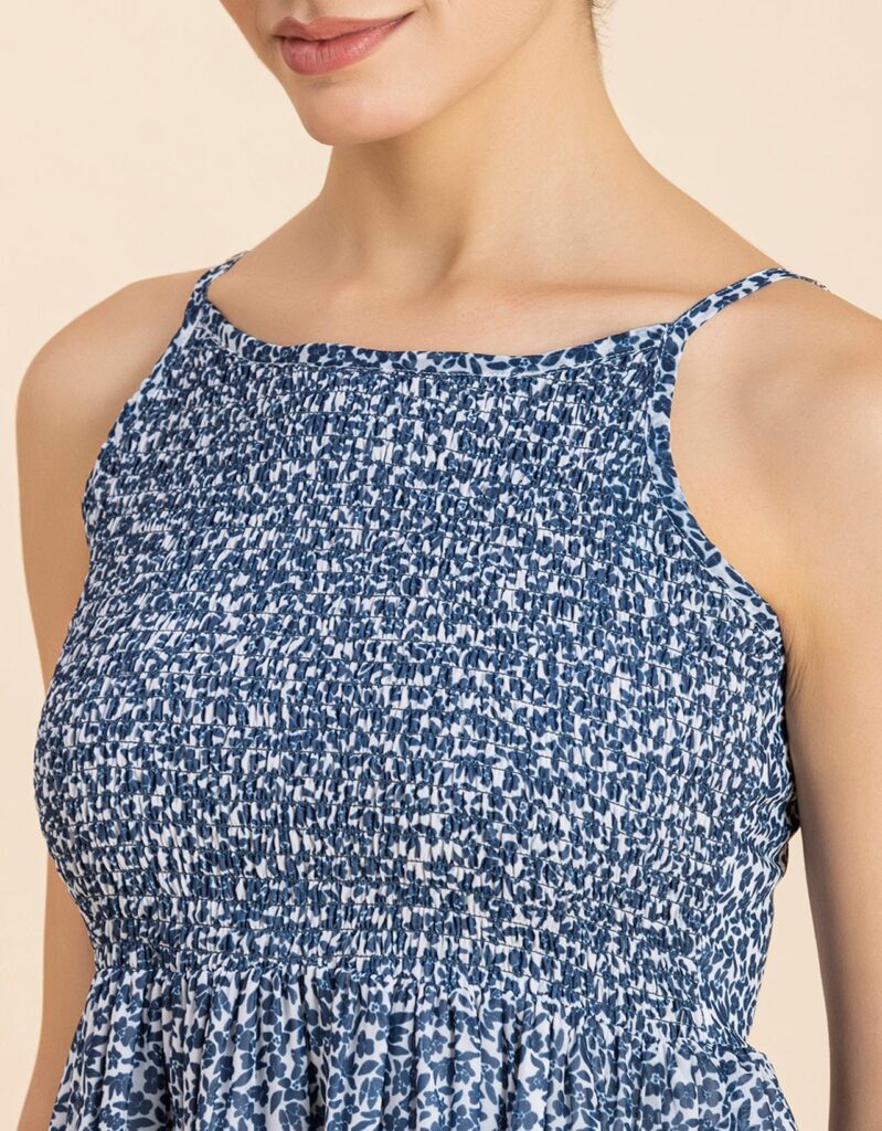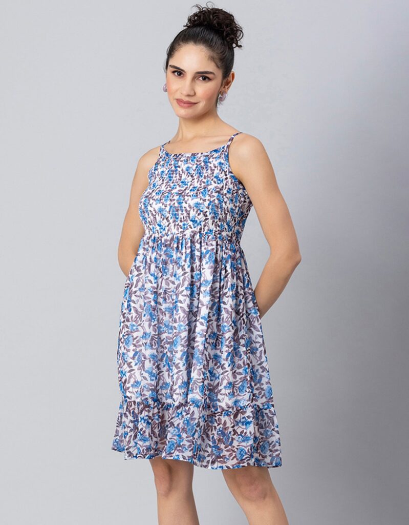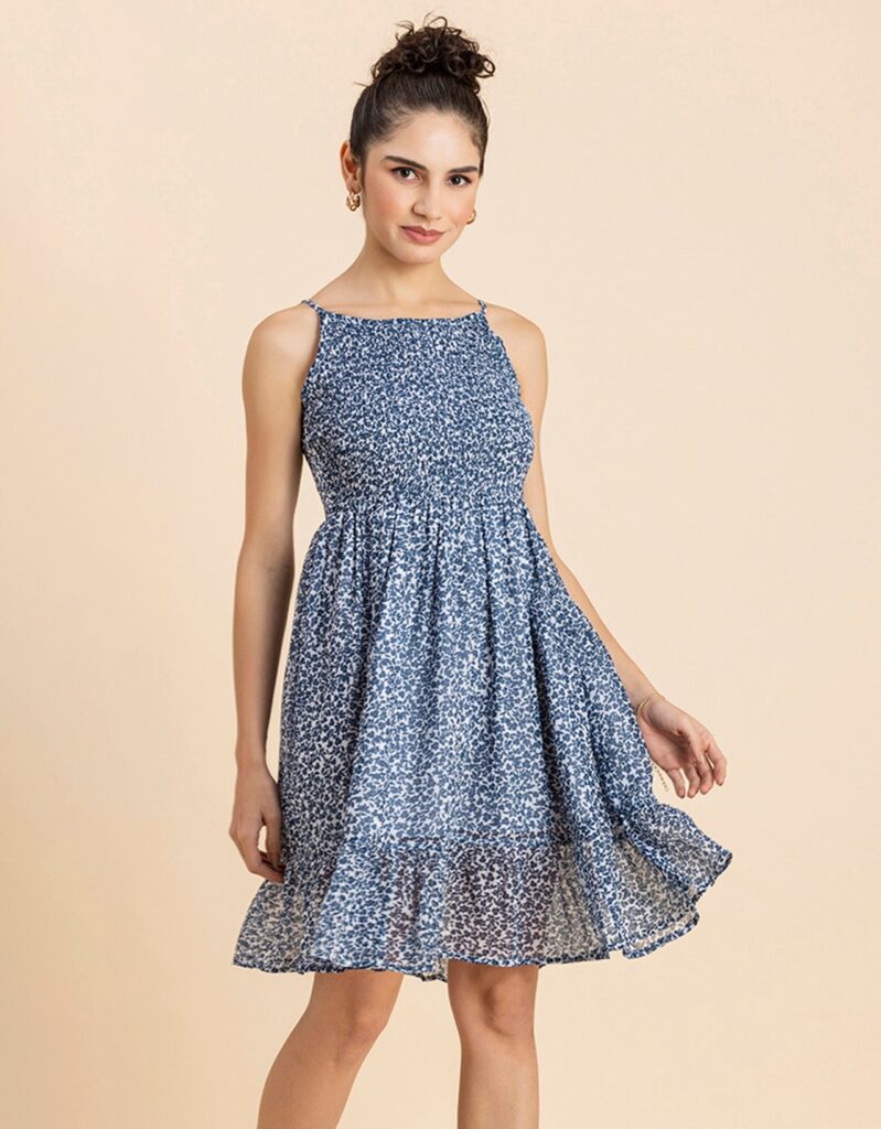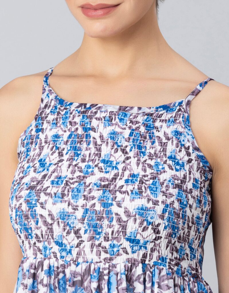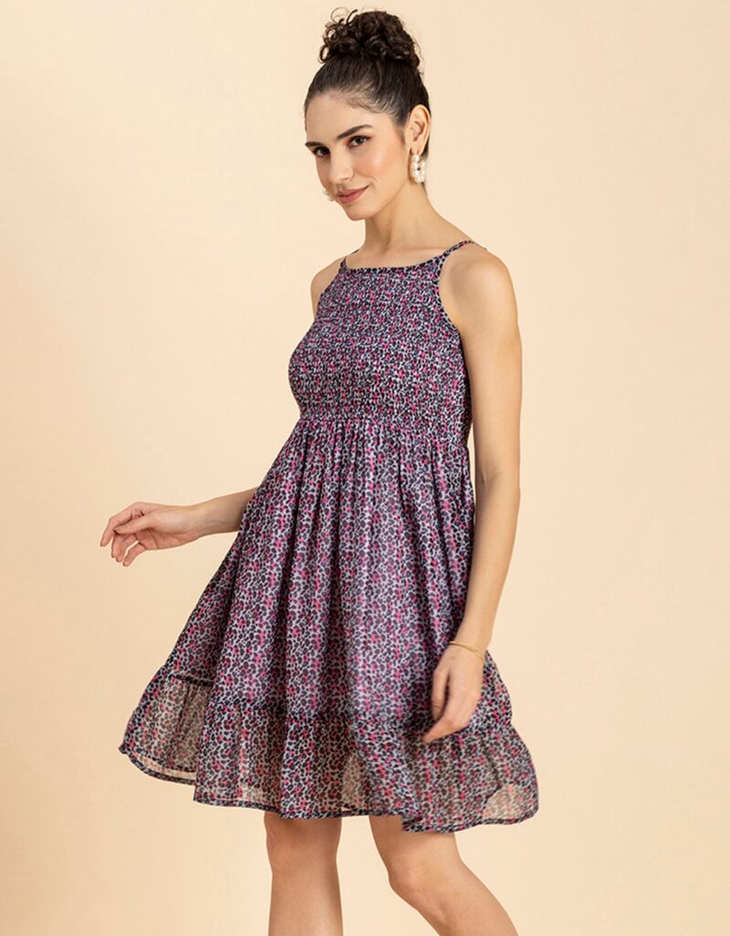 Features: Strappy Shoulders, Smocked Bust, Sleeveless, Square Neck, Frilled Flared Bottom, Mini Length, Lightweight And All Over Printed Pattern