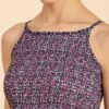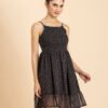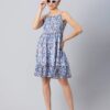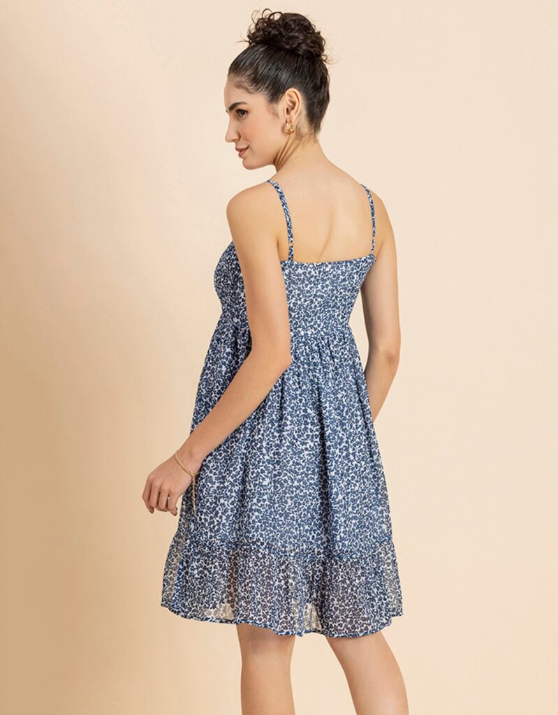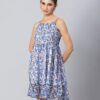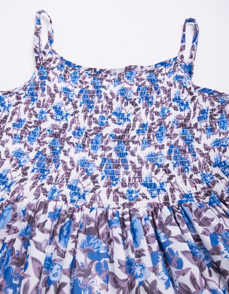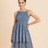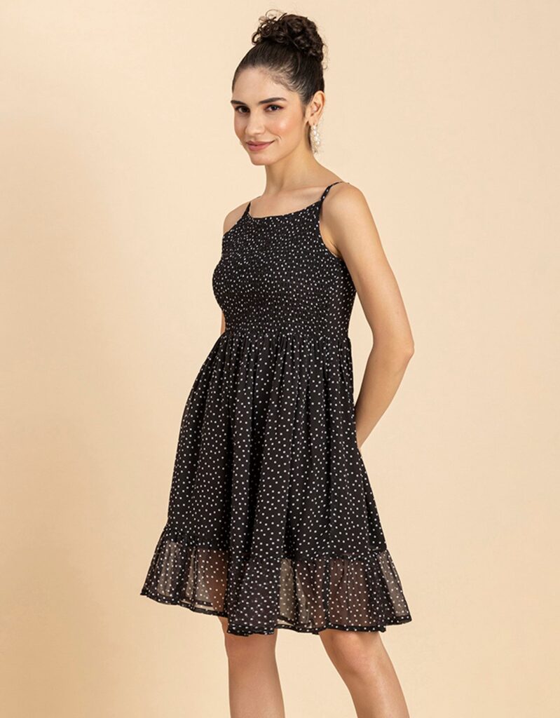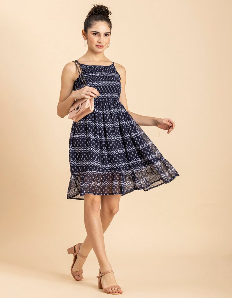 Features: Strappy Shoulders, Smocked Bust, Sleeveless, Square Neck, Frilled Flared Bottom, Mini Length, Lightweight And All Over Printed Pattern