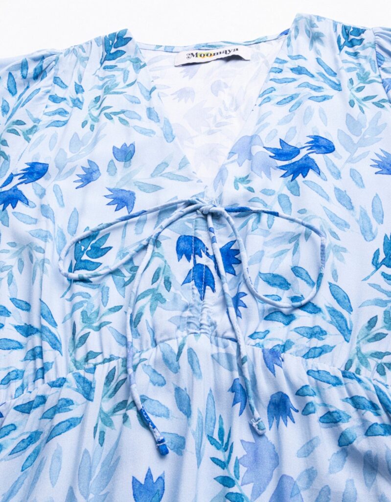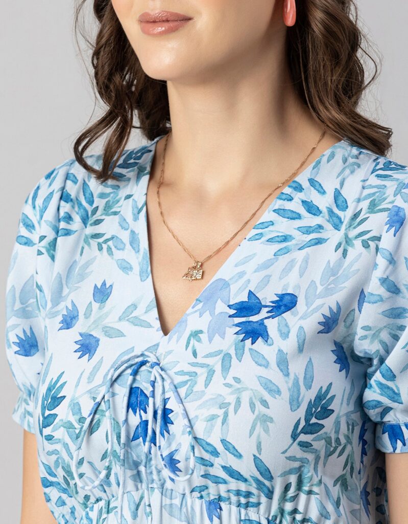 Features: Puffed Sleeves, Ruffled Hem, V Neck With Drawstrings, Calf Length, Conceal Zipper, Lightweight And All Over Printed Pattern