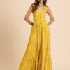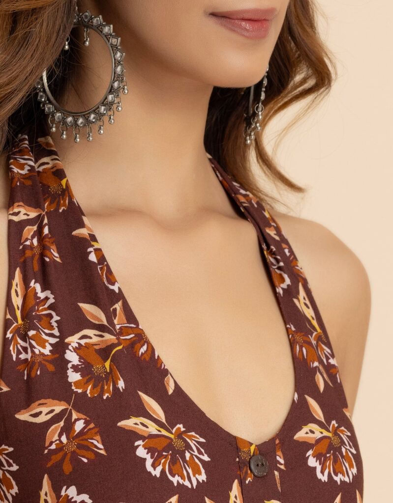 Includes: This clothing consists of 1 Jumpsuit (Any accessories worn by the model are not for sale) Material: Viscose Rayon | GSM: 119 Jumpsuit Length: 56 inches (Approx.) Model Stats: The model in the image is 178 cm tall, and Bust 33″ inches is wearing size – (S) Small Features: deep halter neck, sleeveless, front buttoned, high waist, flared bottom, lightweight and all over printed pattern Care: Medium machine wash, warm iron, iron while damp. (After washing do not dry the fabric on high heat and do not dry fully. Medium heat is best and removes just prior to being completely dry). Size Information: Please refer to our size chart before making the purchase. If your size is in between two sizes, we recommend that you choose a larger size. Tags: jumpsuits for women, jumpsuits for women casual summer, jumpsuits for women sexy, high waist jumpsuit for women, printed jumpsuit for women, sleeveless jumpsuits for women