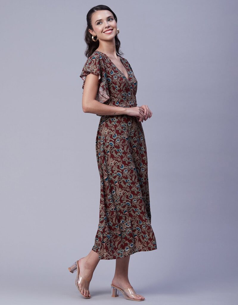 Printed V-Neck Ruffled Midi Dress