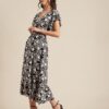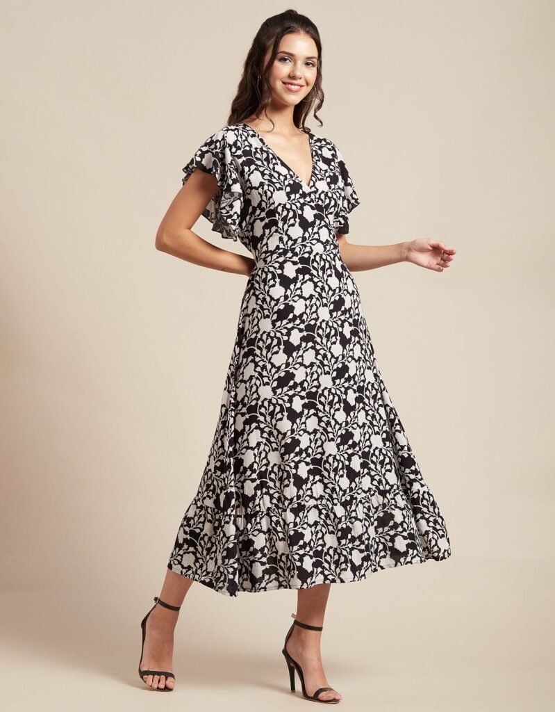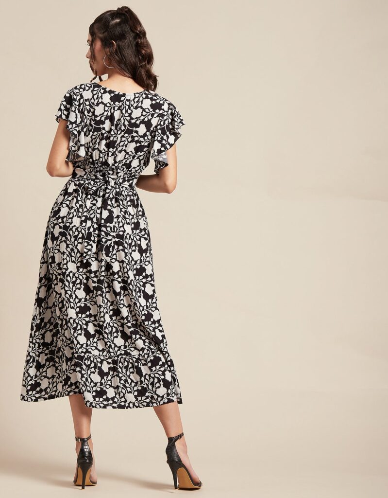 Printed V-Neck Ruffled Midi DressPrinted V-Neck Ruffled Midi Dress