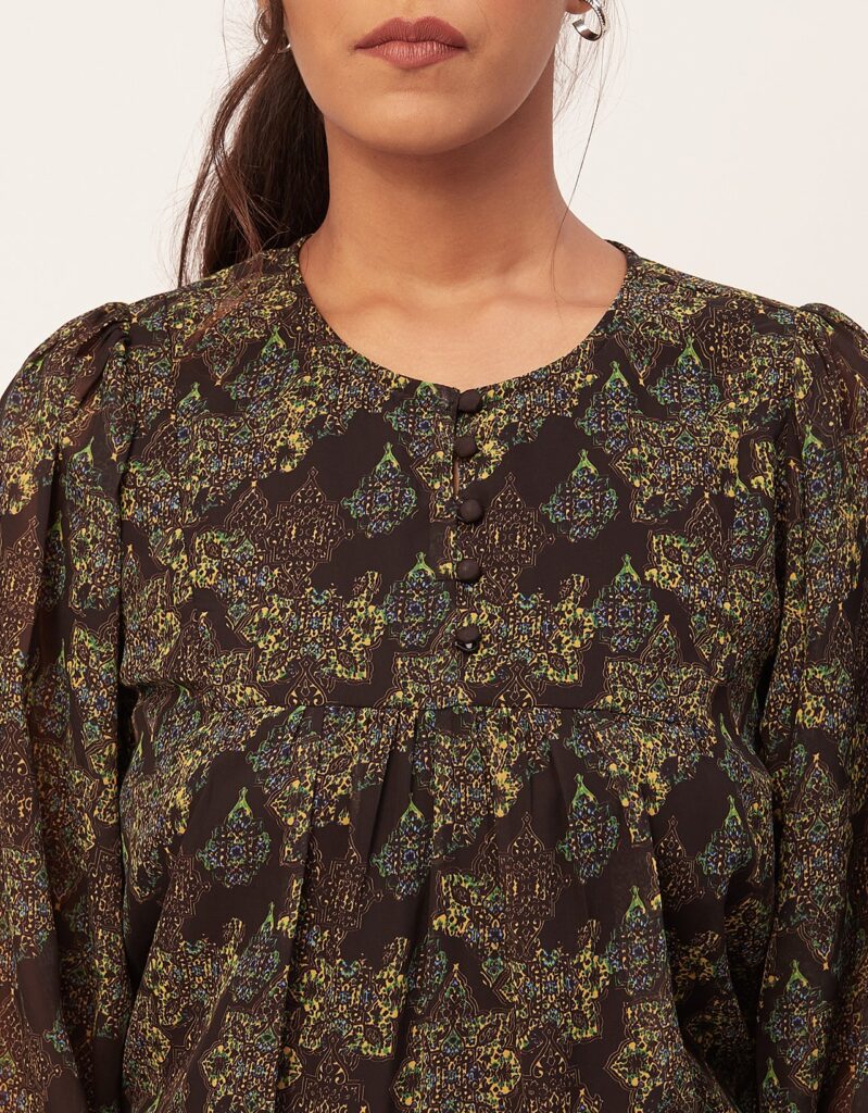 Features: Long Puff Sleeve, Round Neck, Short Length, Lightweight, All Over Printed Pattern.