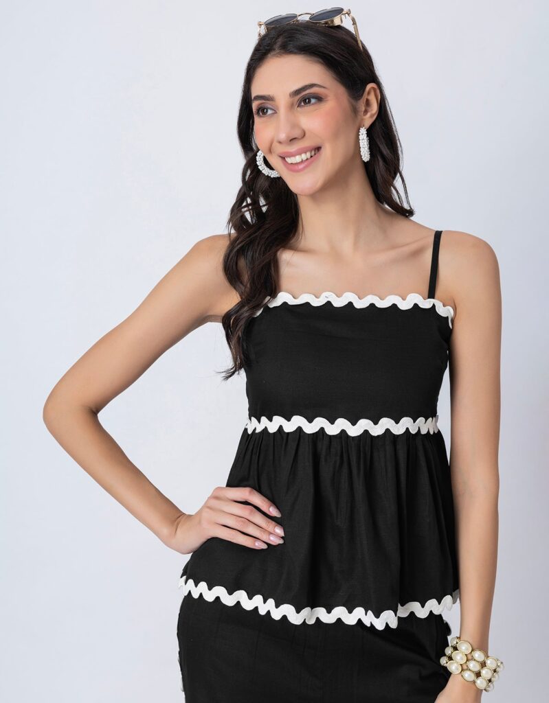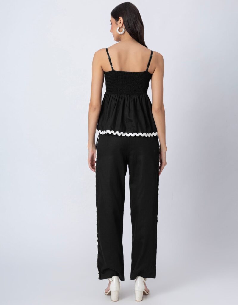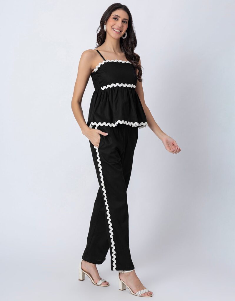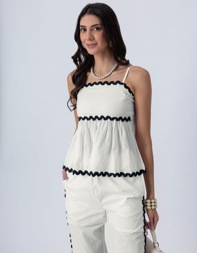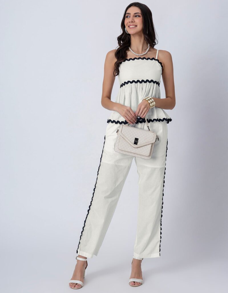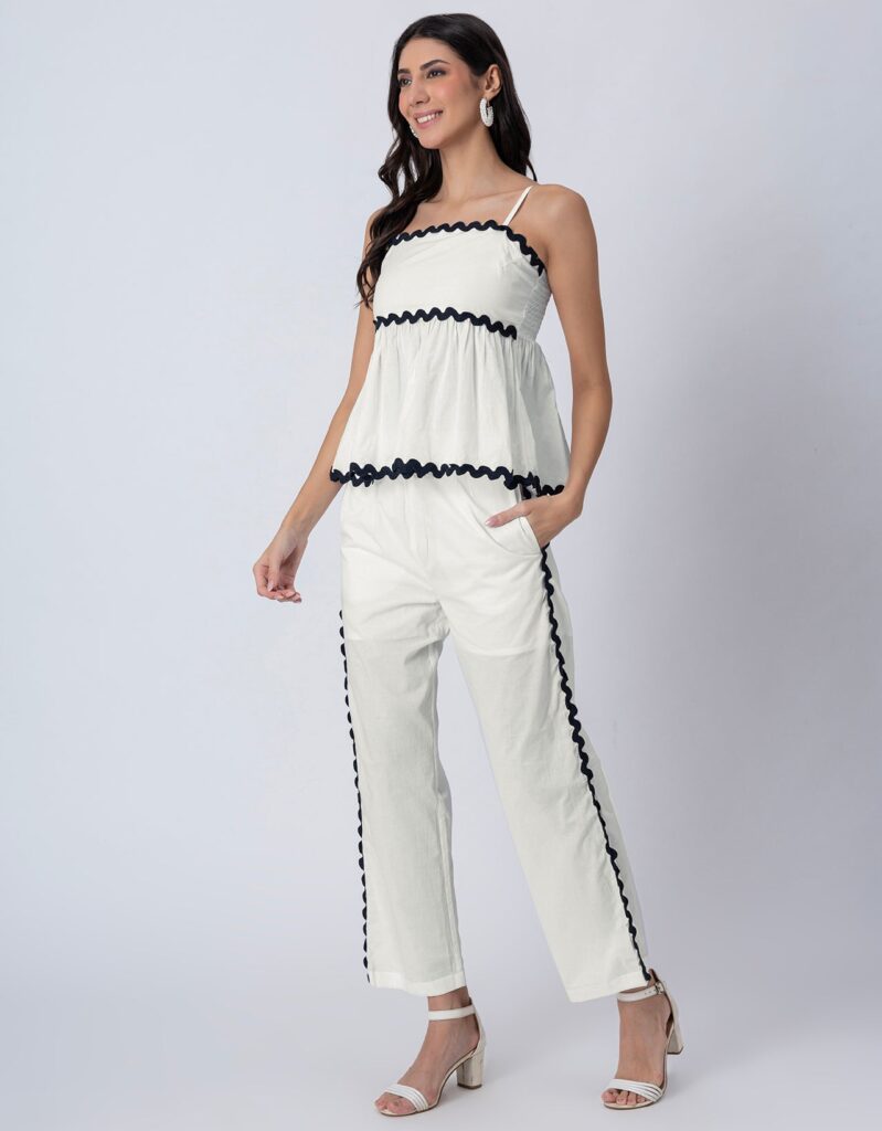 Features: Stay stylish and comfortable this summer in our Moomaya Cotton Co-ord Set, featuring a sleeveless top and elastic waist pants with two pockets. The zigzag lace details add an elegant touch, making it perfect for casual outings or relaxed gatherings. Lightweight and breathable, this set is designed for effortless summer style and versatility.