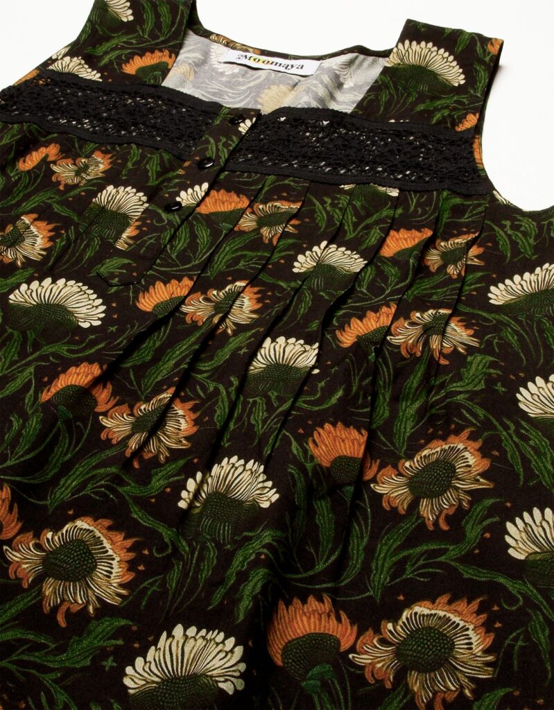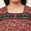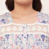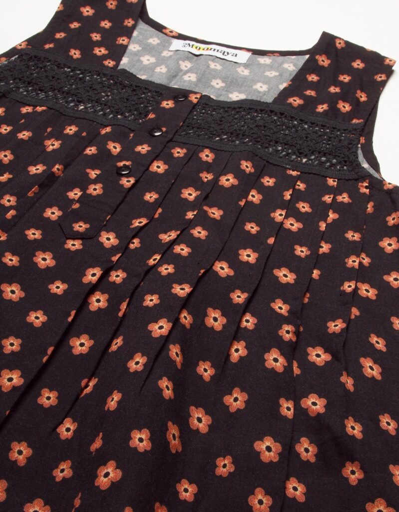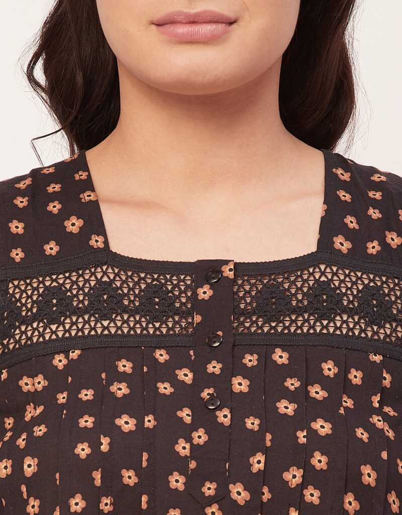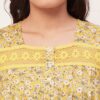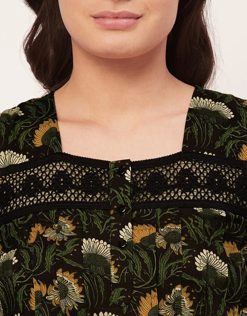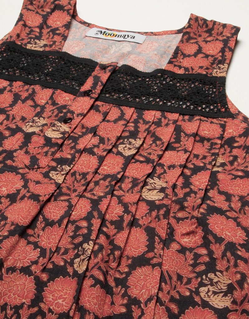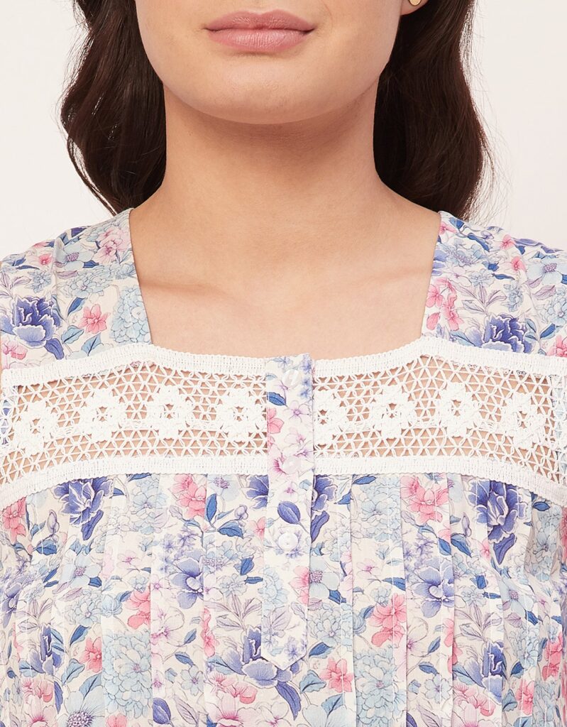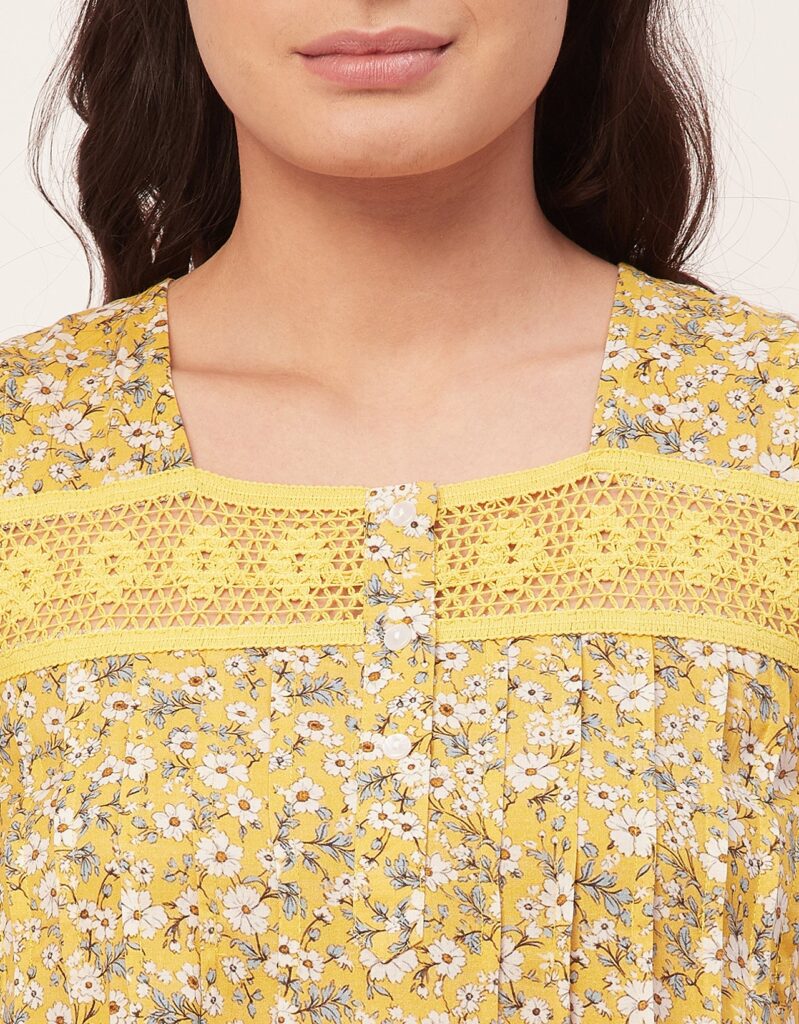 Features: Sleeveless, Square Neck, Lace Work On Yoke, Frill Flared Hem, Printed Pattern On All Over.