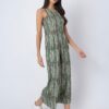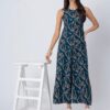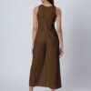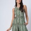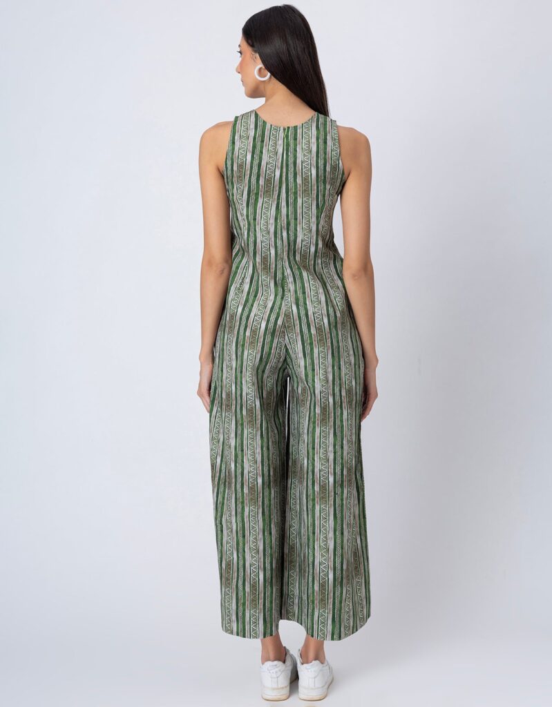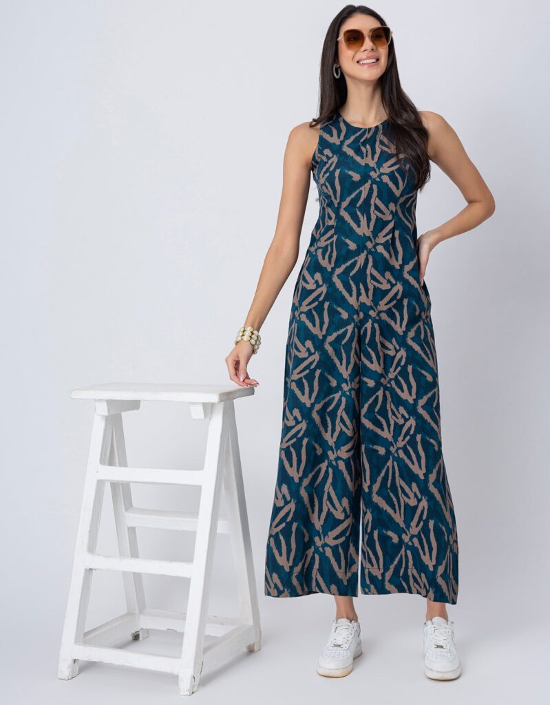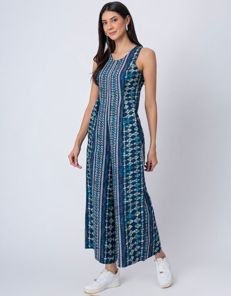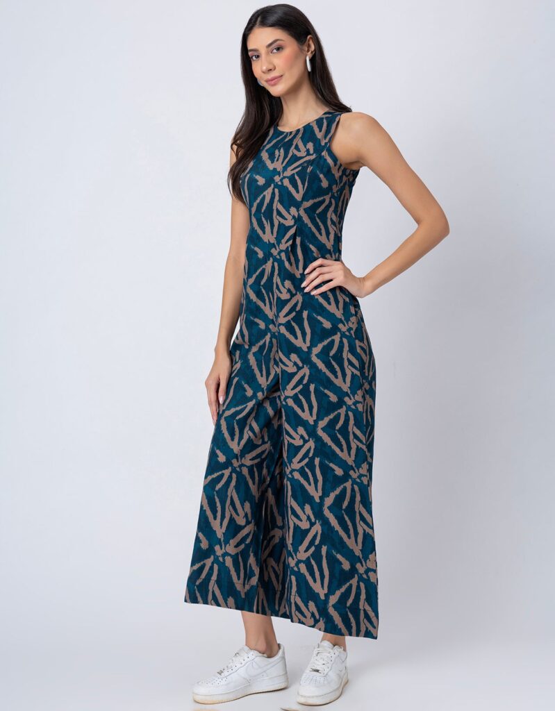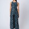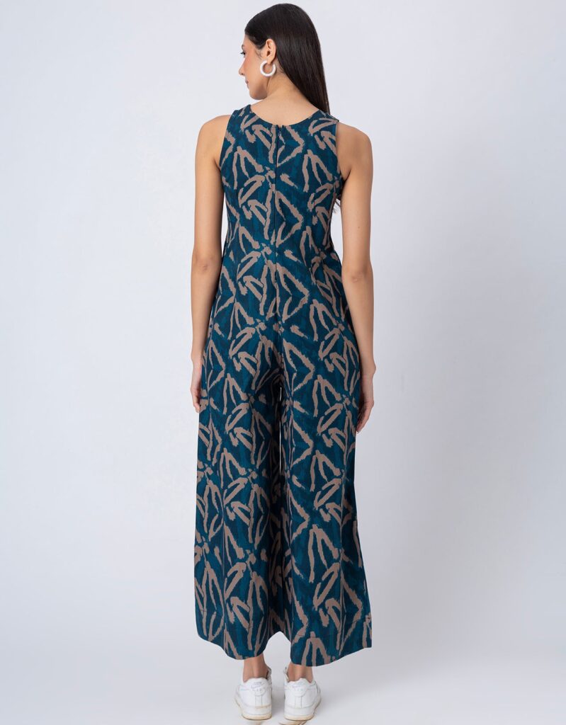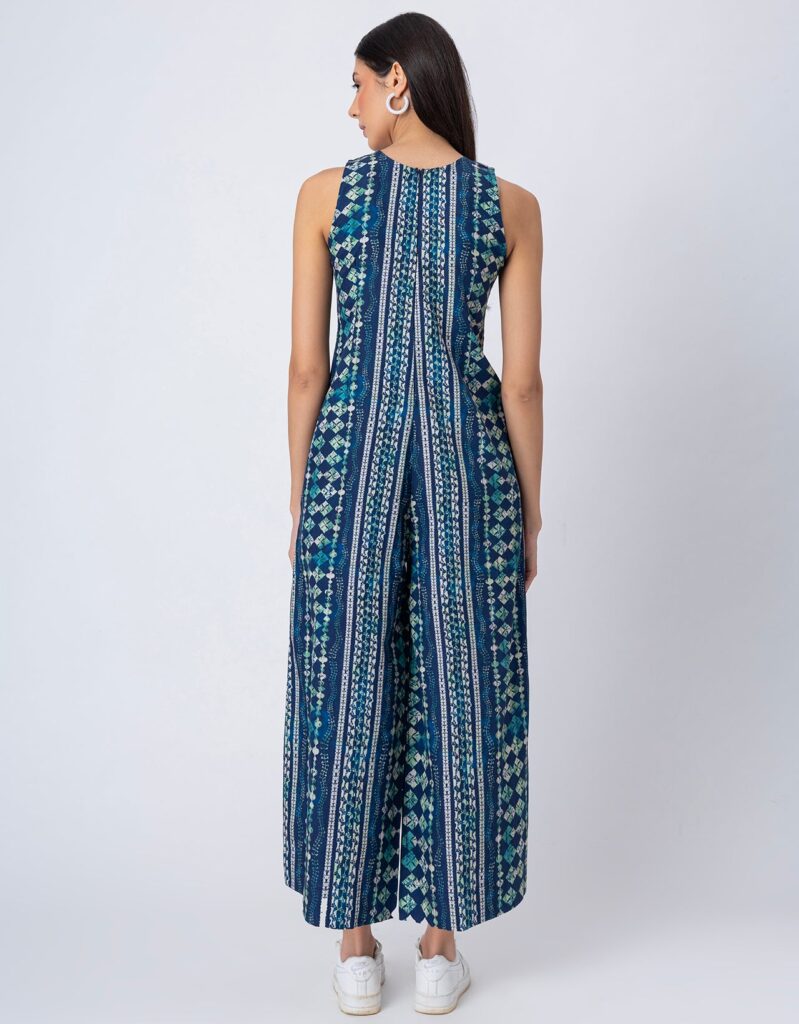 Features: Sleeveless printed jumpsuit with two pockets, a back zipper, relaxed fit, and lightweight design, featuring an all-over printed pattern for a stylish and comfortable look.
