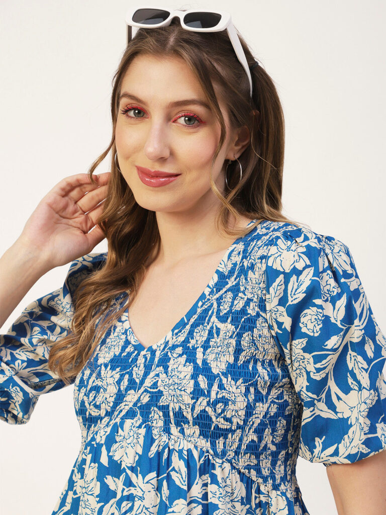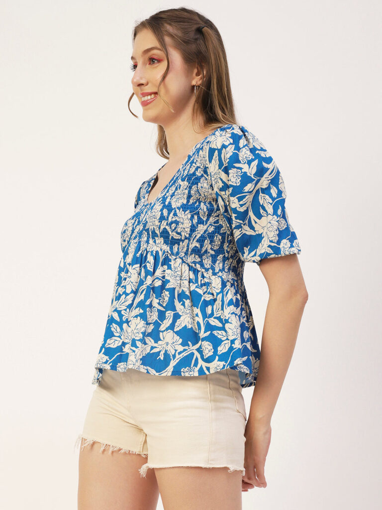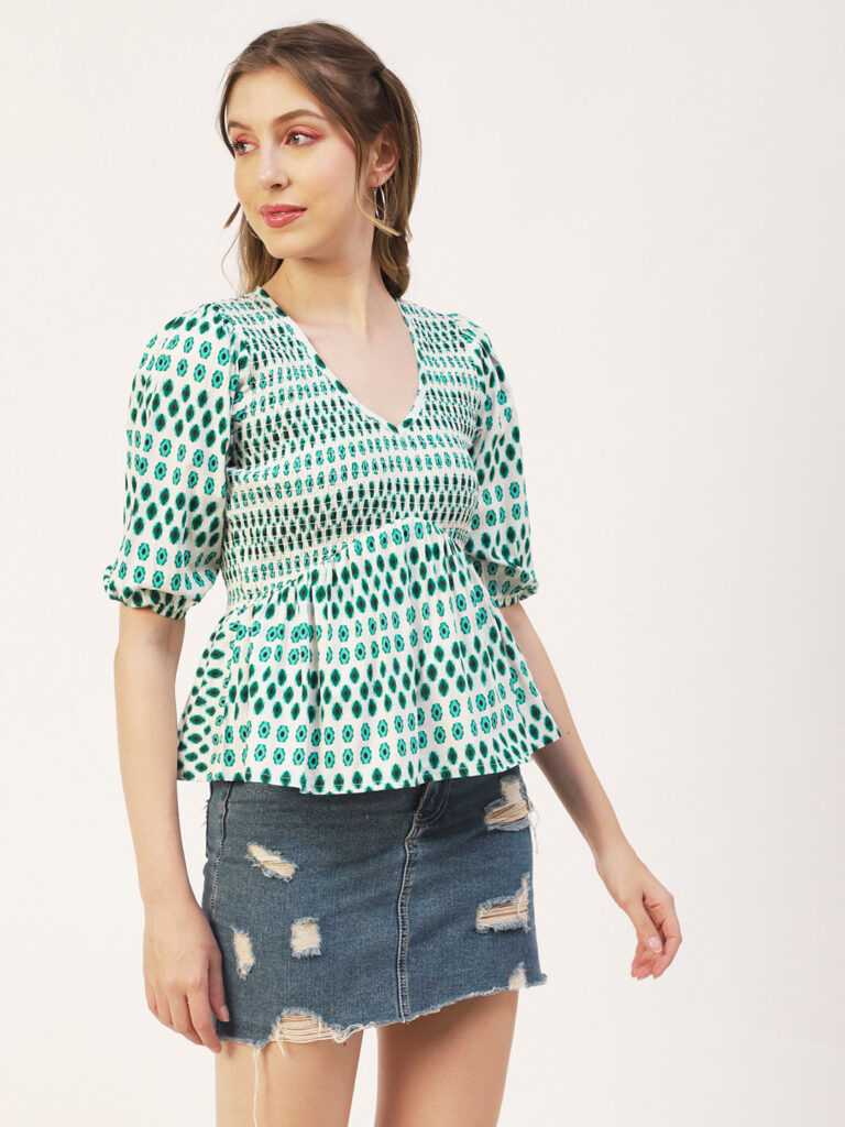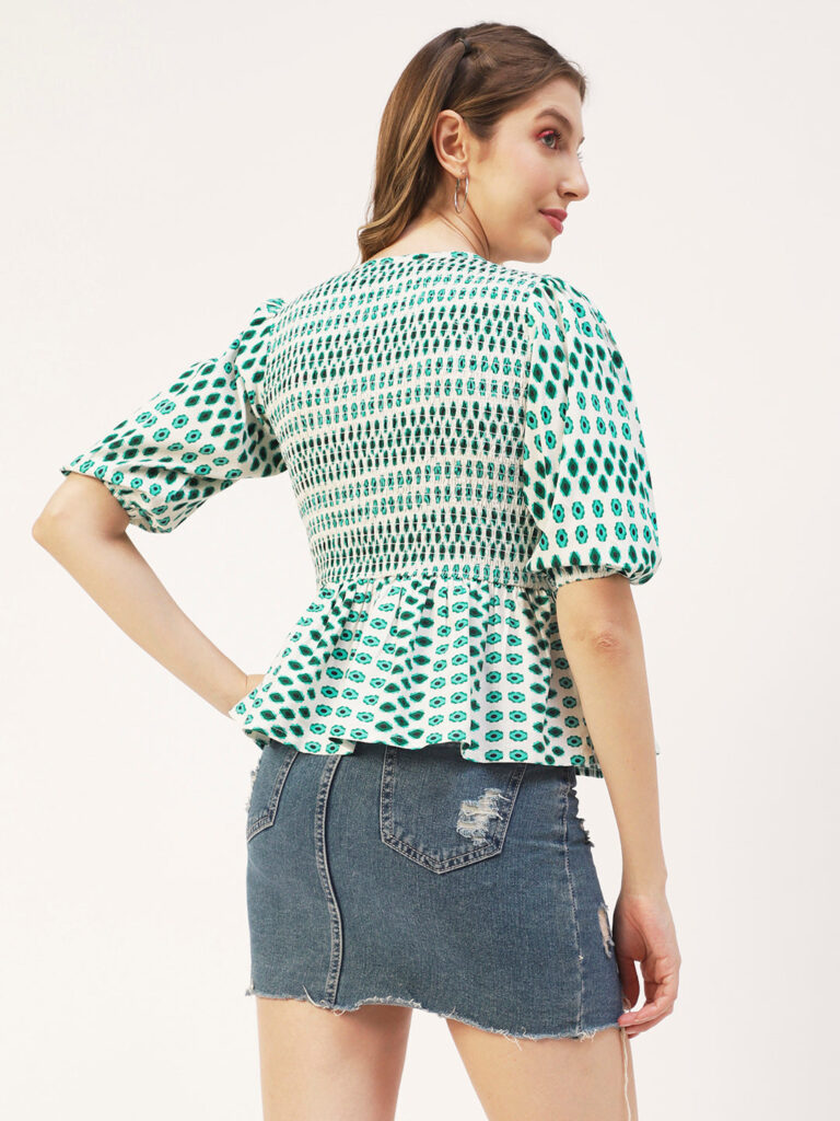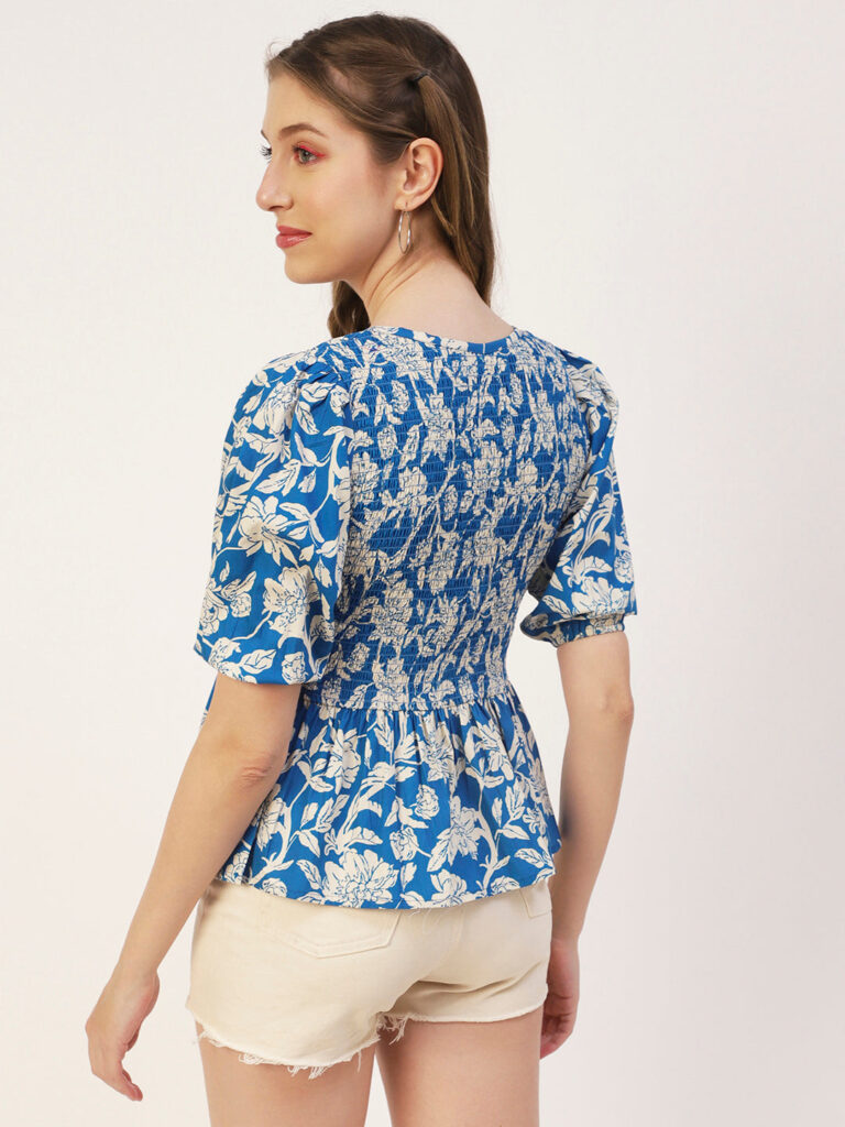 Features: puffed elbow sleeves, waist length, V neck, smocked, lightweight and all over printed pattern