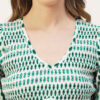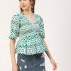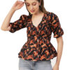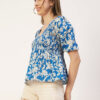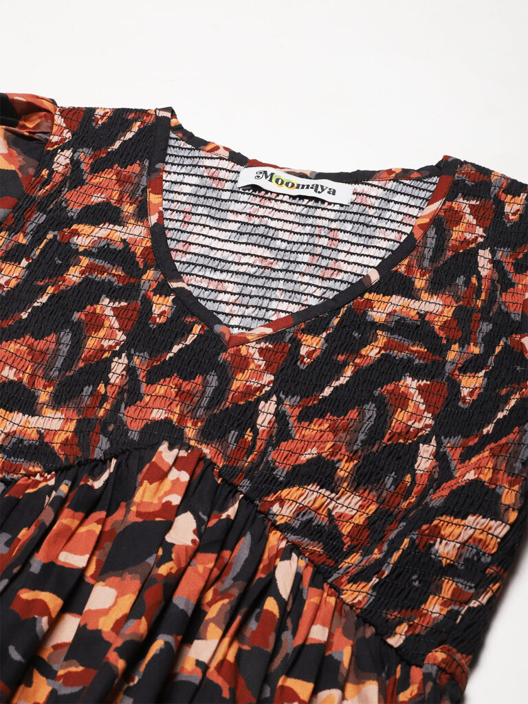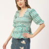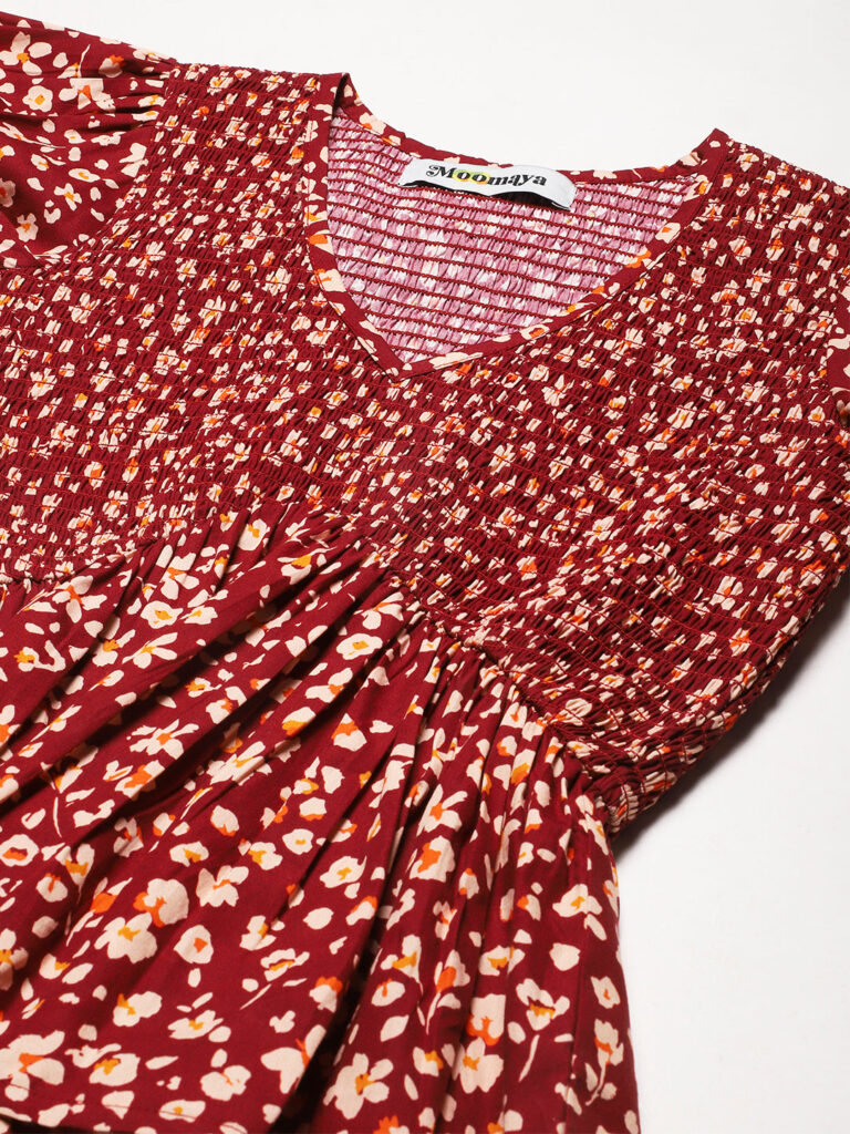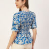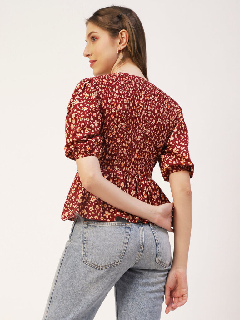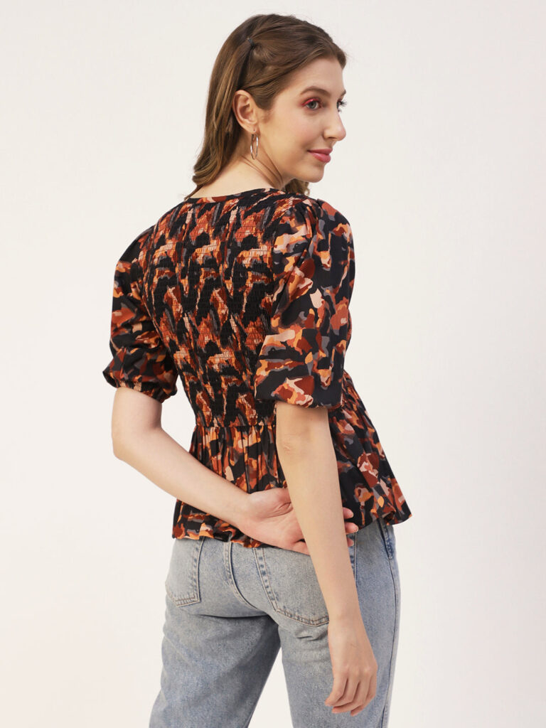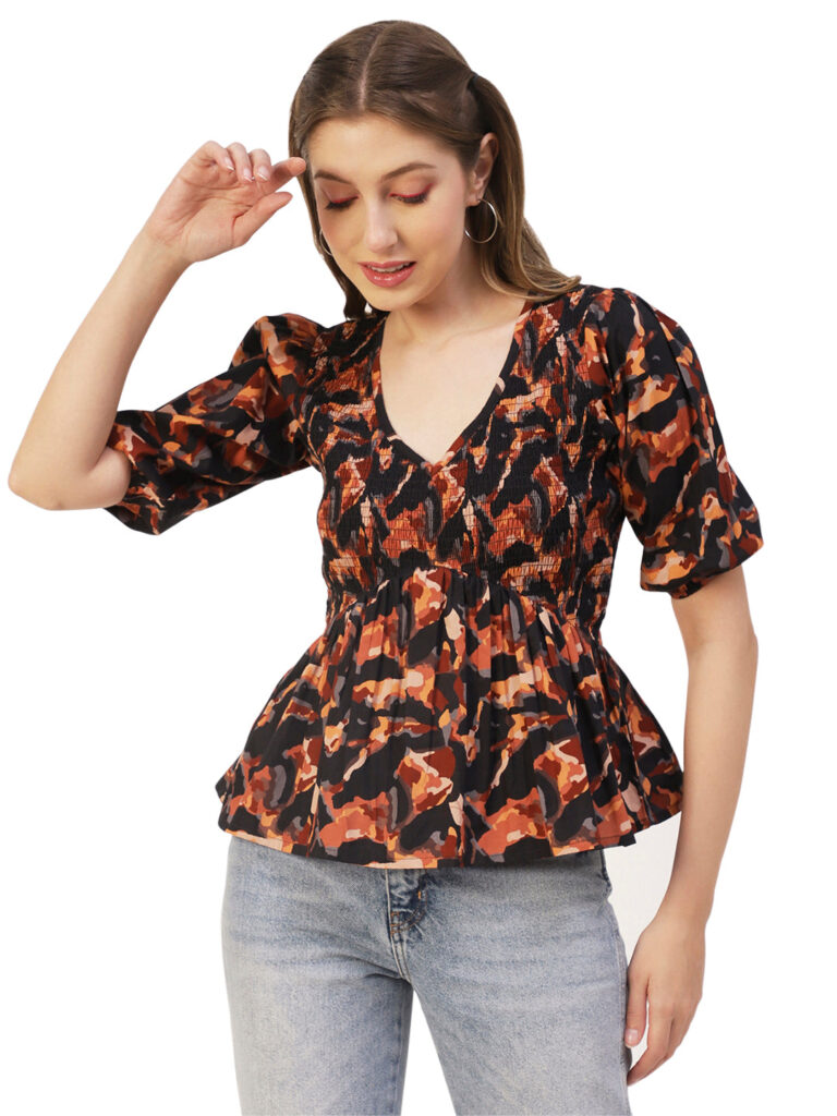 Features: puffed elbow sleeves, waist length, V neck, smocked, lightweight and all over printed pattern