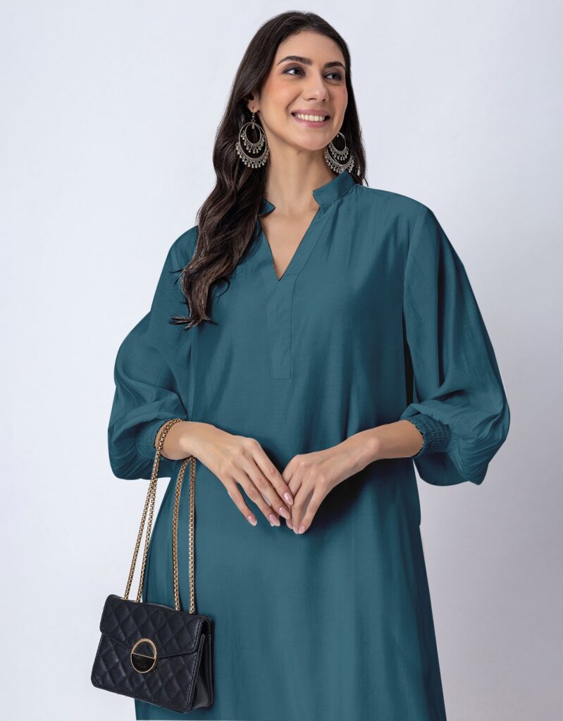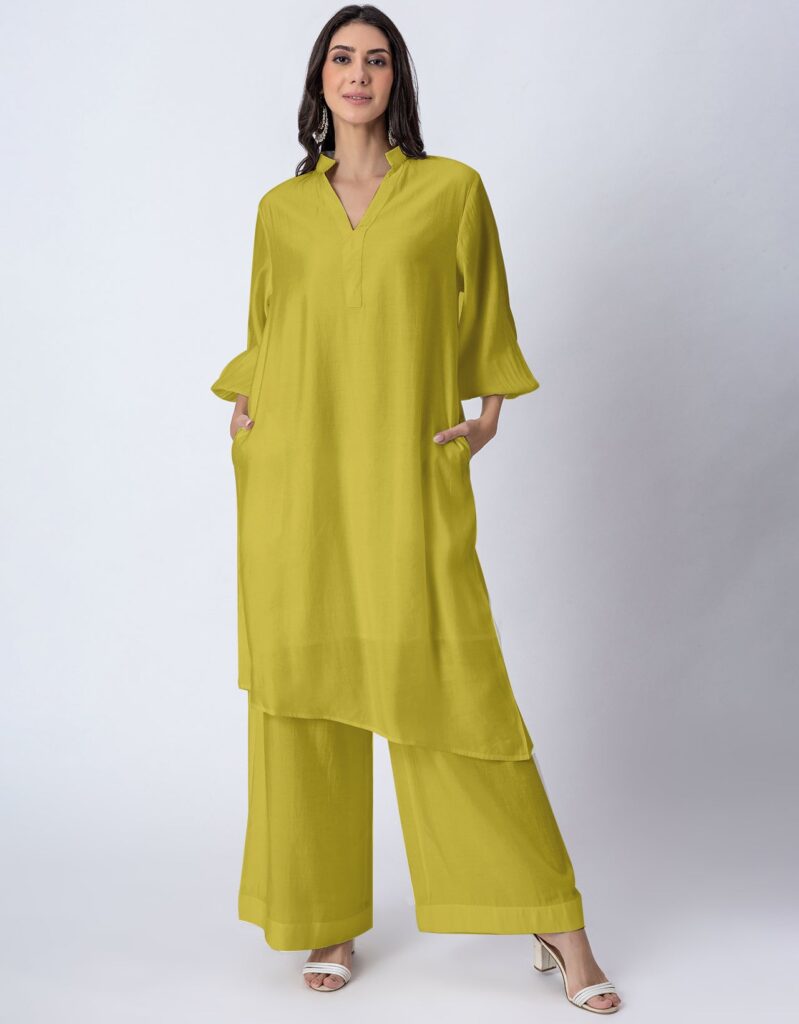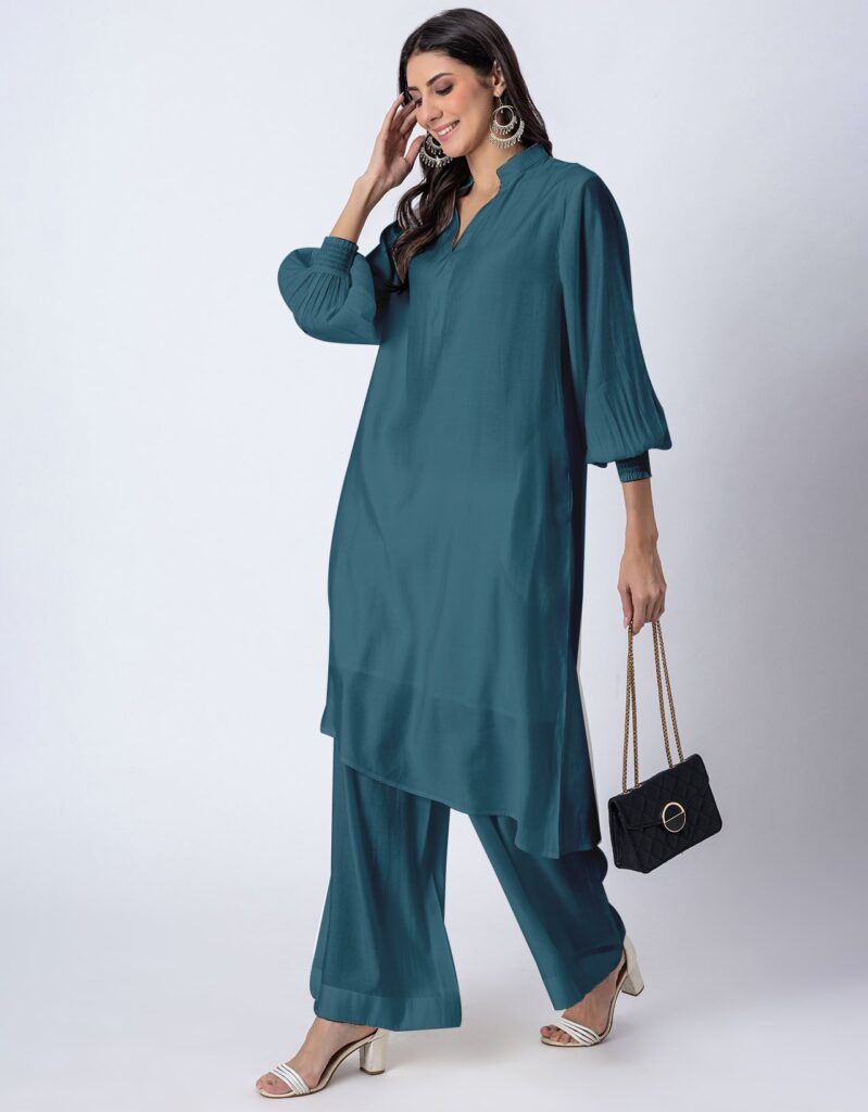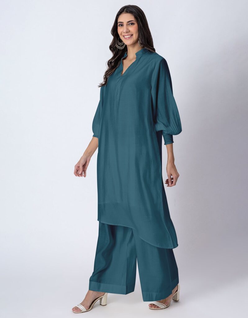 Solid Puffed Sleeve Women Kurta with Flared Palazzo Pantsshop
