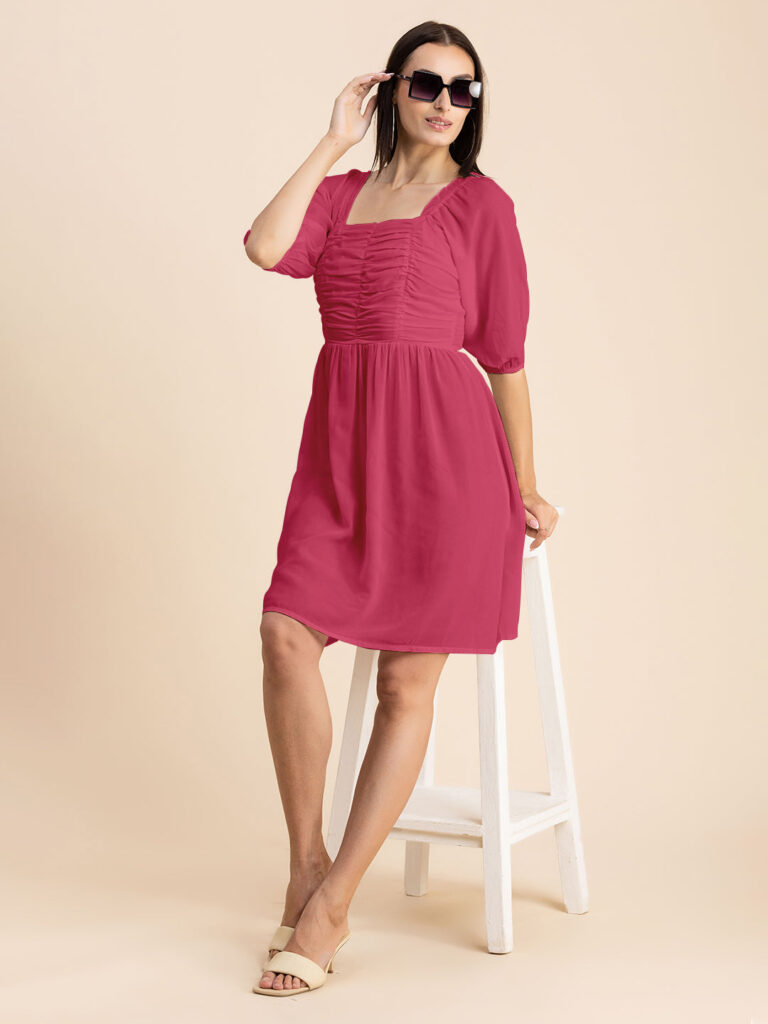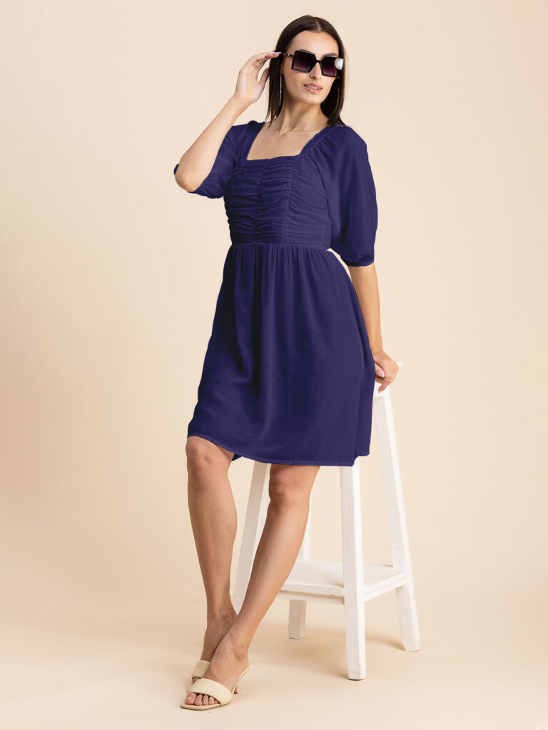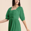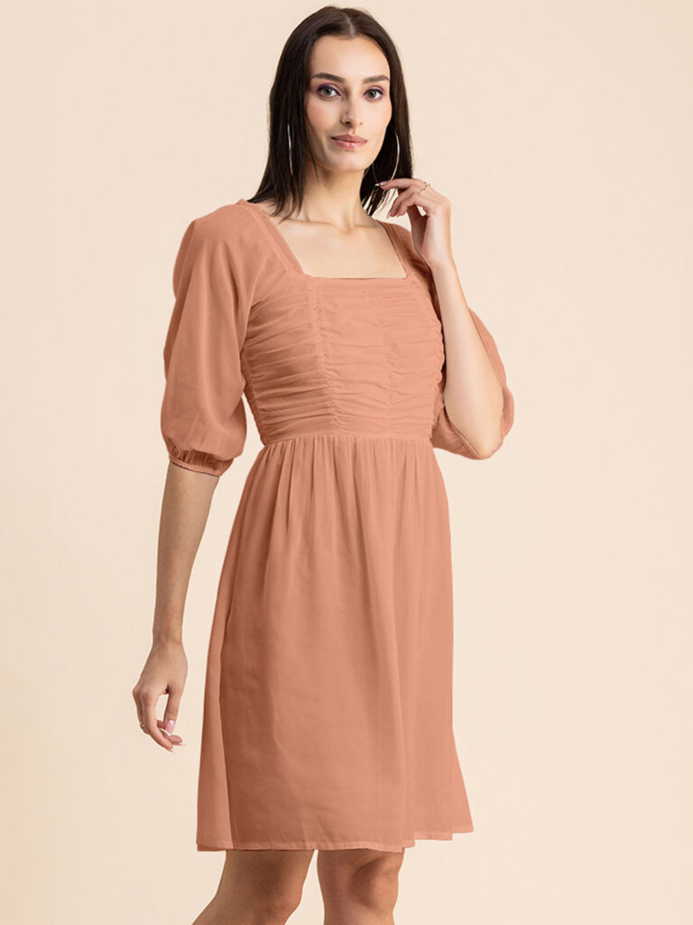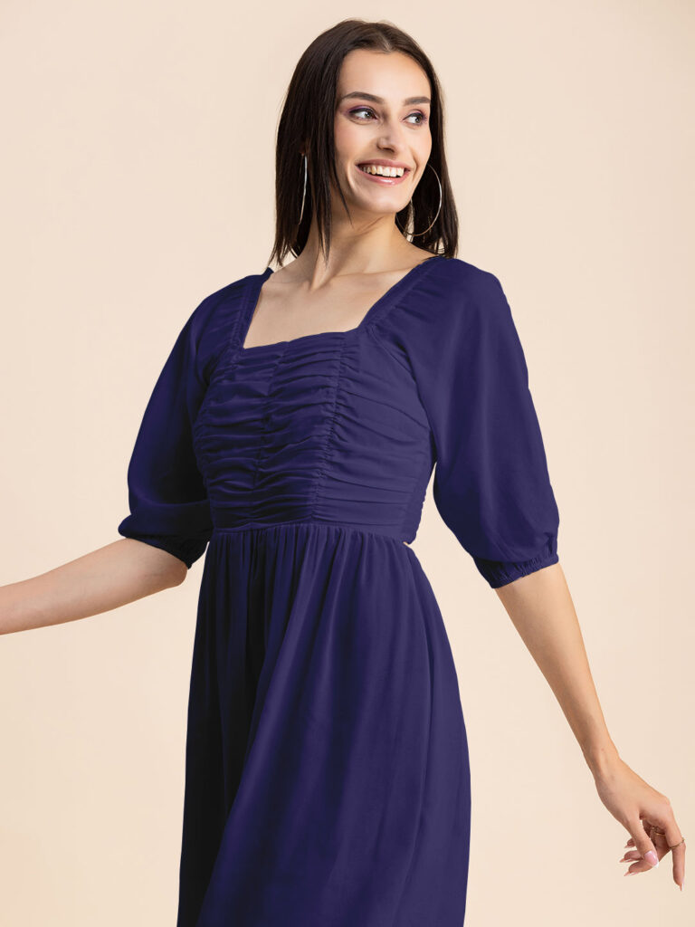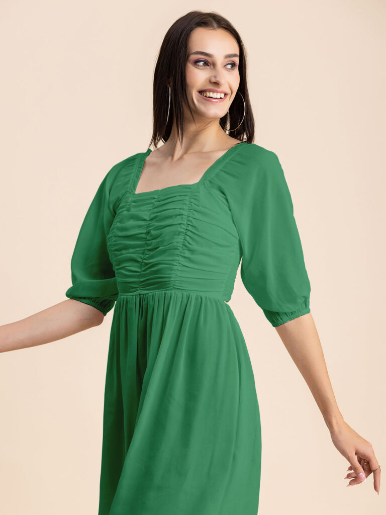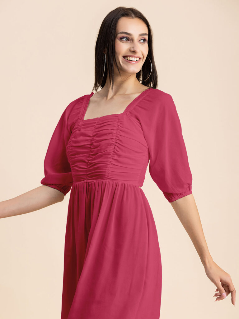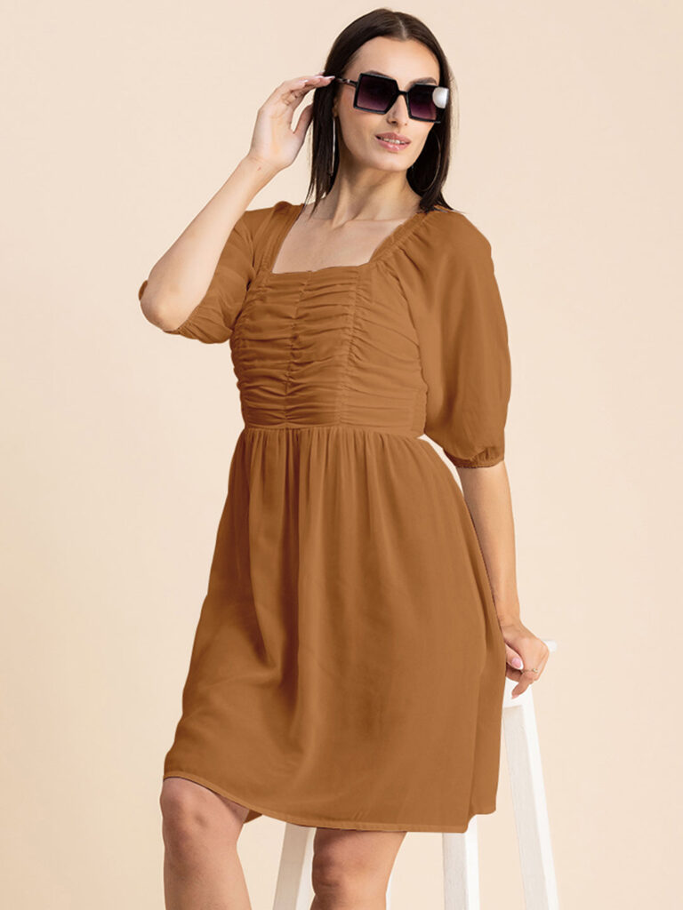 Features: Square Neck, Elbow Sleeves, Knee Length, Ruched Pattern, Lightweight And Solid Pattern