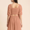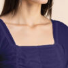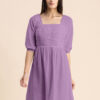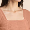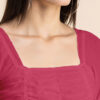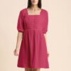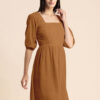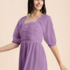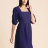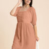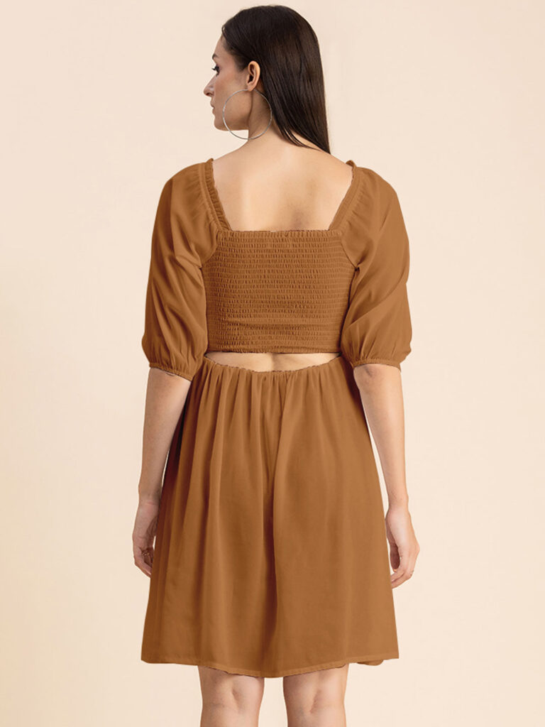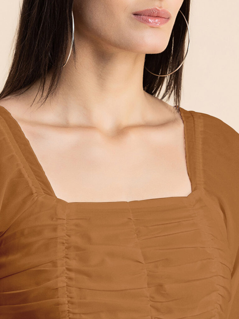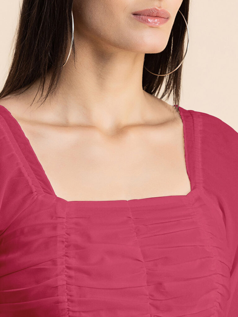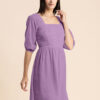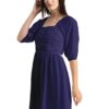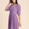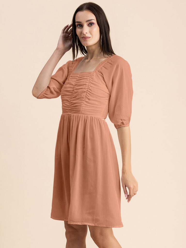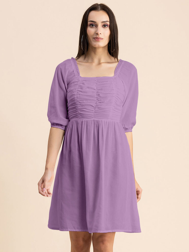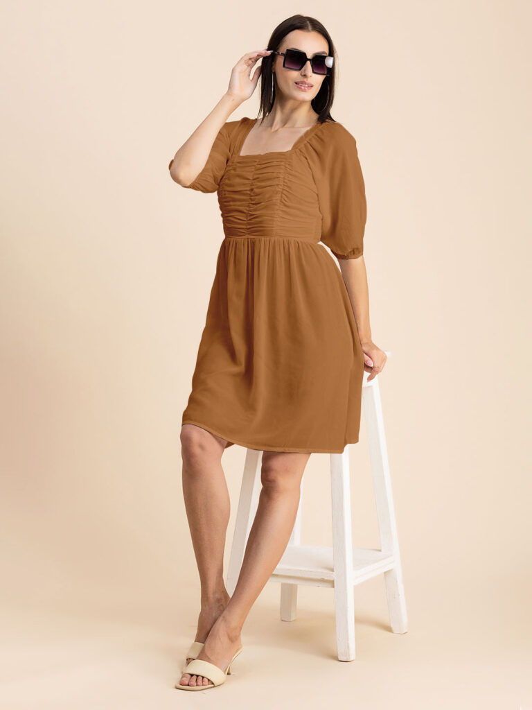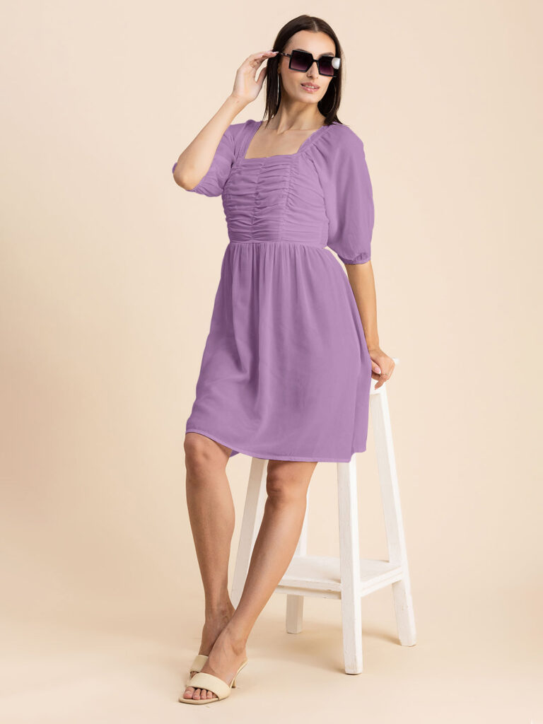 Features: Square Neck, Elbow Sleeves, Knee Length, Ruched Pattern, Lightweight And Solid Pattern