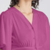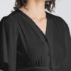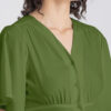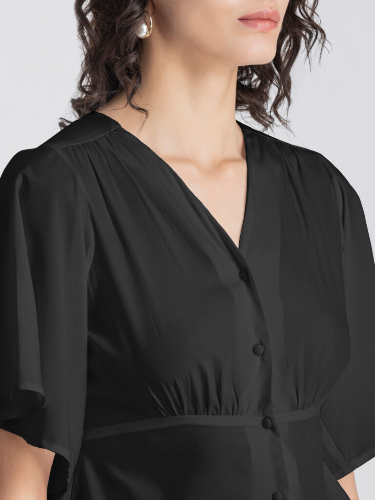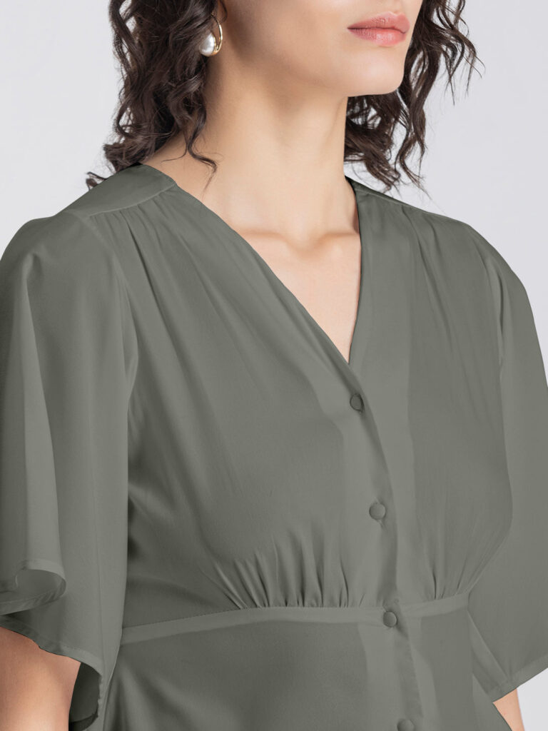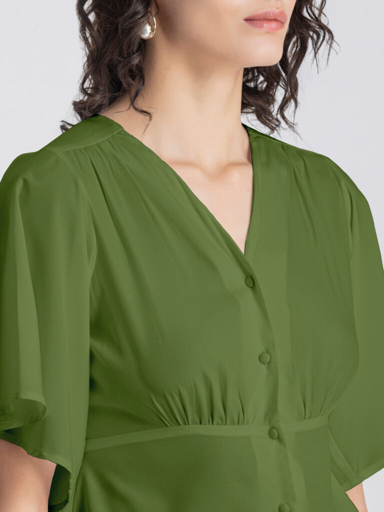 Features: V Neck, Buttoned Placket, Flutter Sleeves, Lightweight And Solid Pattern