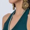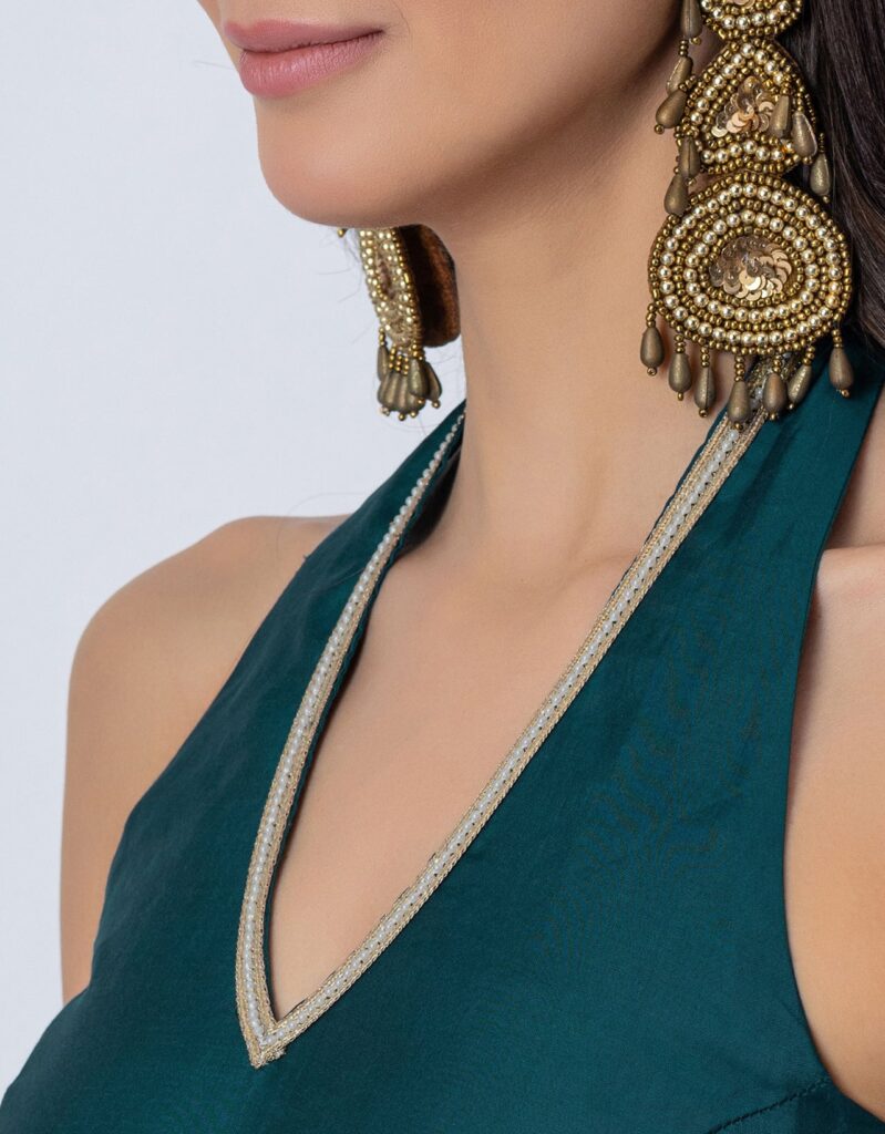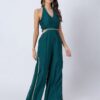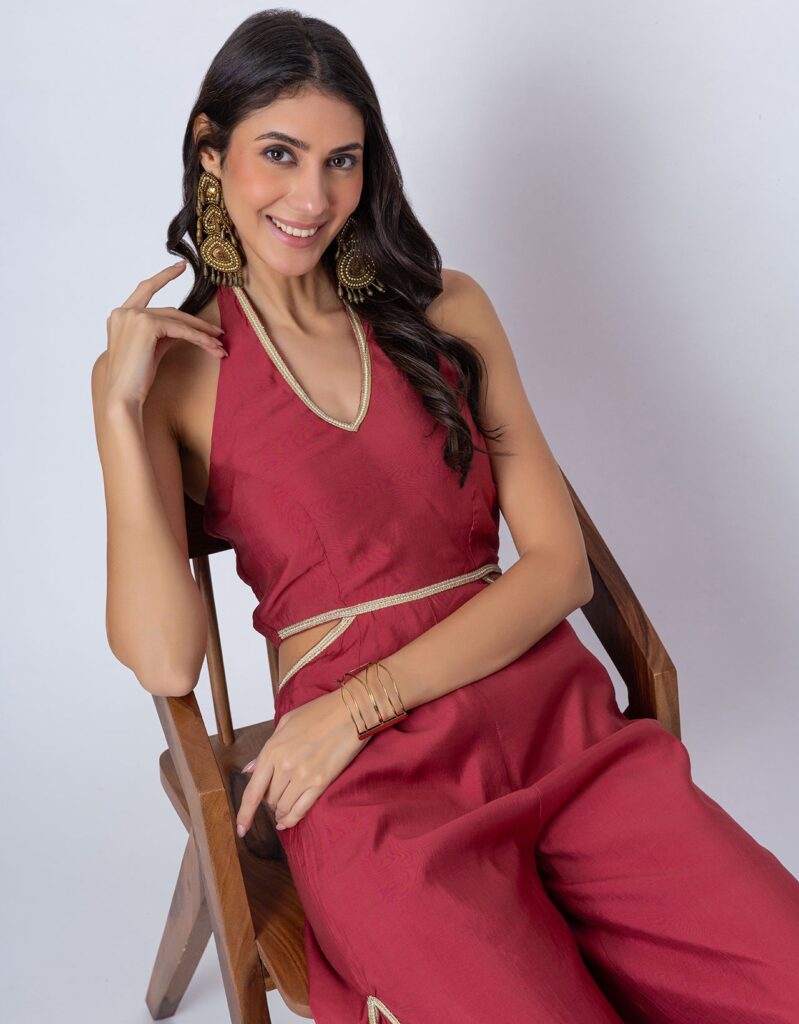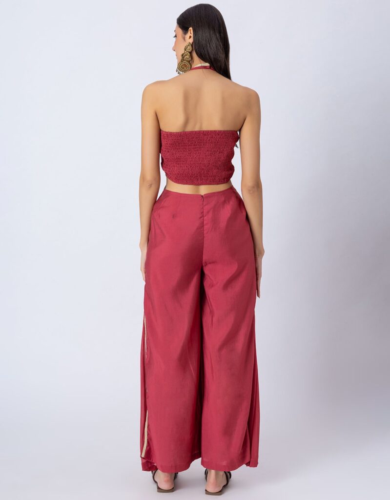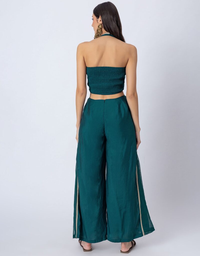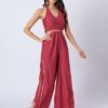 Features: Sleeveless halter V-neck jumpsuit with cutout details, featuring a smocked back for added comfort and a concealed zipper closure. Designed with georgette fabric pleats on the bottom side of the wide-leg pants, decked with lace details, it blends Indo-Western style with a contemporary silhouette.