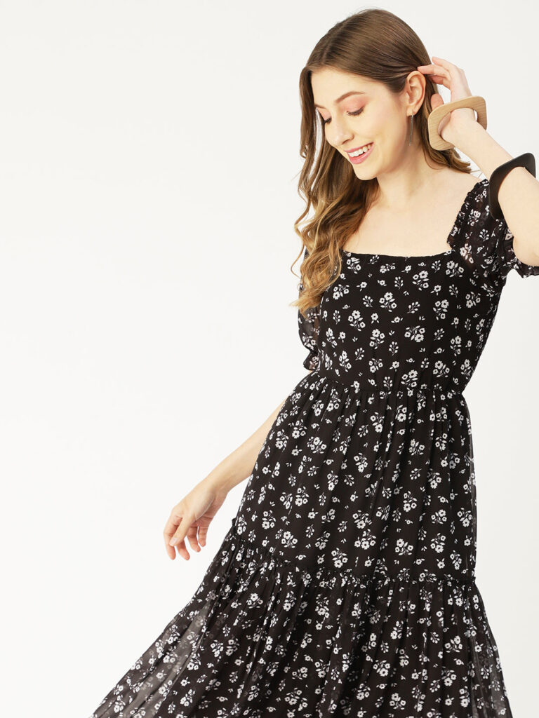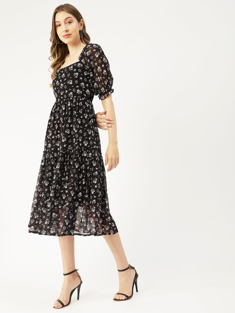 Features: elbow sleeves, tiered hem, square neck, smocked, calf length, lightweight and all over Solid pattern