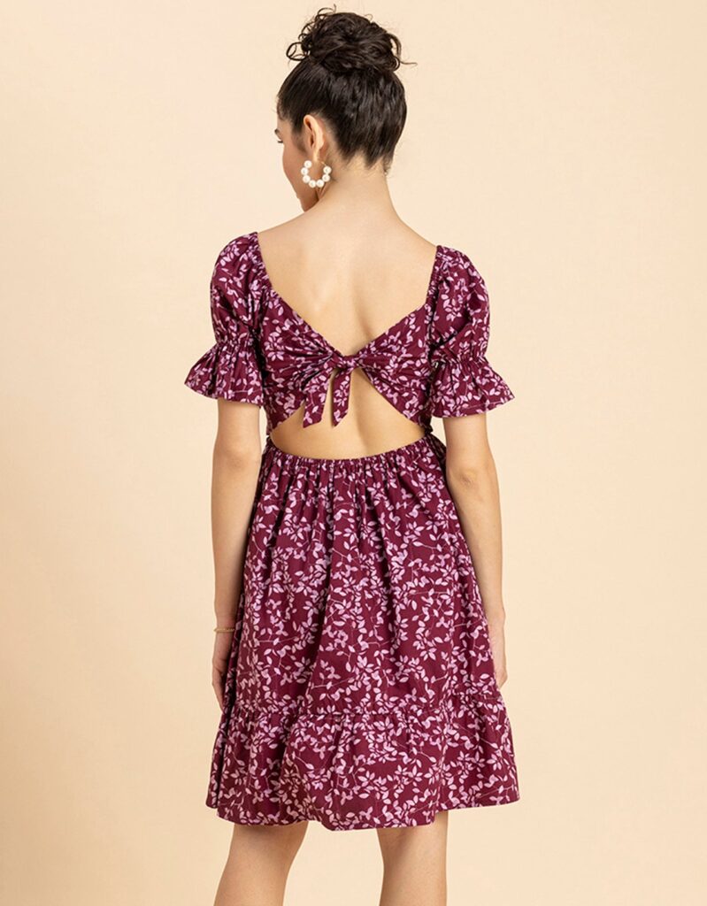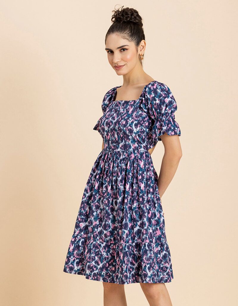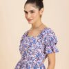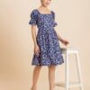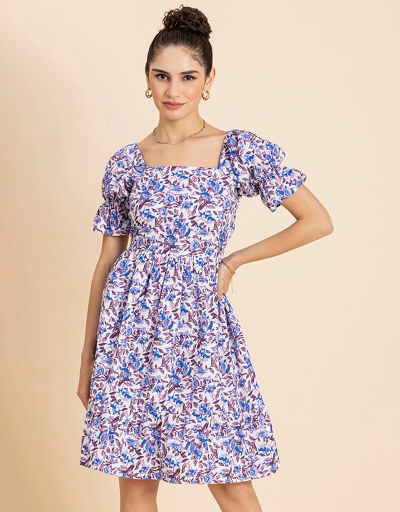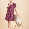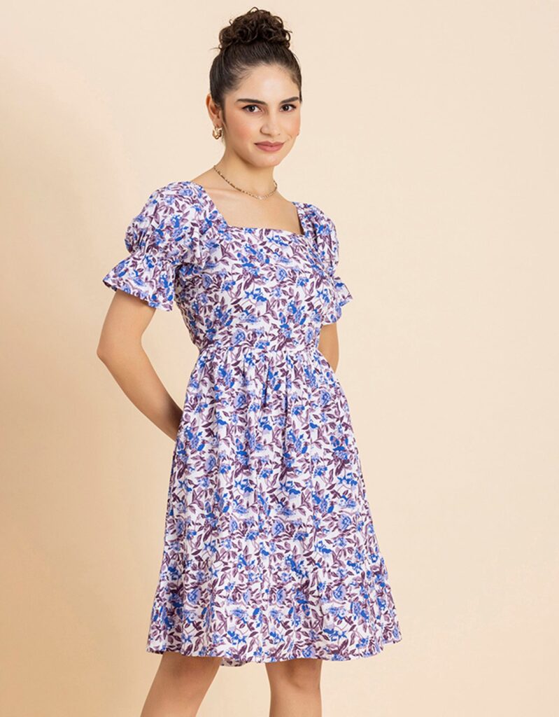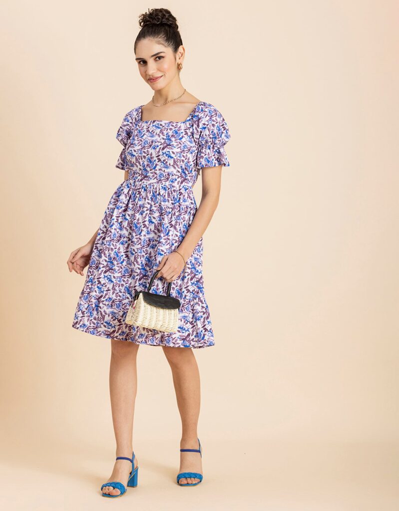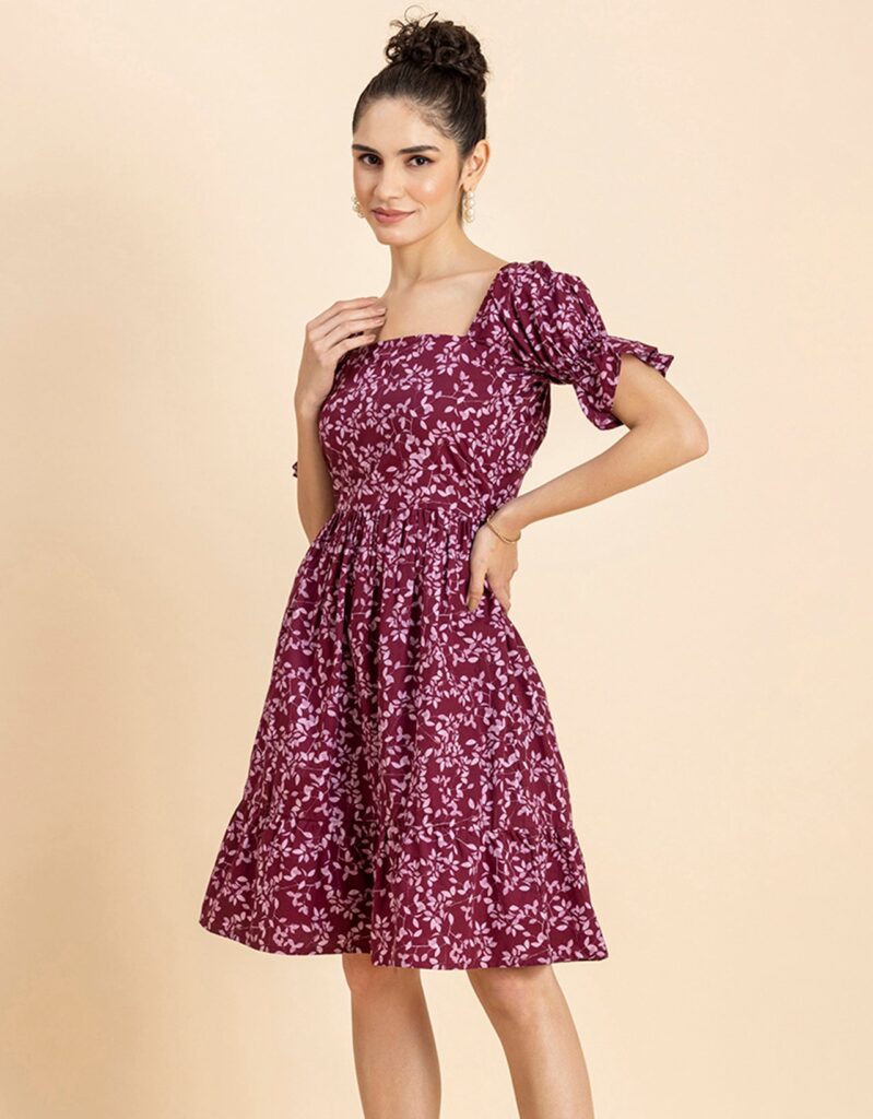 Features: Square Neck, Short Puffed Sleeves, Tiered Hem, Knee Length, Lightweight And All Over Printed Pattern