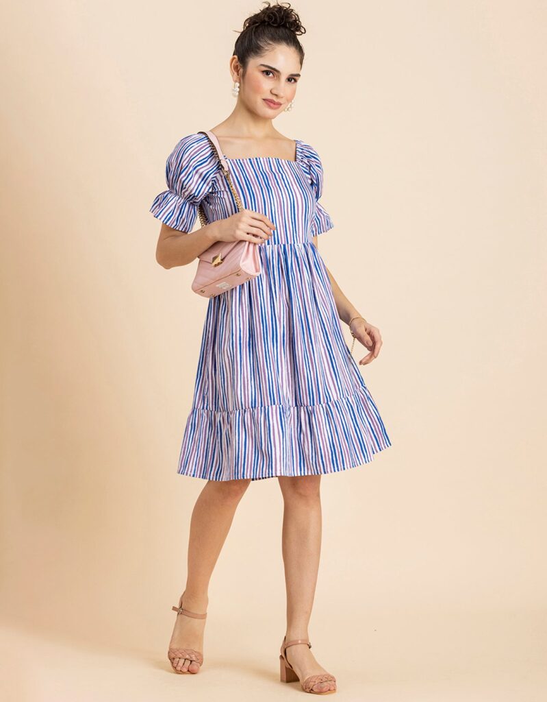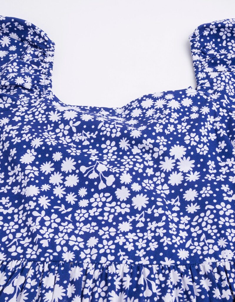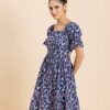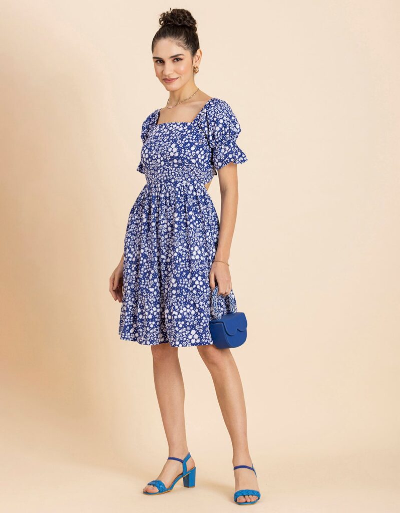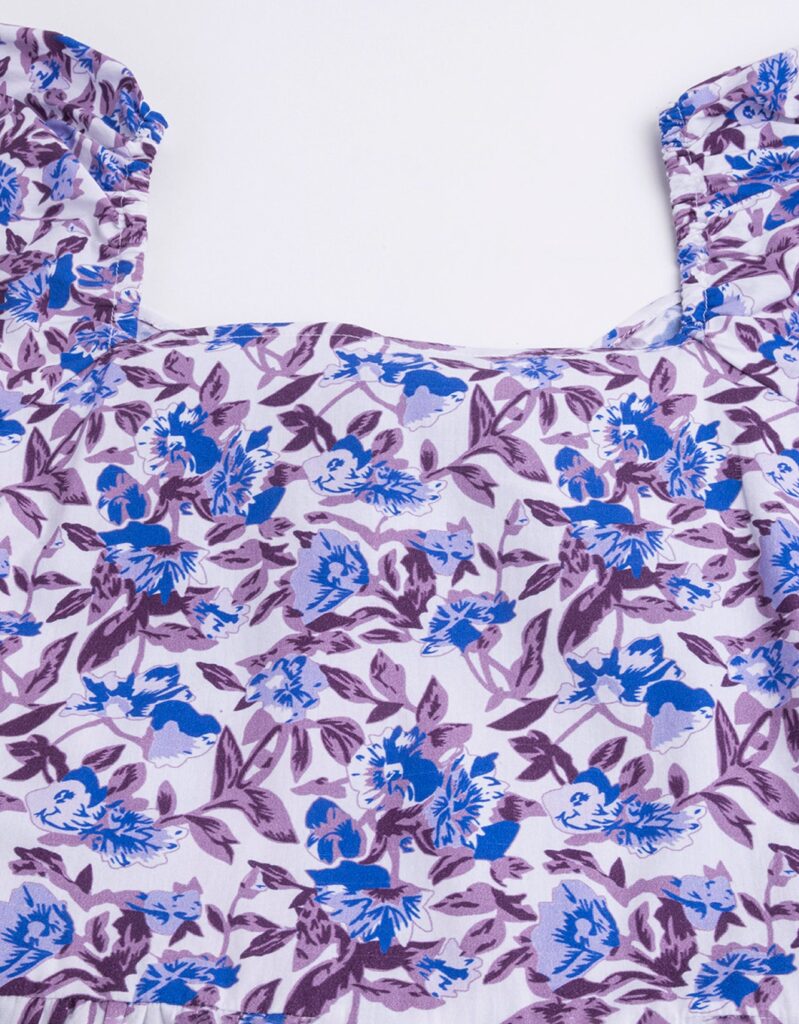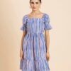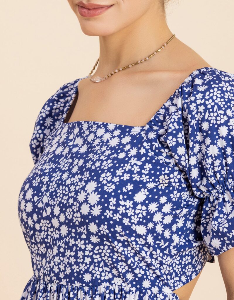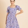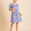 Features: Square Neck, Short Puffed Sleeves, Tiered Hem, Knee Length, Lightweight And All Over Printed Pattern