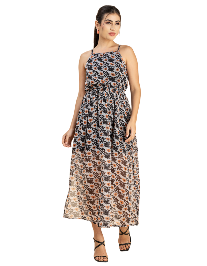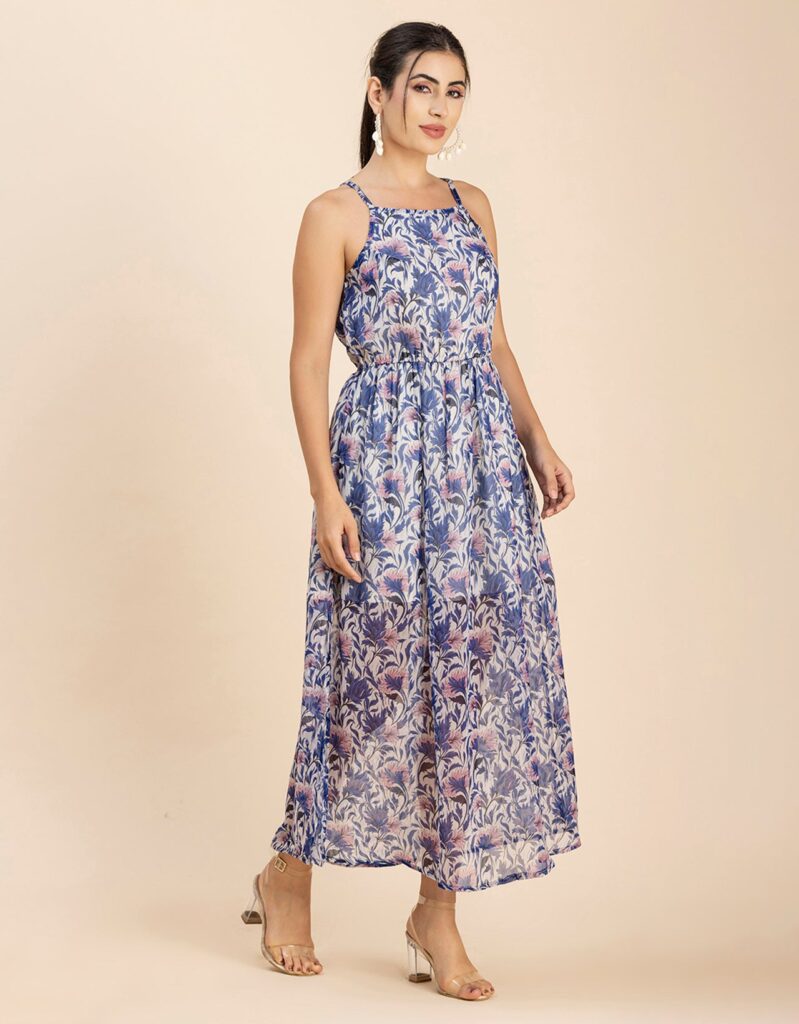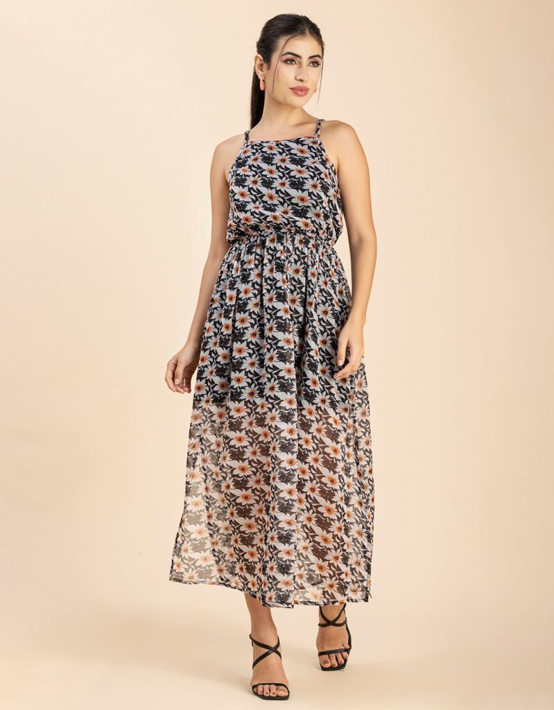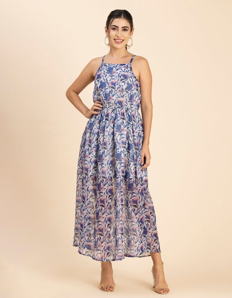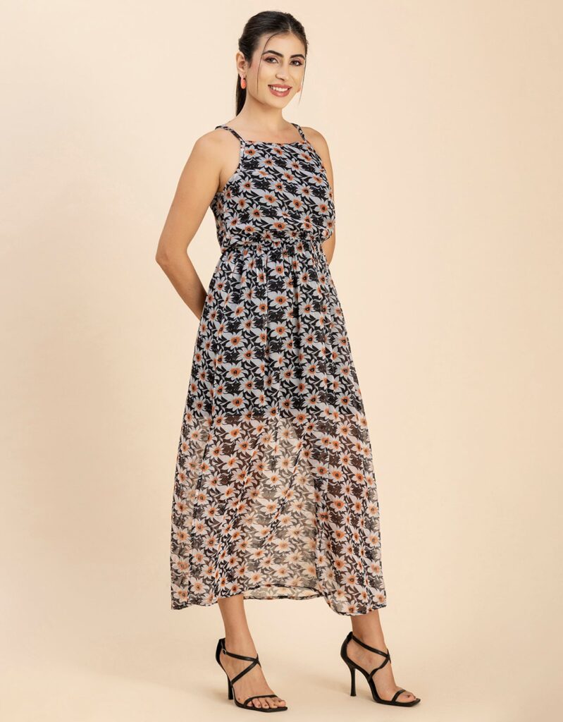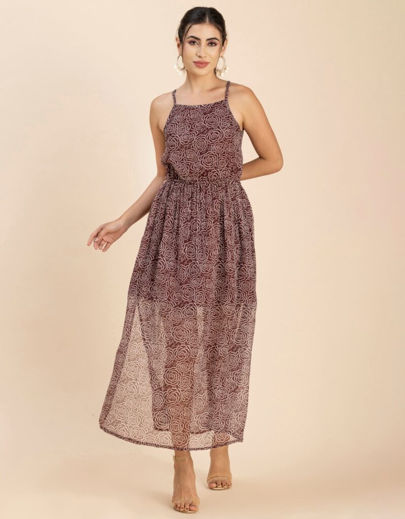 Features: Strap Shoulders, Square Neck, Elastic Waist, Calf Length, Lightweight And All Over Printed Pattern