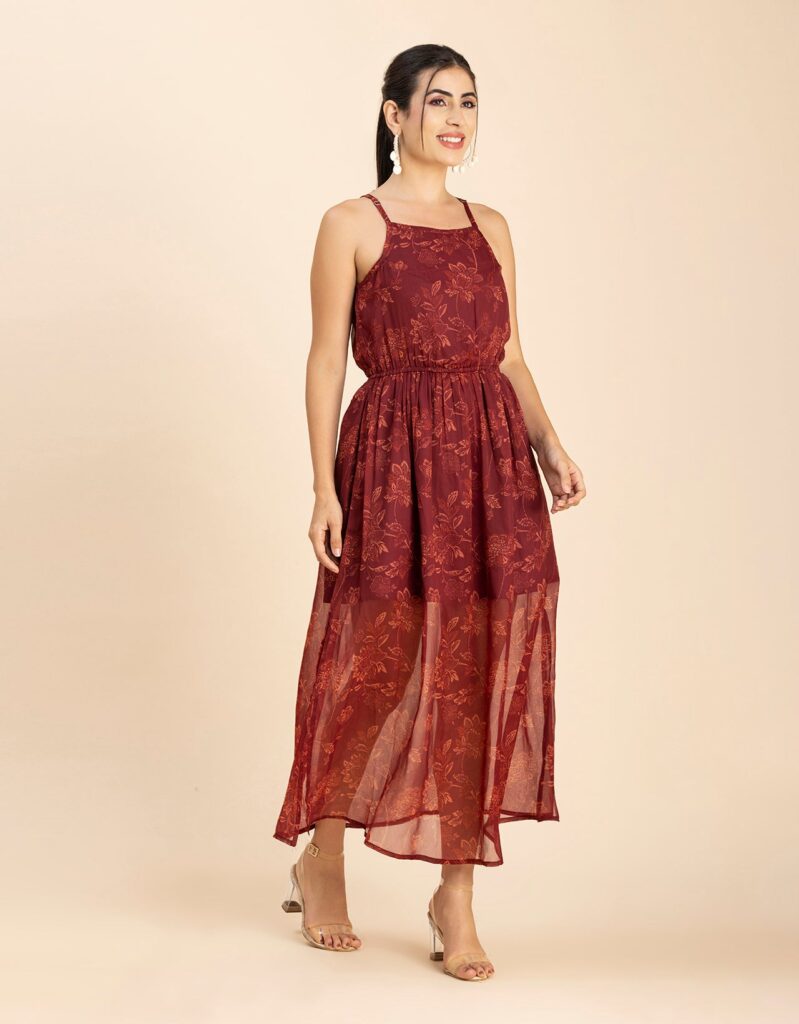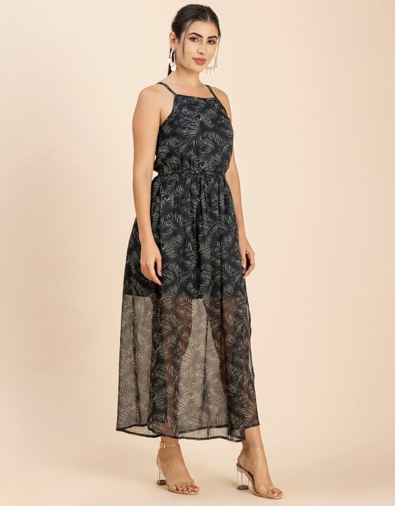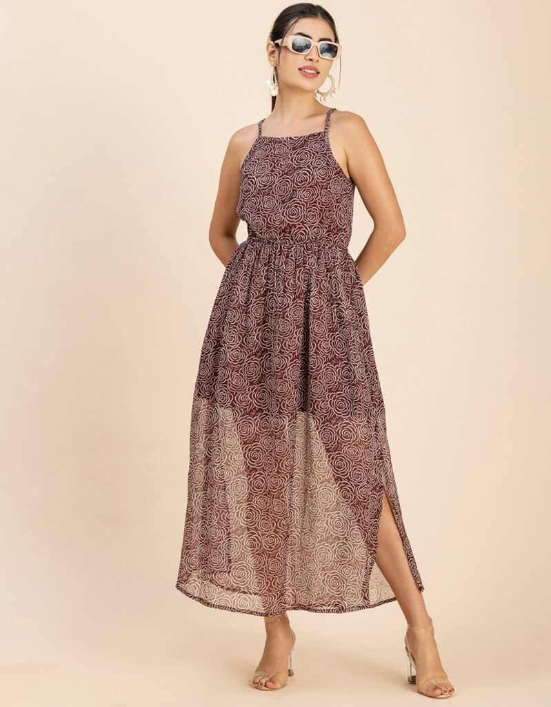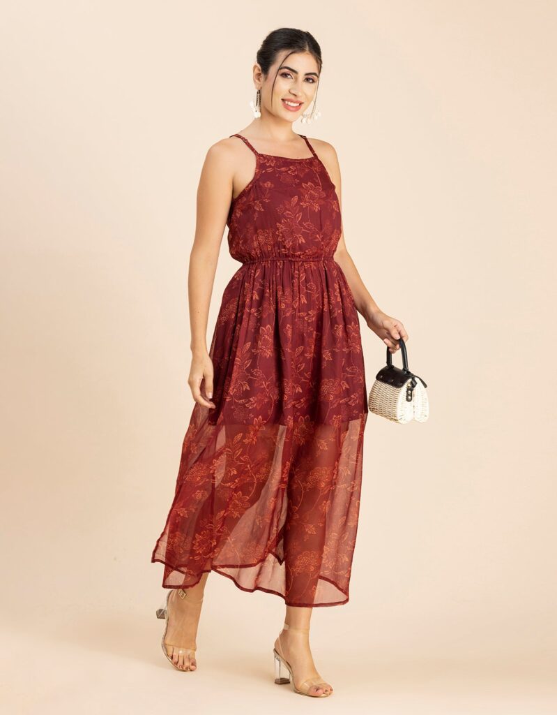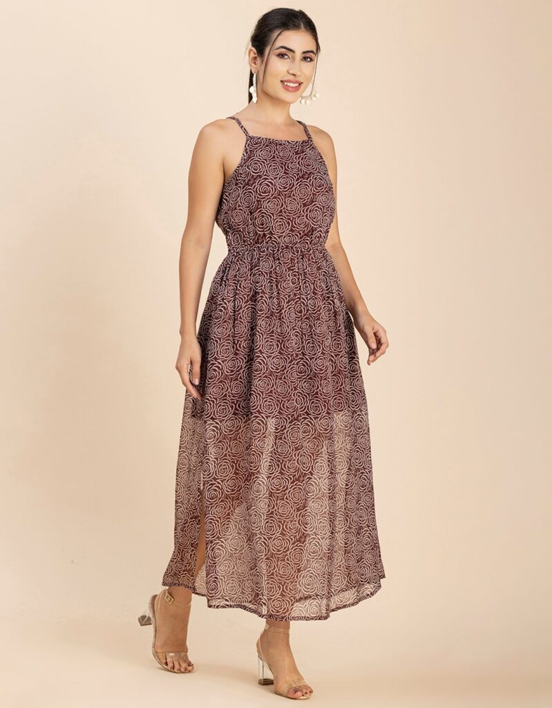 Features: Strap Shoulders, Square Neck, Elastic Waist, Calf Length, Lightweight And All Over Printed Pattern