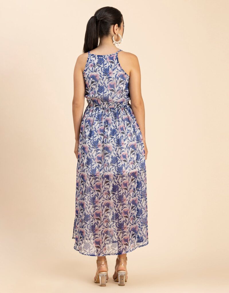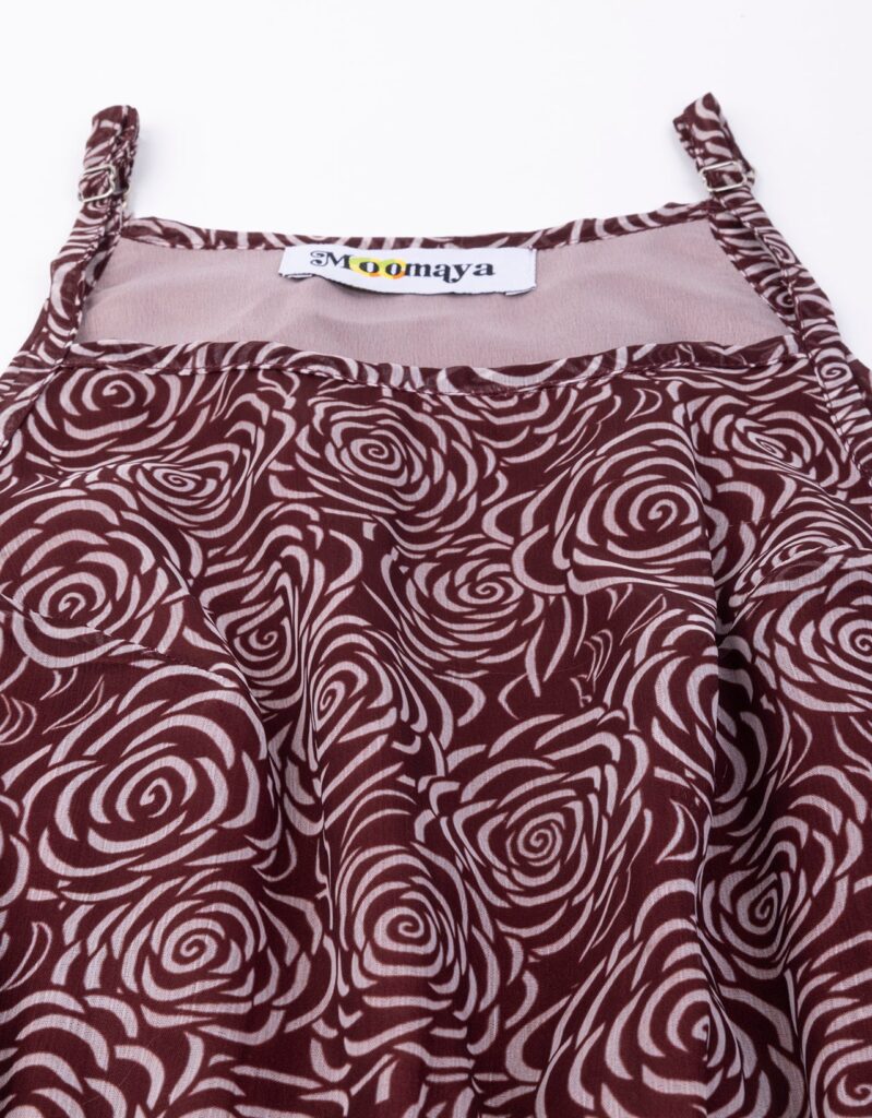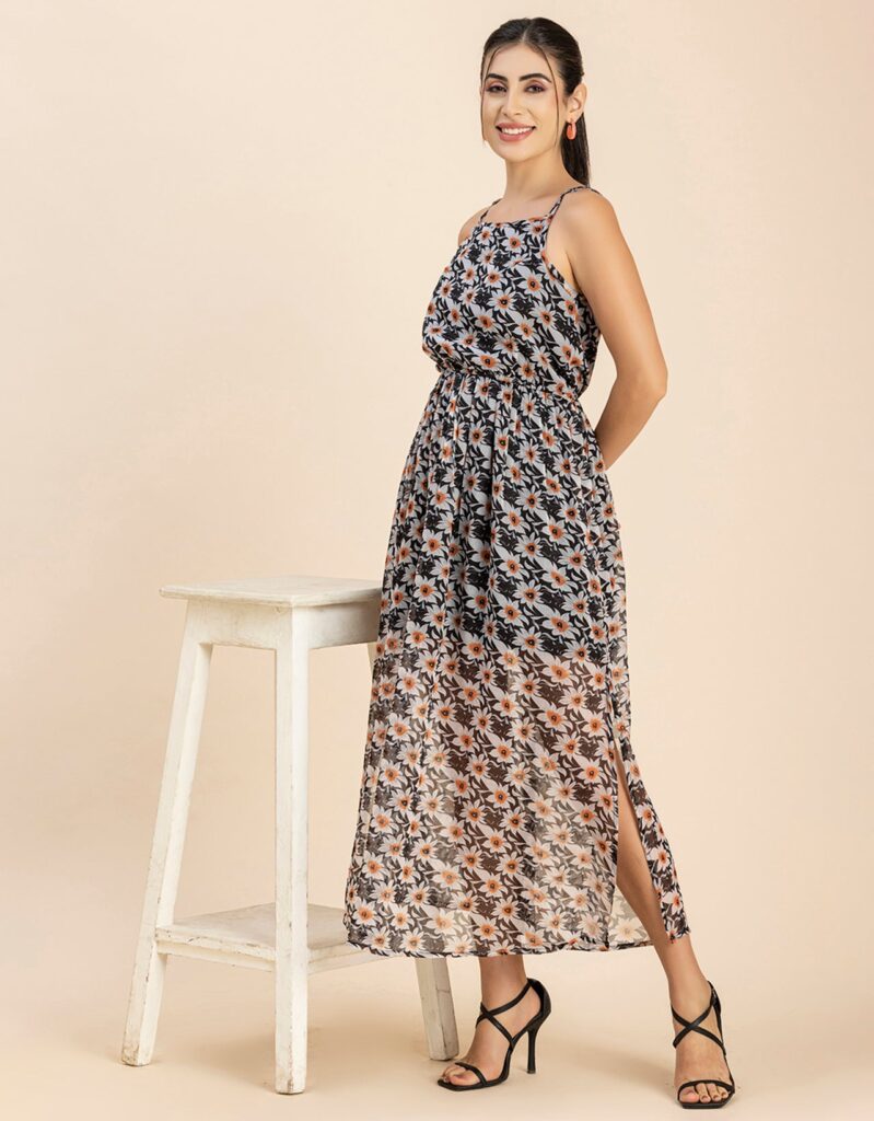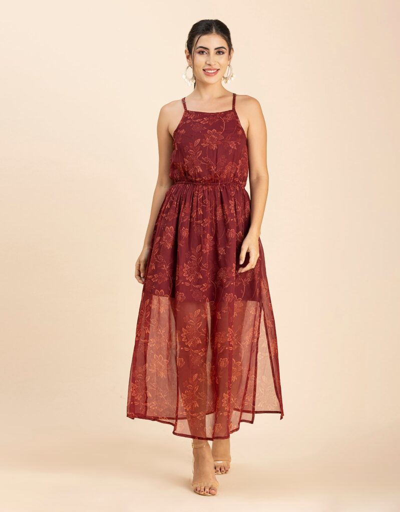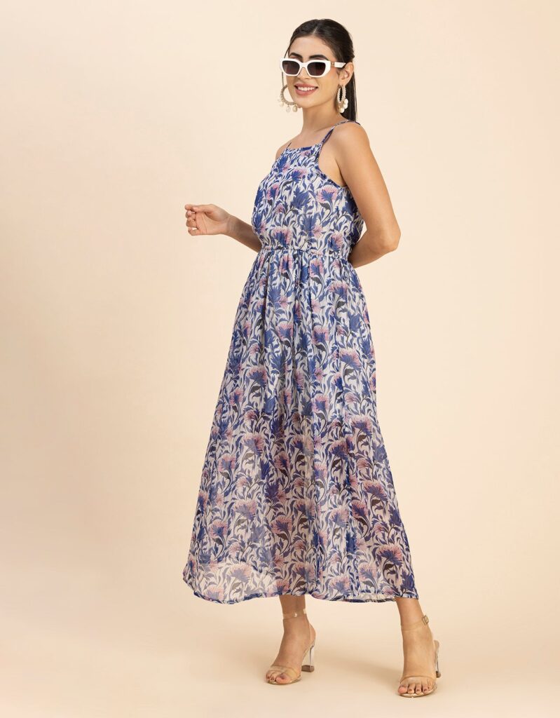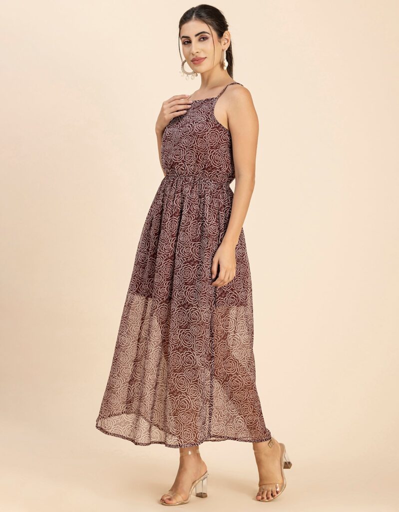 Features: Strap Shoulders, Square Neck, Elastic Waist, Calf Length, Lightweight And All Over Printed Pattern