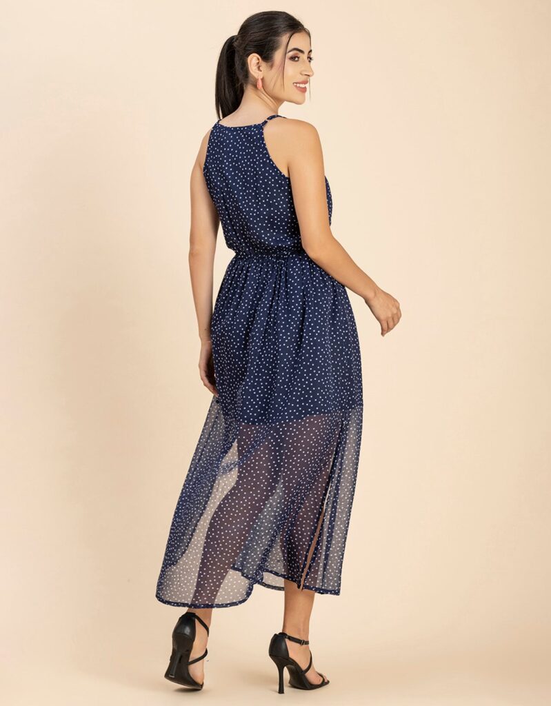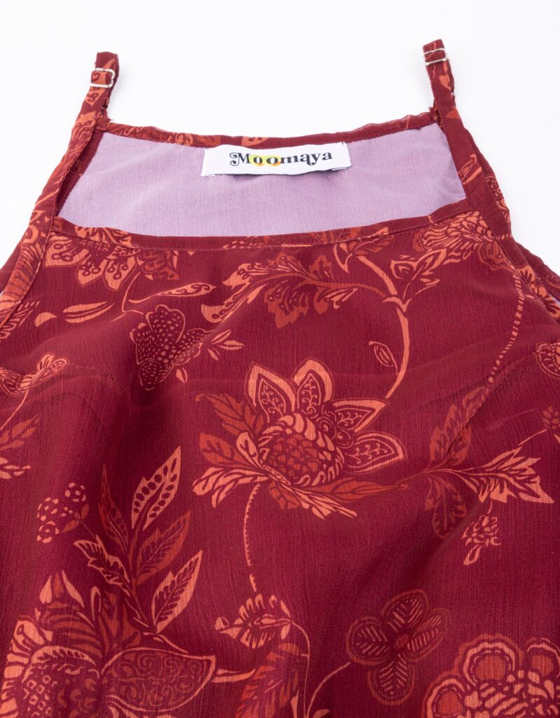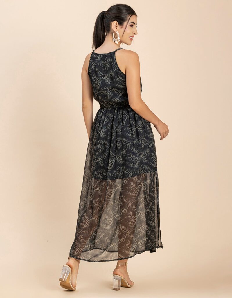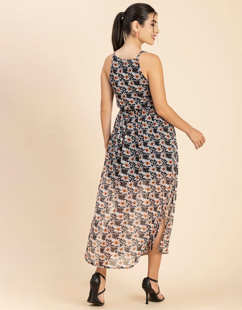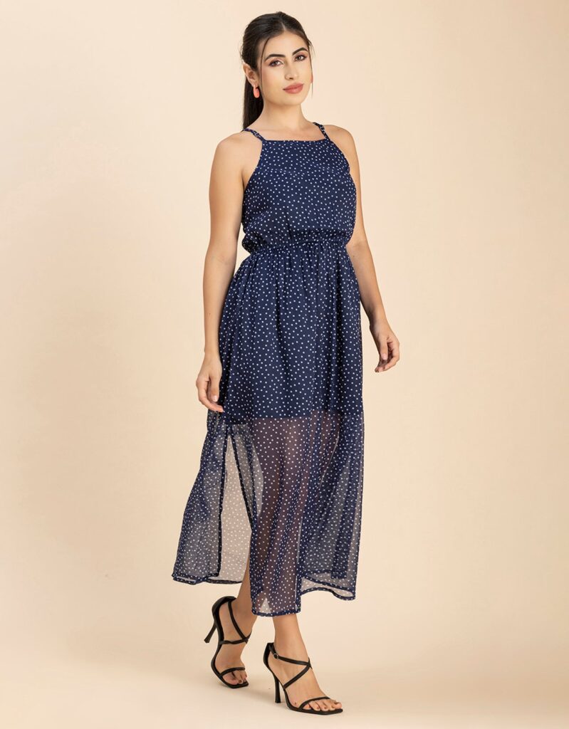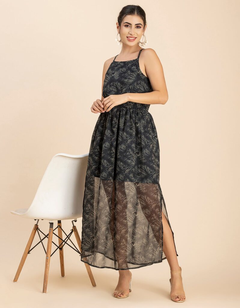 Features: Strap Shoulders, Square Neck, Elastic Waist, Calf Length, Lightweight And All Over Printed Pattern
