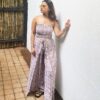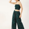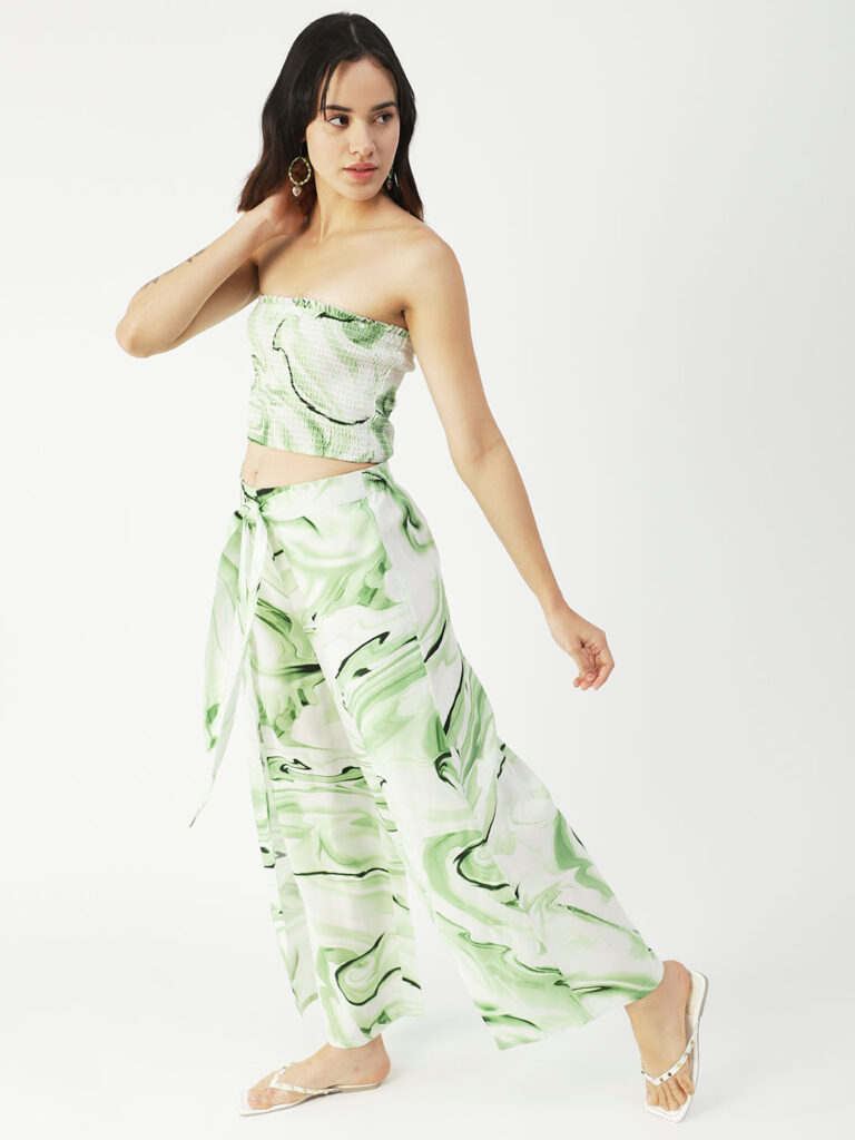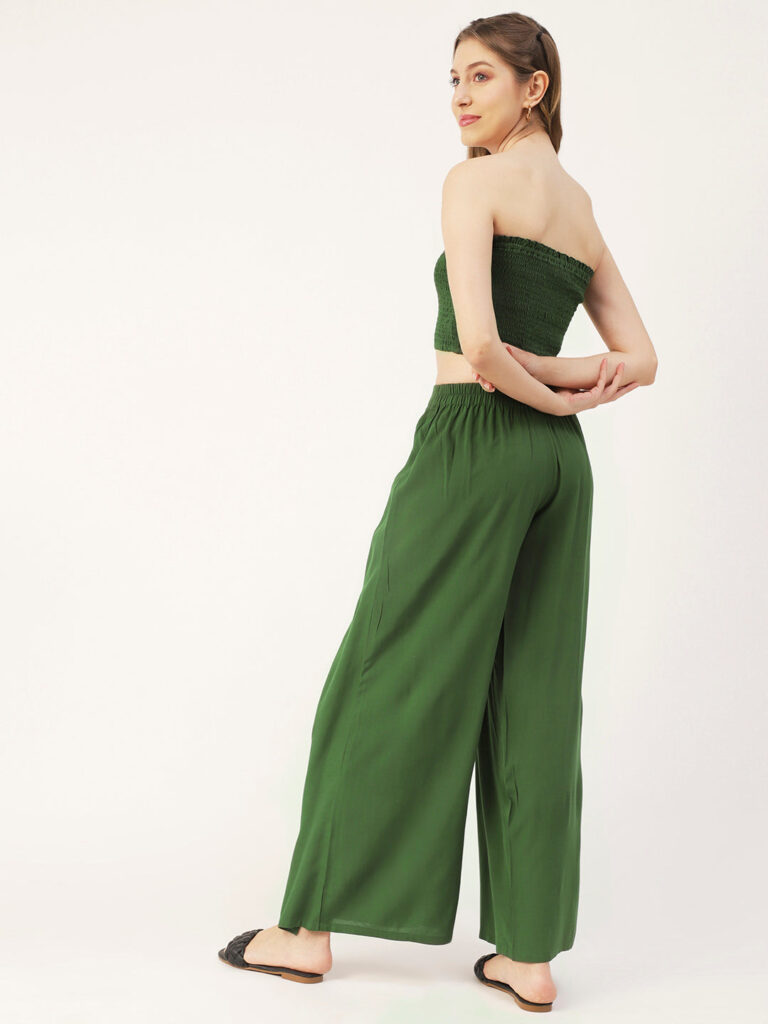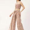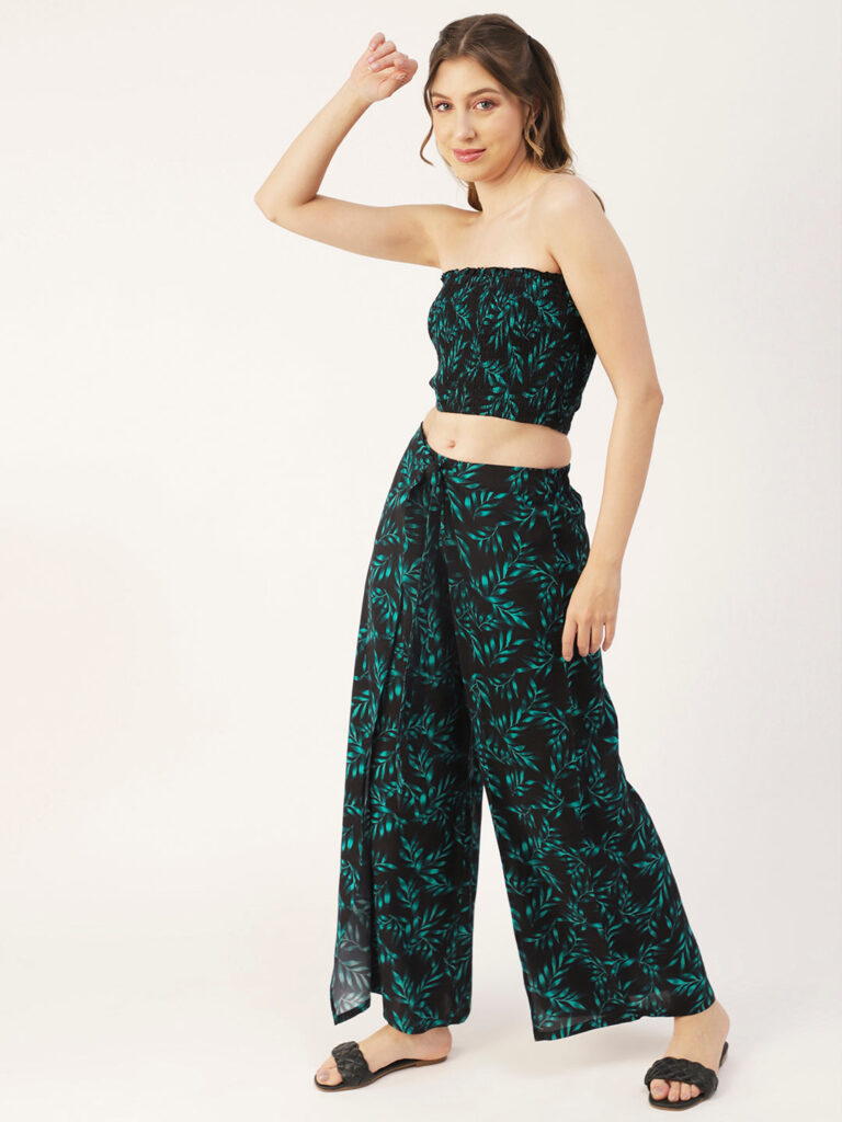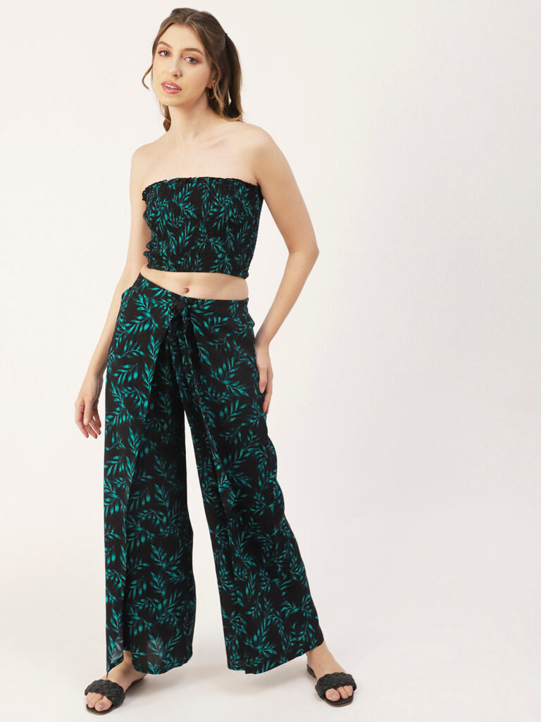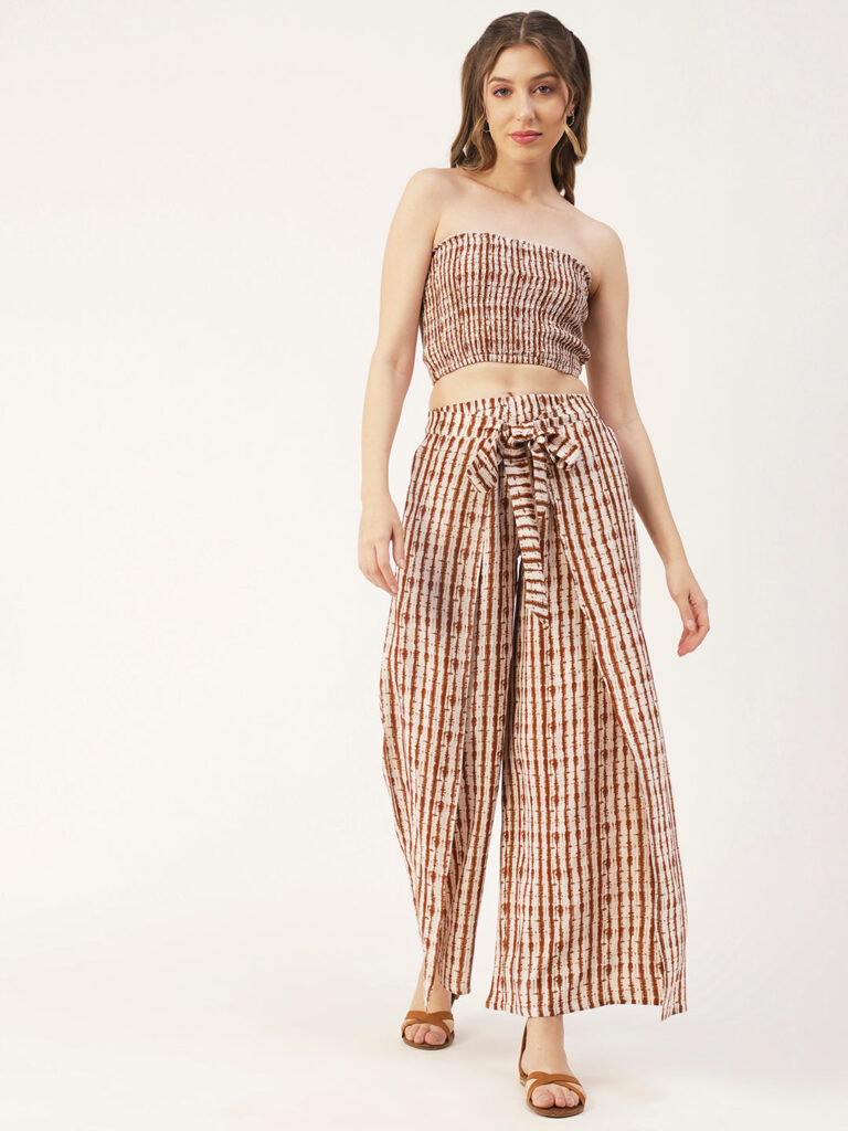 Features: sleeveless, smocked pattern, crop top, ankle length palazzo, tie-up waist, lightweight and all over Solid pattern