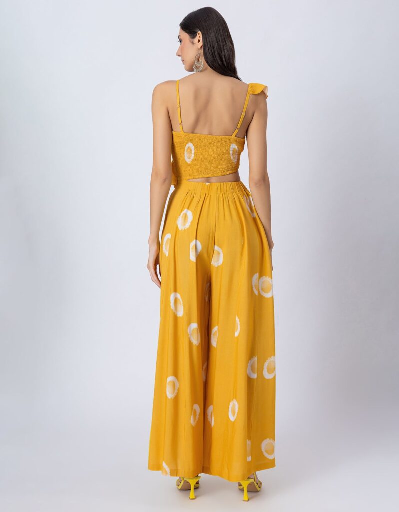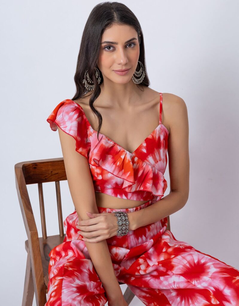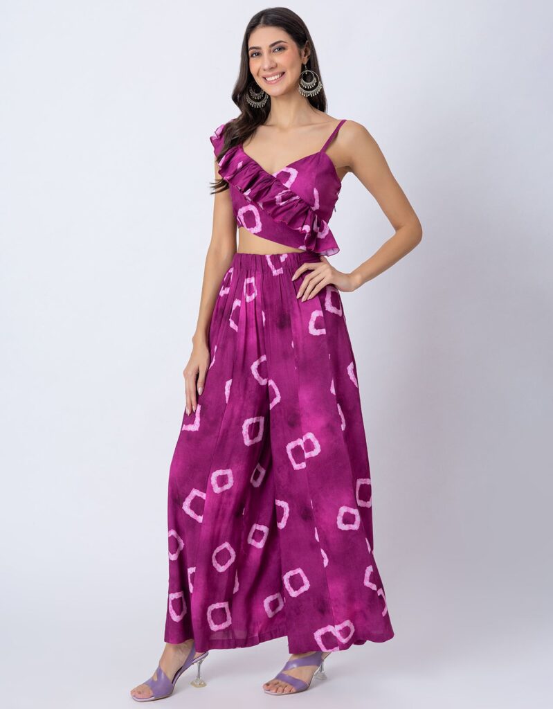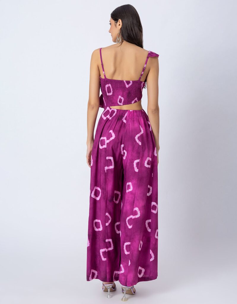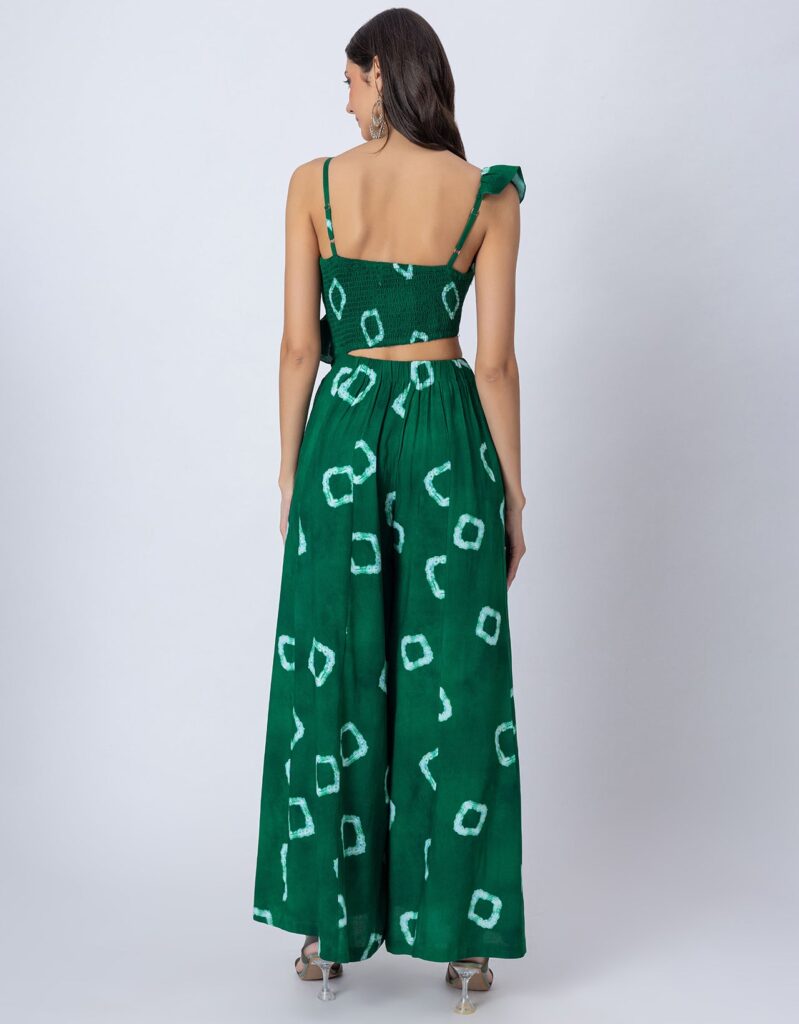Features: This Indo-Western Tie-Dye Print Jumpsuit features a sleeveless design with a smocked back, frill details on the yoke, a cutout pattern, concealed zipper closure, and flared wide legs, making it an ideal party wear outfit.