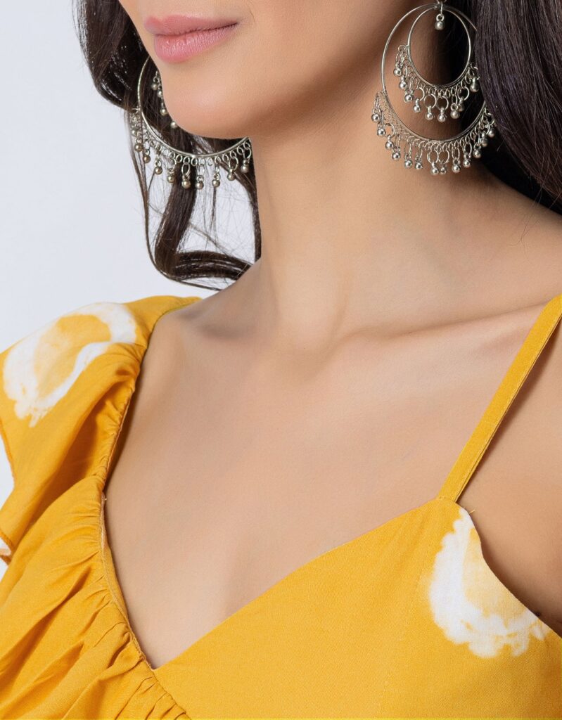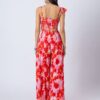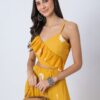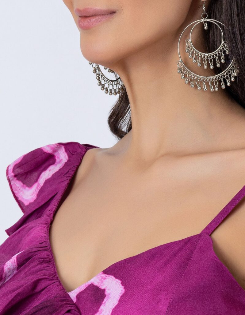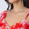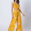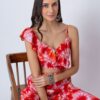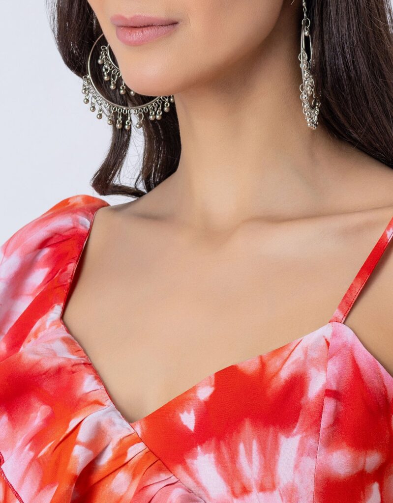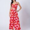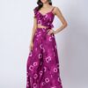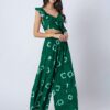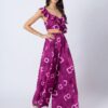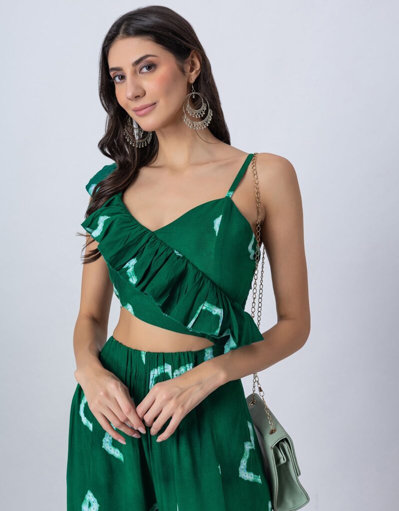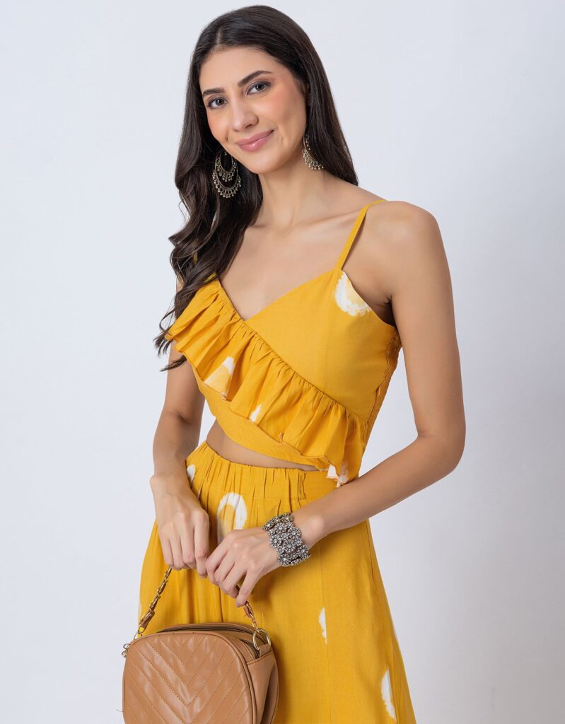 Features: This Indo-Western Tie-Dye Print Jumpsuit features a sleeveless design with a smocked back, frill details on the yoke, a cutout pattern, concealed zipper closure, and flared wide legs, making it an ideal party wear outfit.