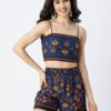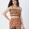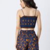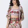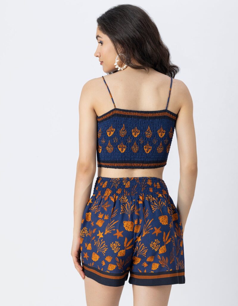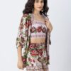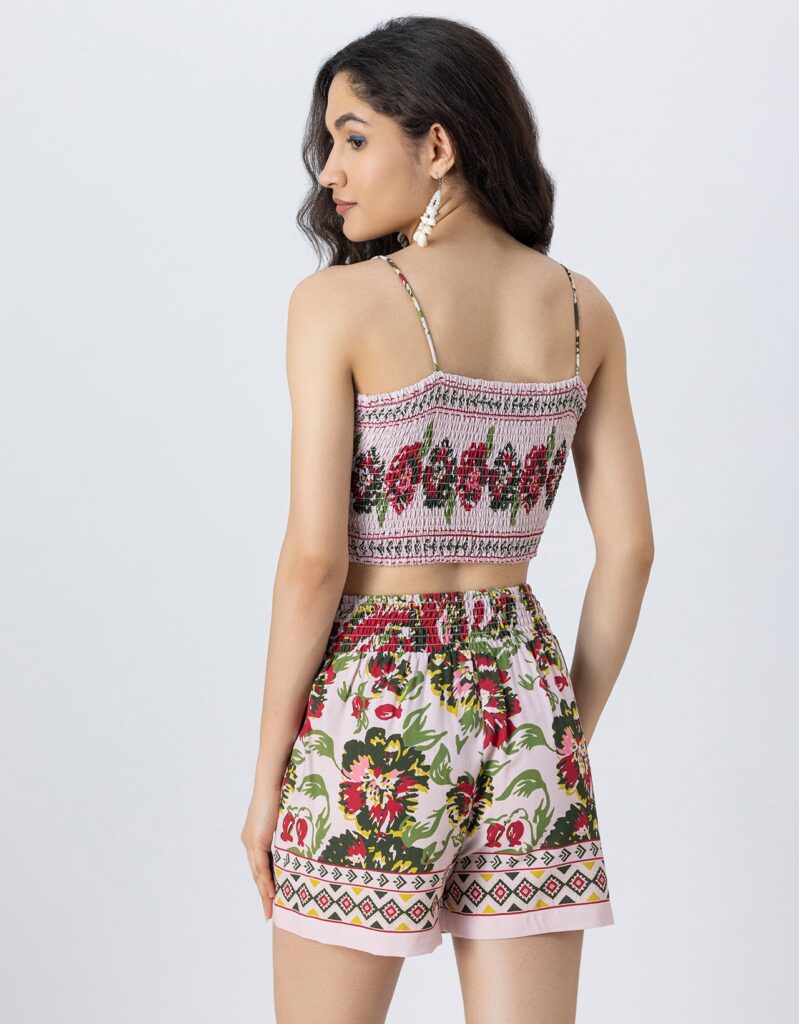 Features: Spaghetti Strap Crop Top With Smocked Back, Elastic Waist Shorts That Includes 2 Pockets, Matched With Shrug Coverup, Lightweight, Regular Fit, All Over Printed Pattern.
