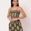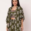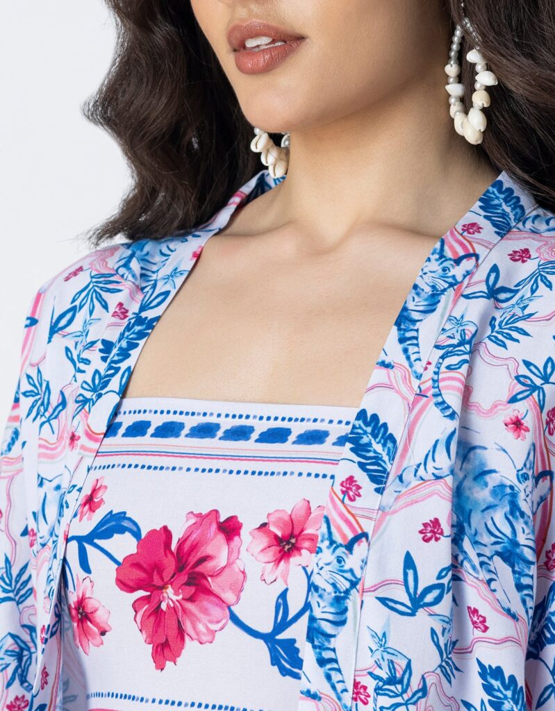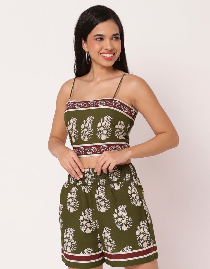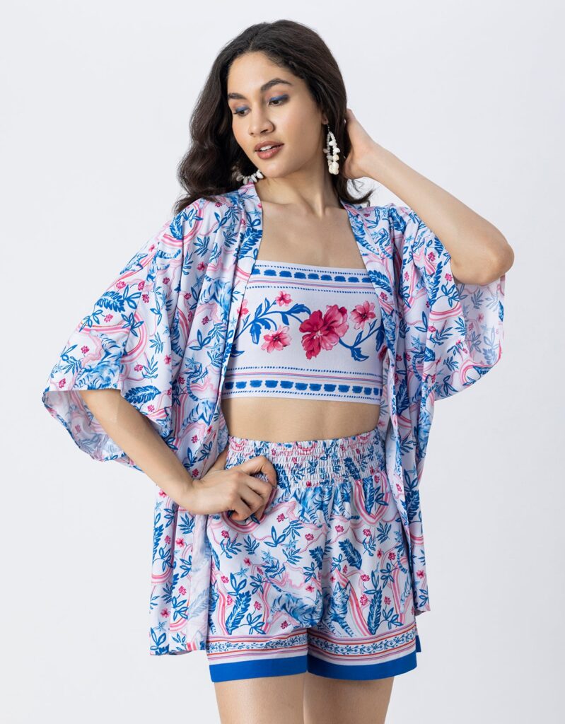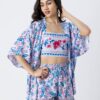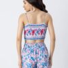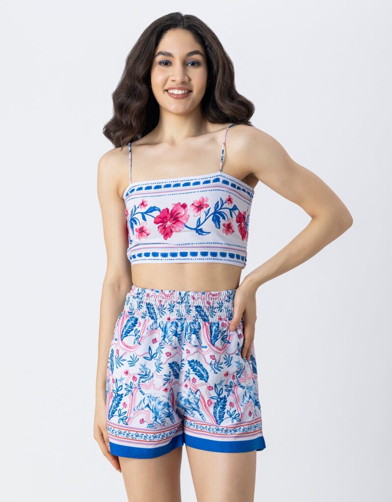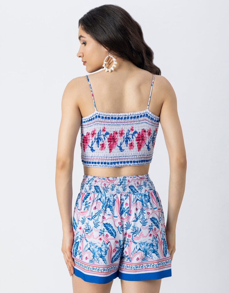Features: Spaghetti strap crop top with smocked back, elastic waist shorts that includes 2 pockets, matched with shrug coverup, lightweight, regular fit, all over printed pattern.