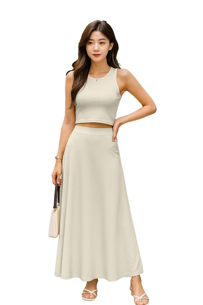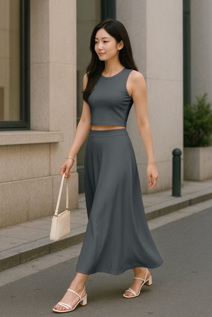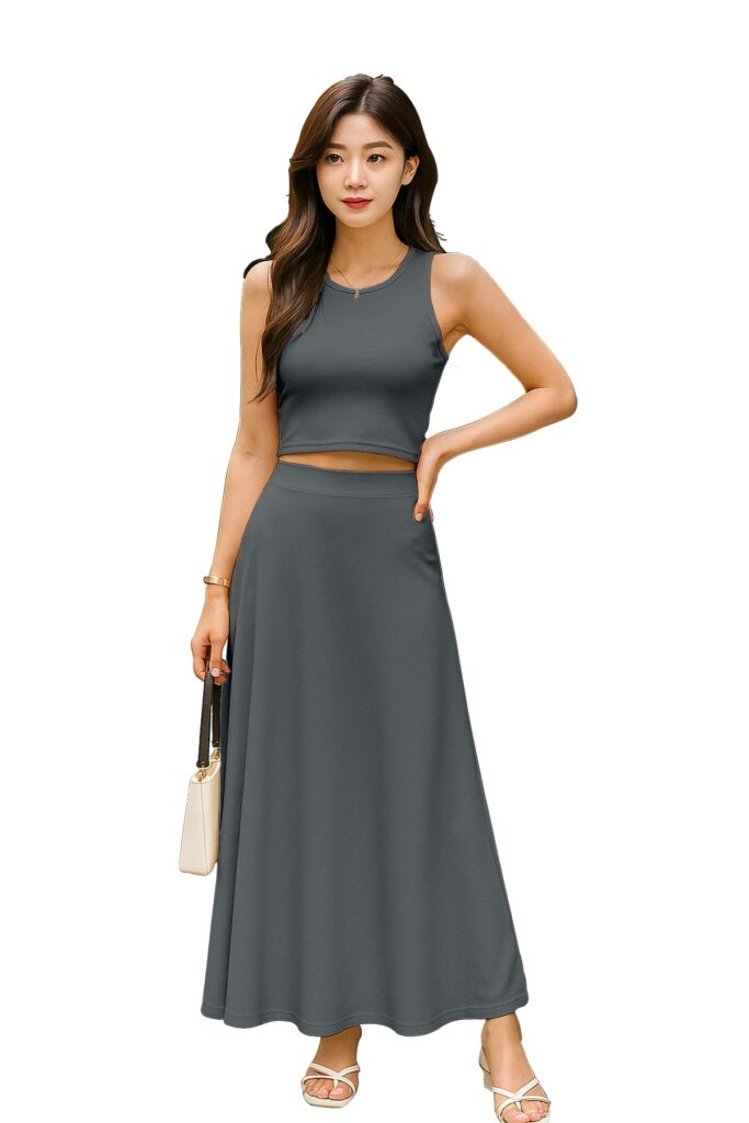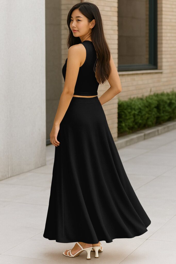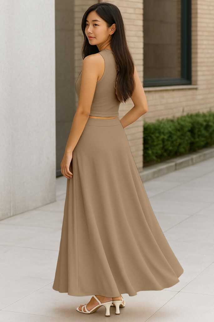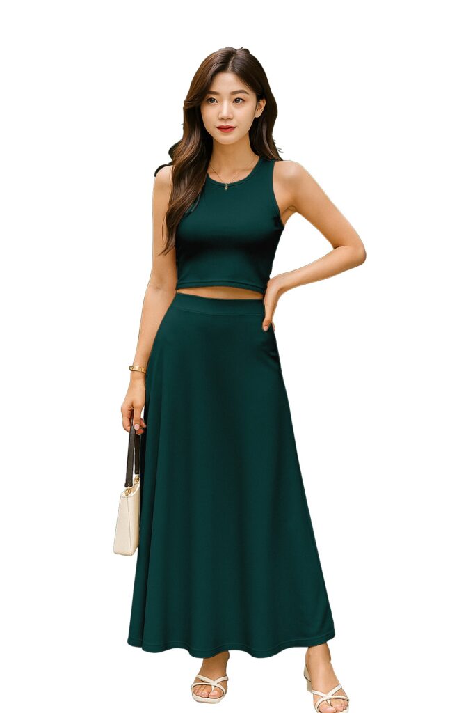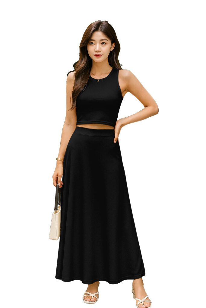 Chic Cropped Tank Top: The minimalist crop top balances the full-length skirt perfectly, creating an effortlessly feminine silhouette.