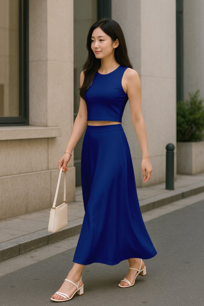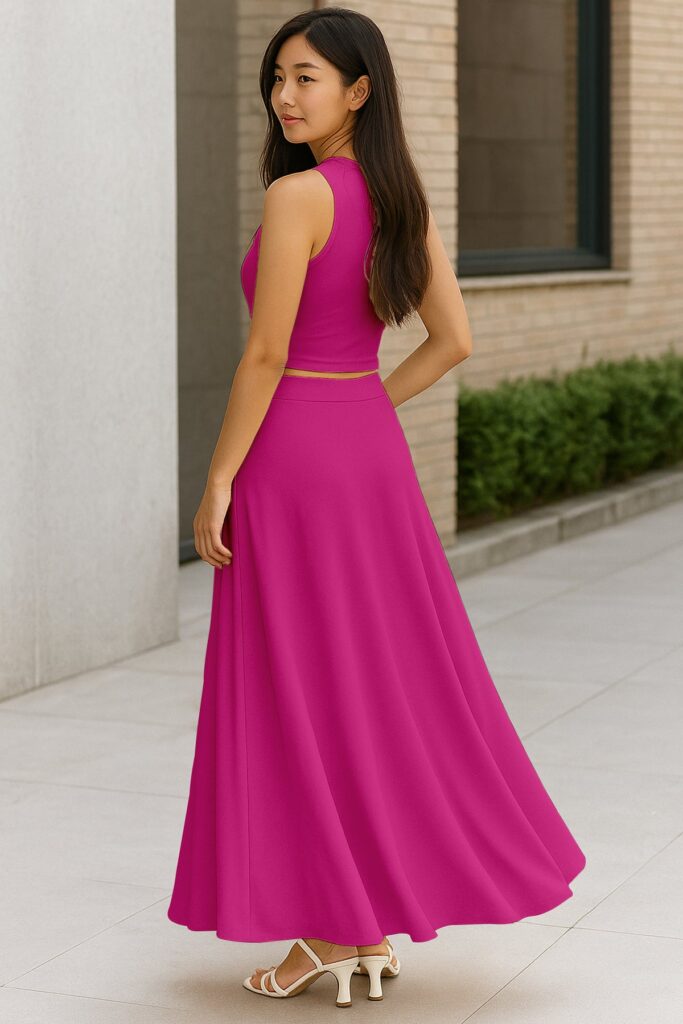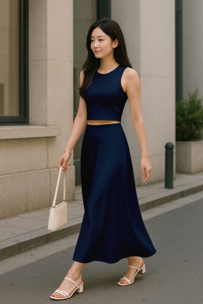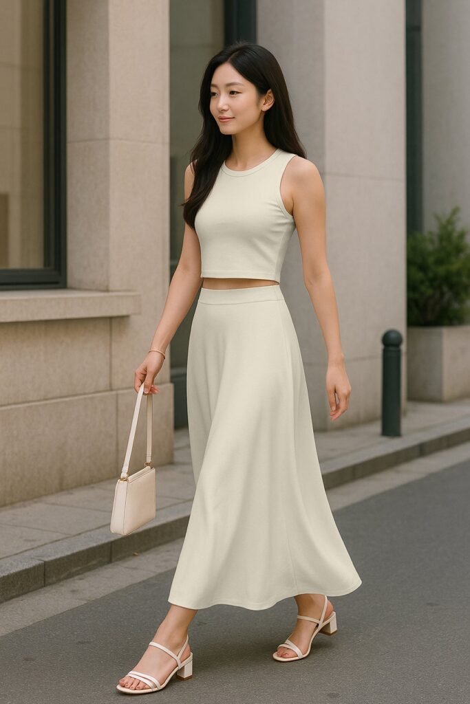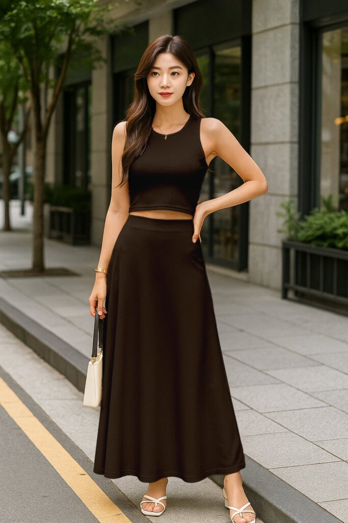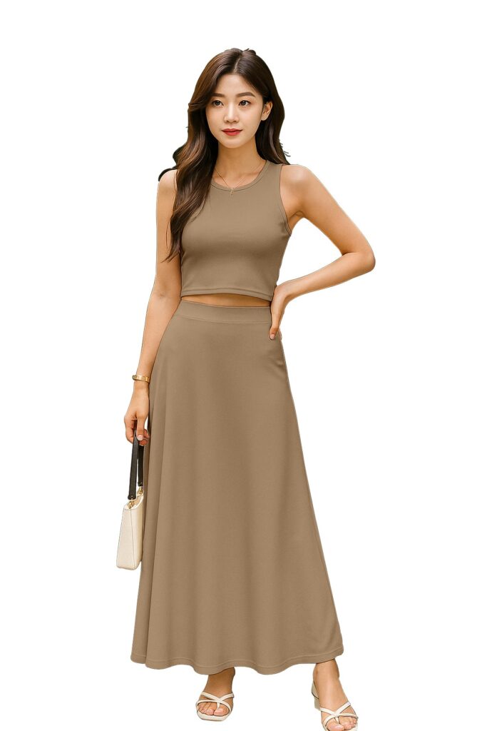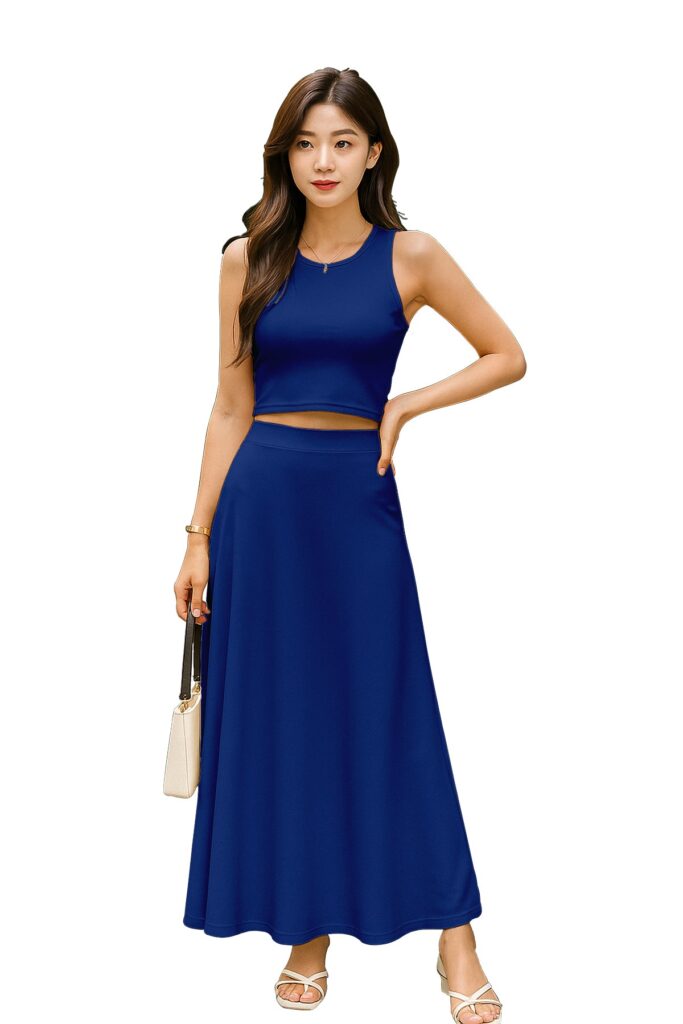 Chic Cropped Tank Top: The minimalist crop top balances the full-length skirt perfectly, creating an effortlessly feminine silhouette.
