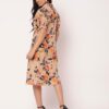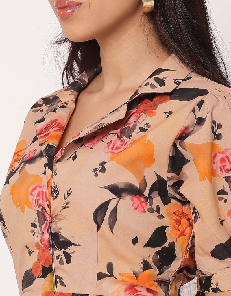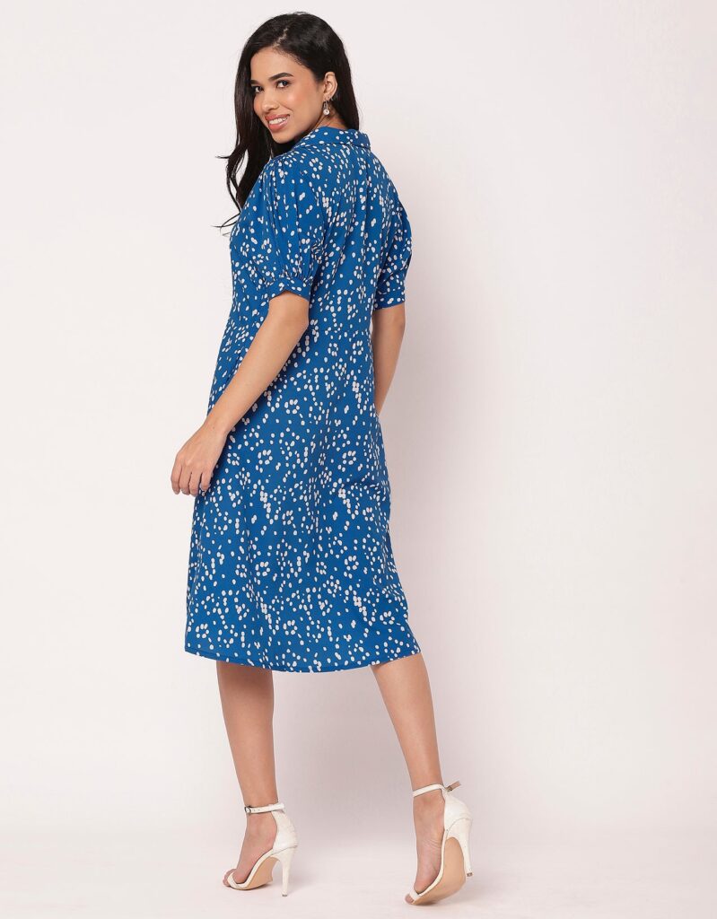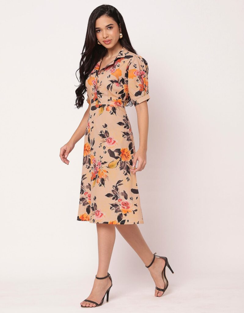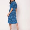 Features: Side pockets, puffed sleeves, lapel collared neck, flared hem, knee length, lightweight and all over printed pattern